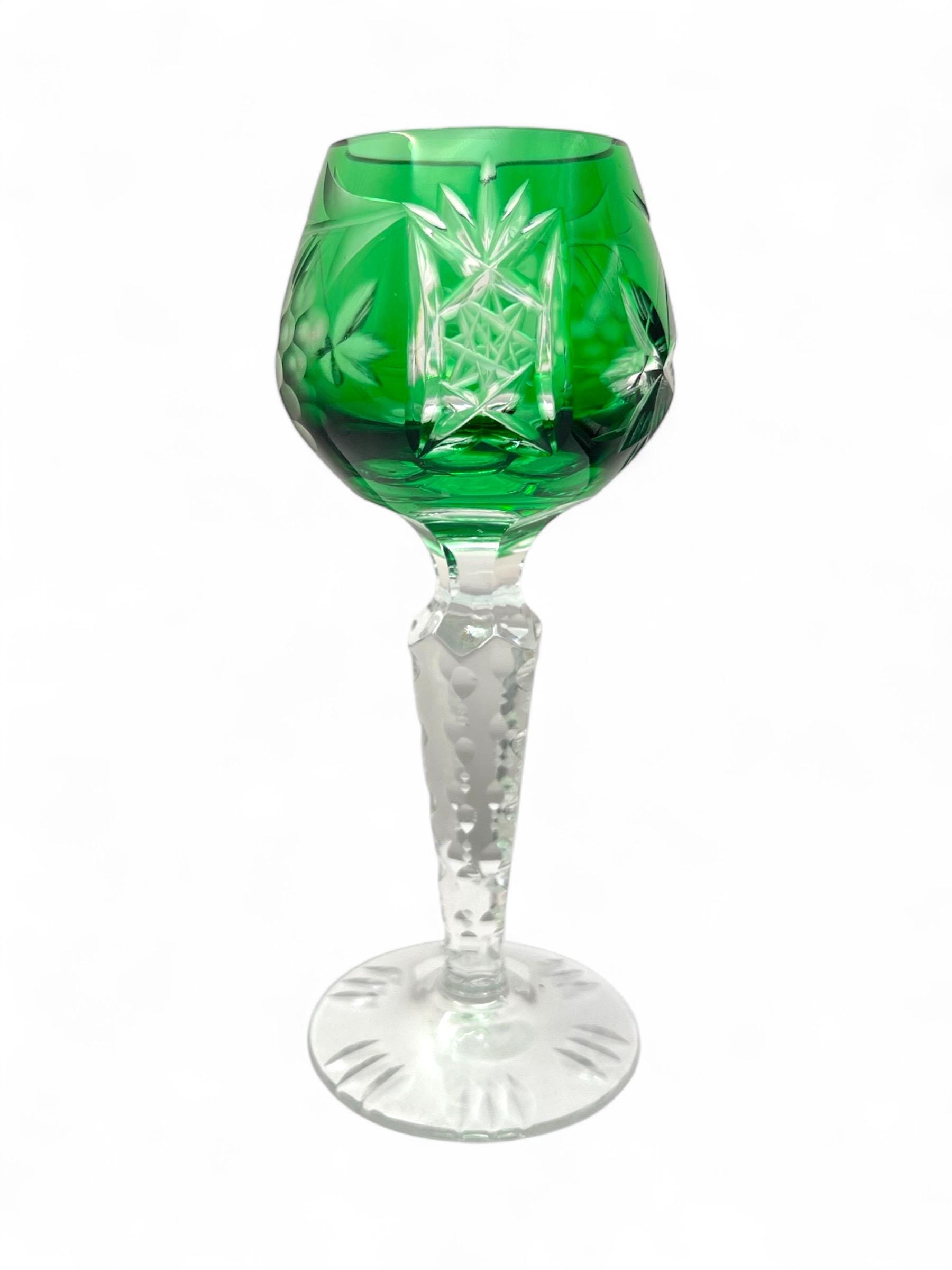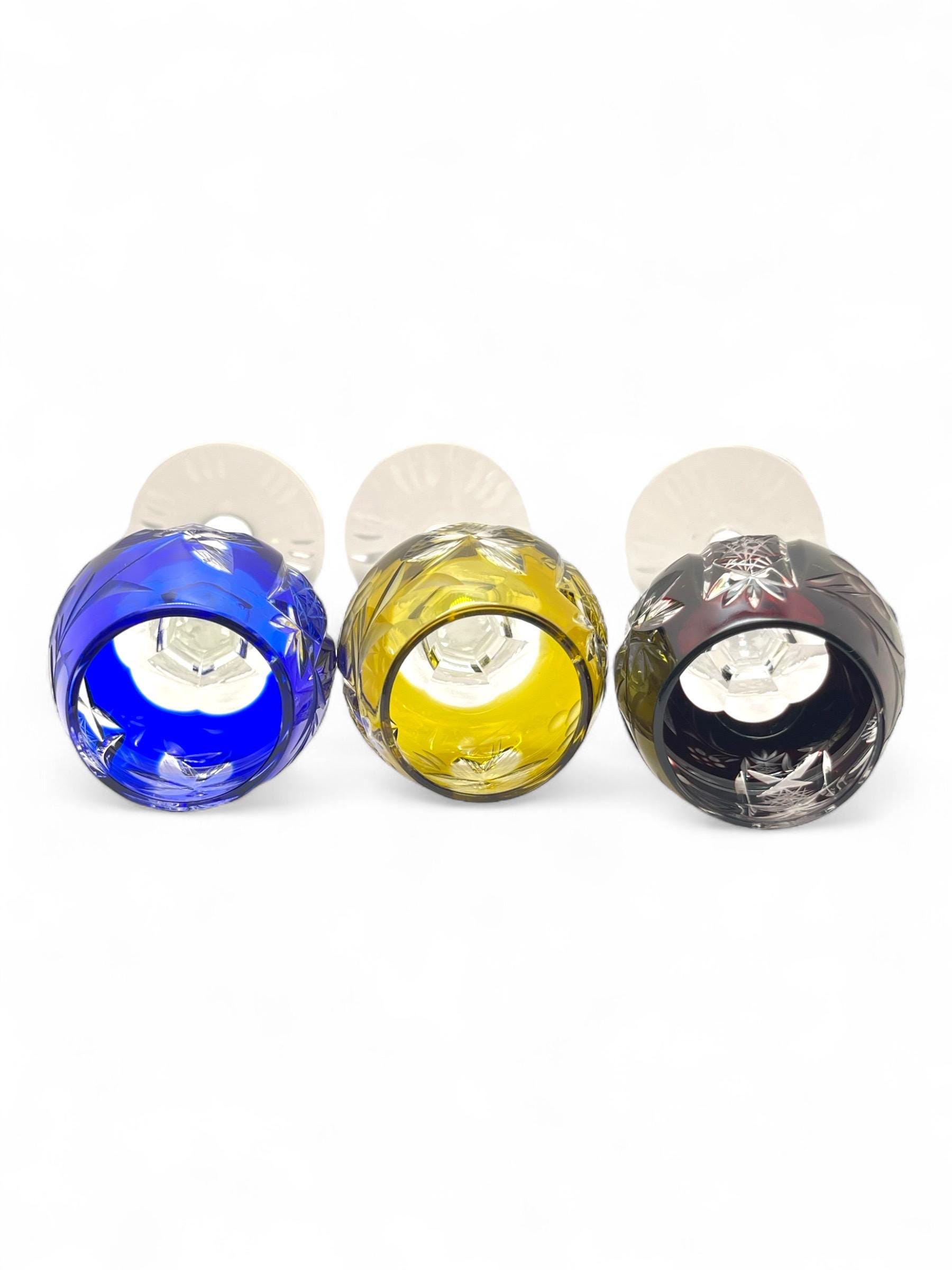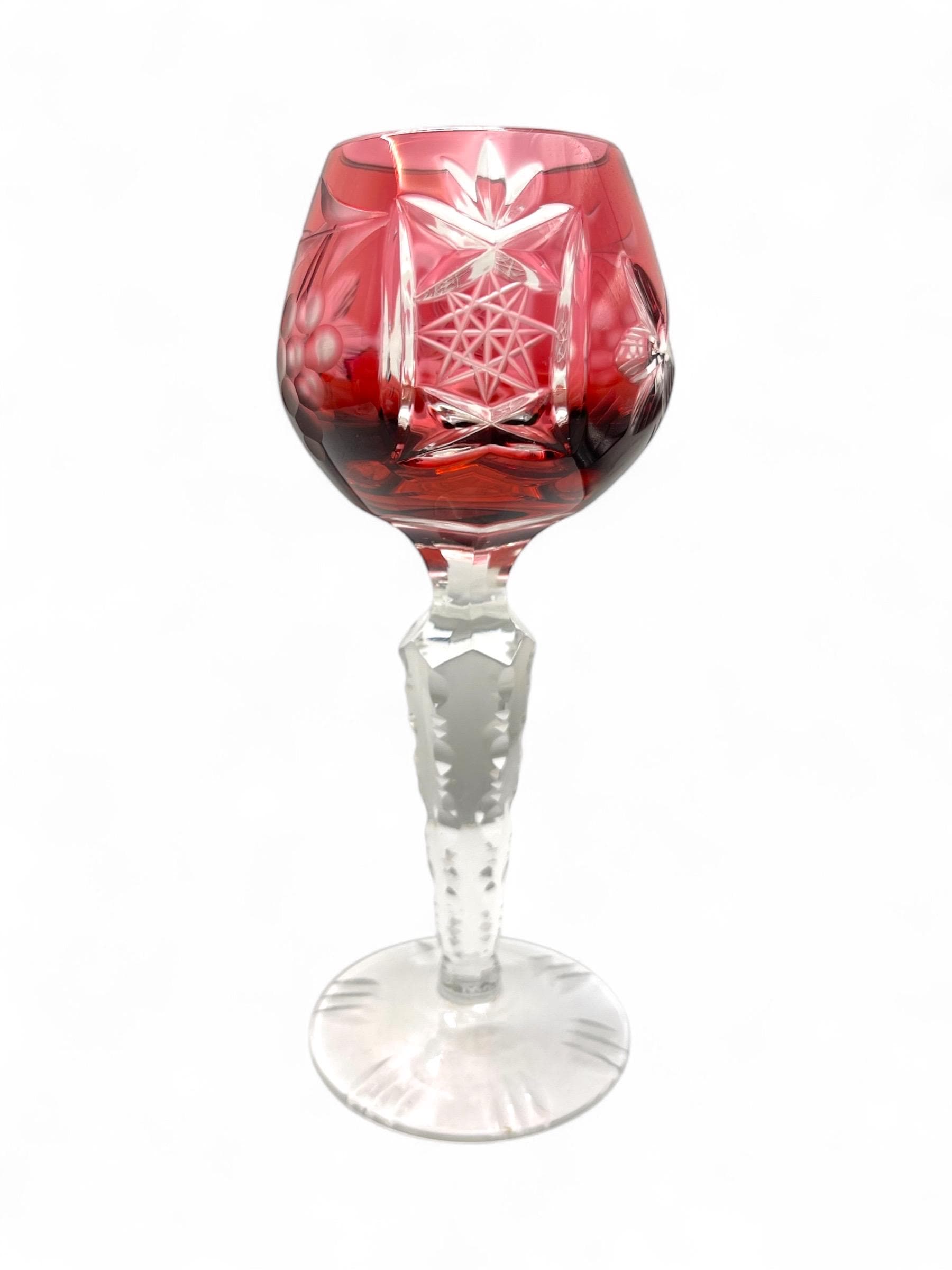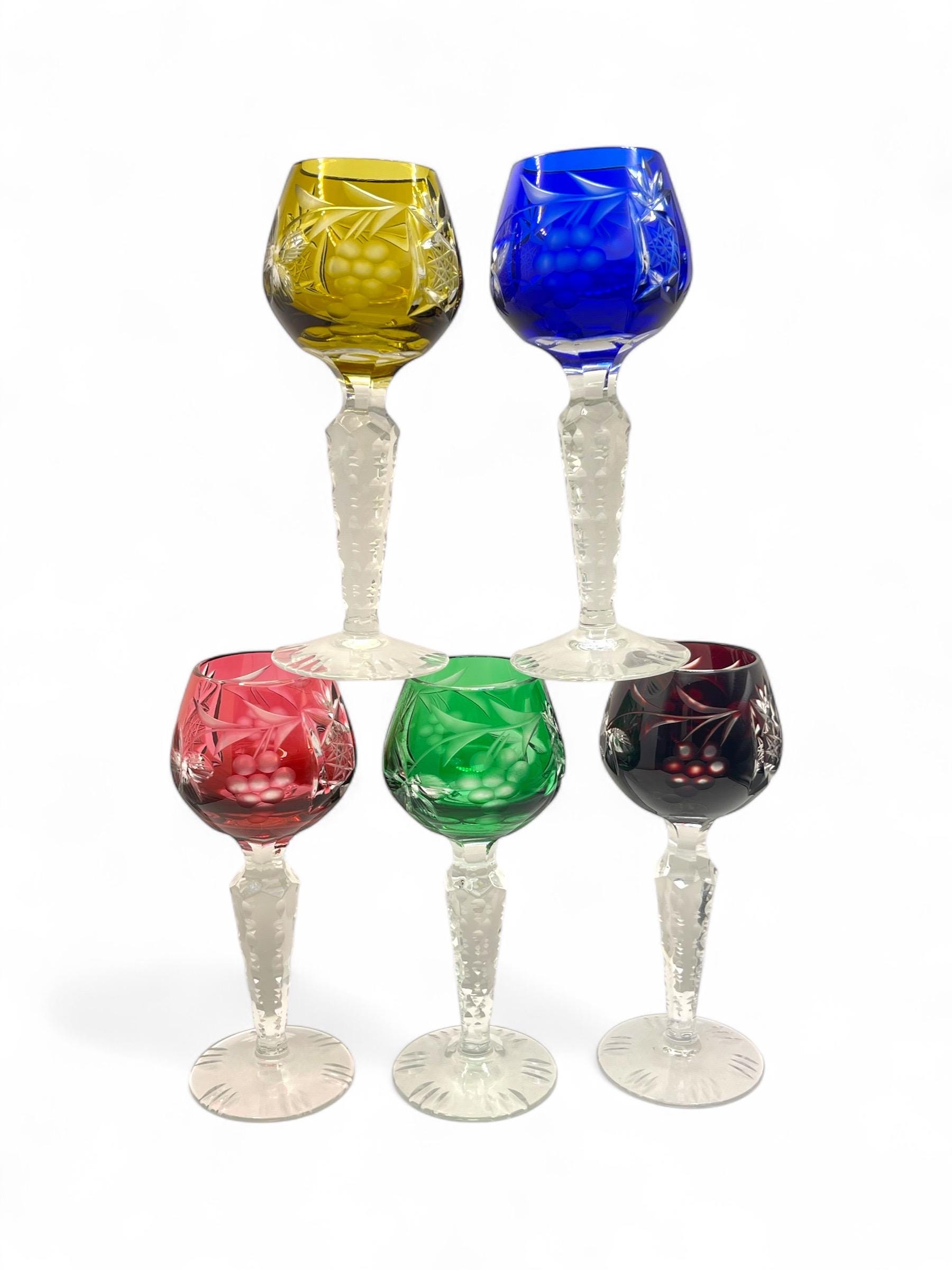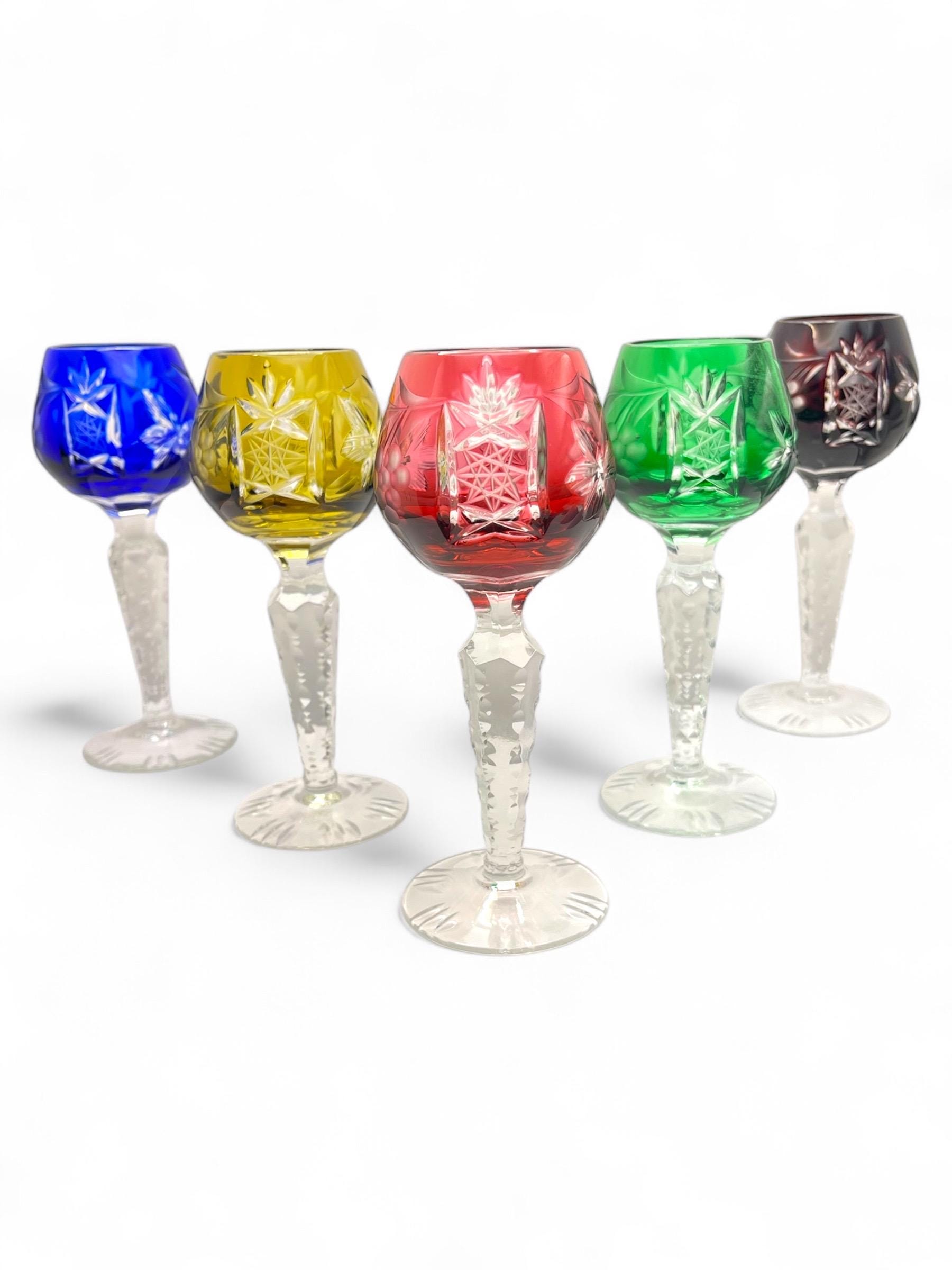 We are pleased to present these German vintage hand cut crystal liqueur glasses, each featuring a deep bowl with detailed starburst and leaf engravings, set atop a tall faceted stem with a sculptural foot. The rich jewel-tone colors include cobalt blue, wine red, emerald green, amber yellow, and ruby pink — all beautifully contrasted with the clear base.