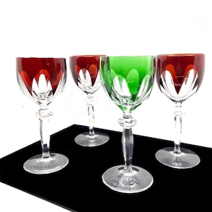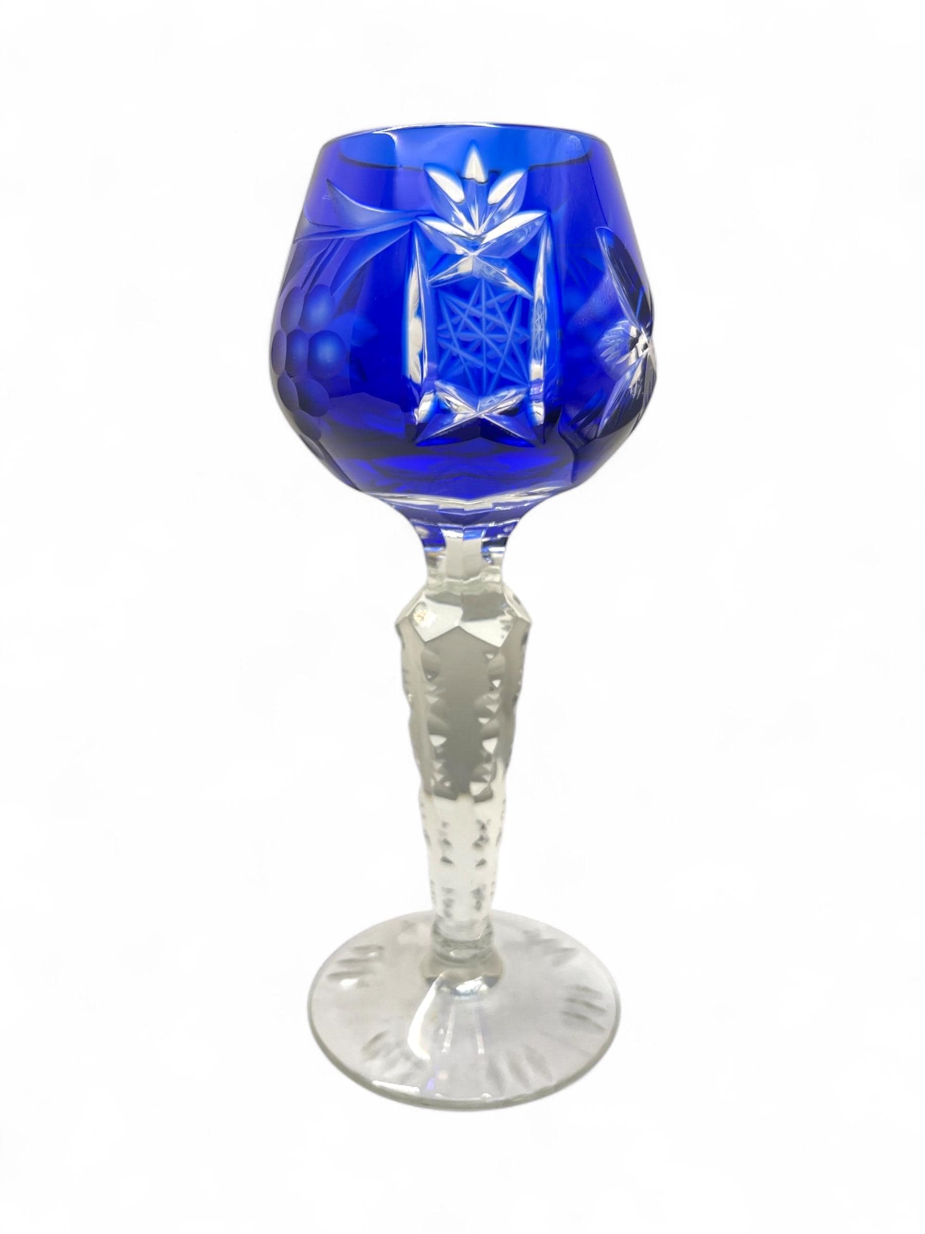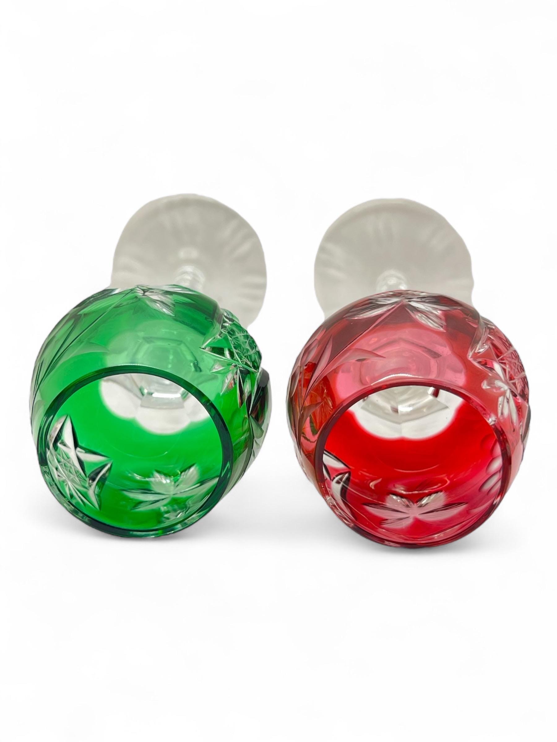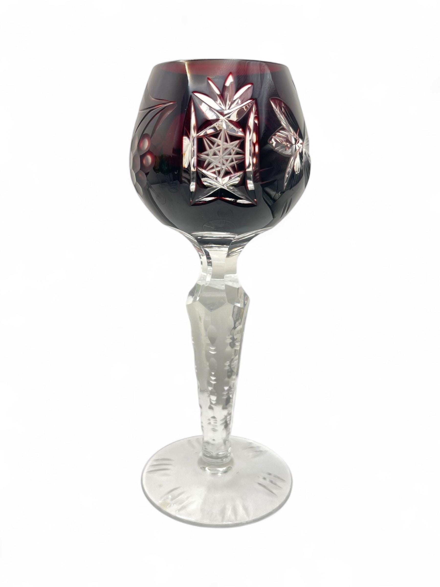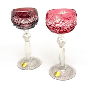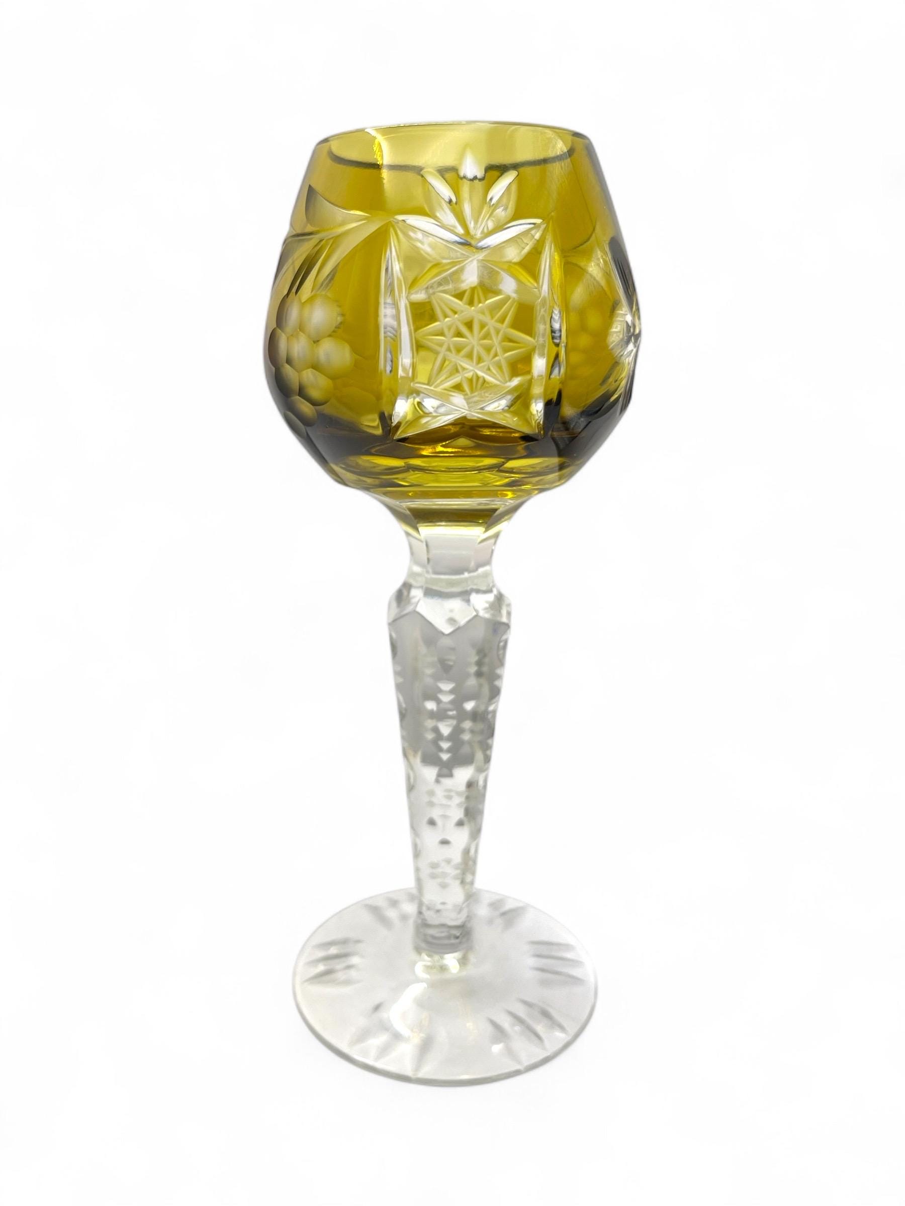 We are pleased to present these German vintage hand cut crystal liqueur glasses, each featuring a deep bowl with detailed starburst and leaf engravings, set atop a tall faceted stem with a sculptural foot. The rich jewel-tone colors include cobalt blue, wine red, emerald green, amber yellow, and ruby pink — all beautifully contrasted with the clear base.