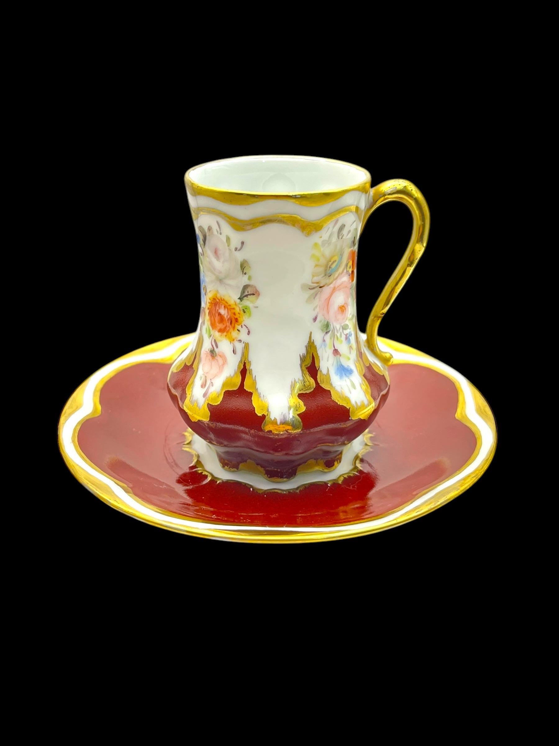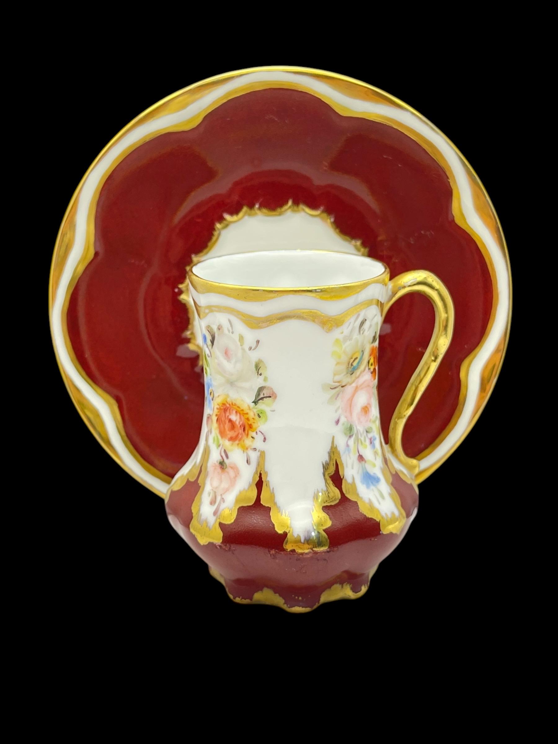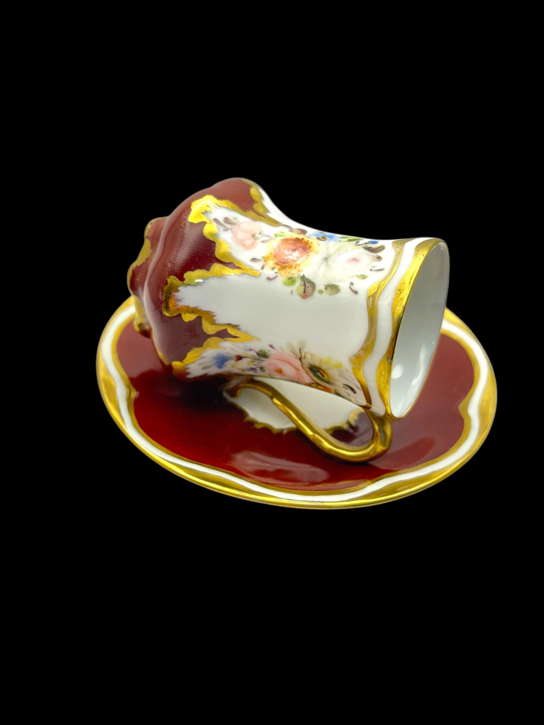 The cup features a beautifully contoured silhouette, adorned with floral motifs in soft pastel tones framed by a rich deep burgundy ground and luxurious gold accents. The scalloped saucer mirrors the opulence with matching decoration, creating a harmonious ensemble that radiates Belle Époque charm.