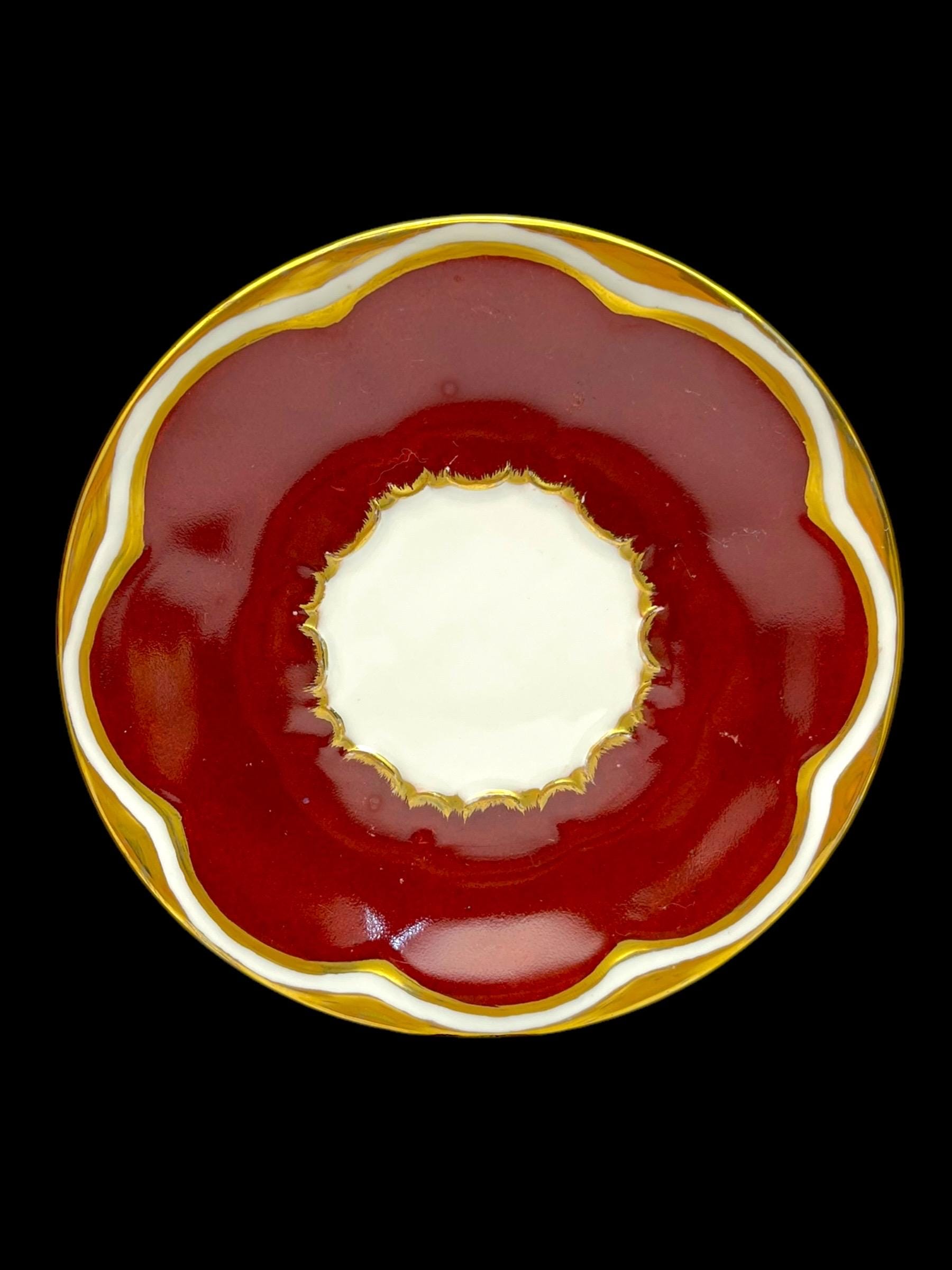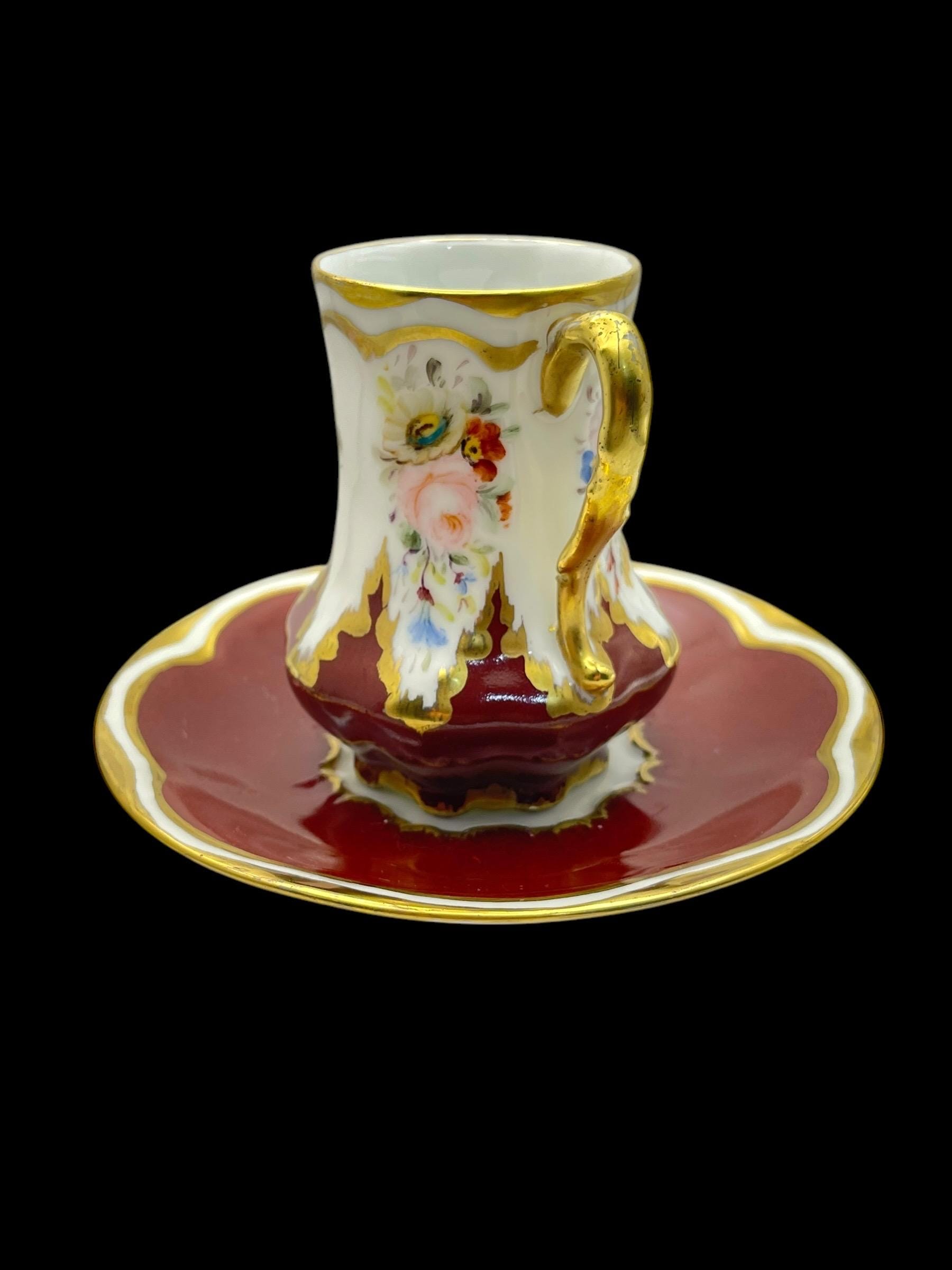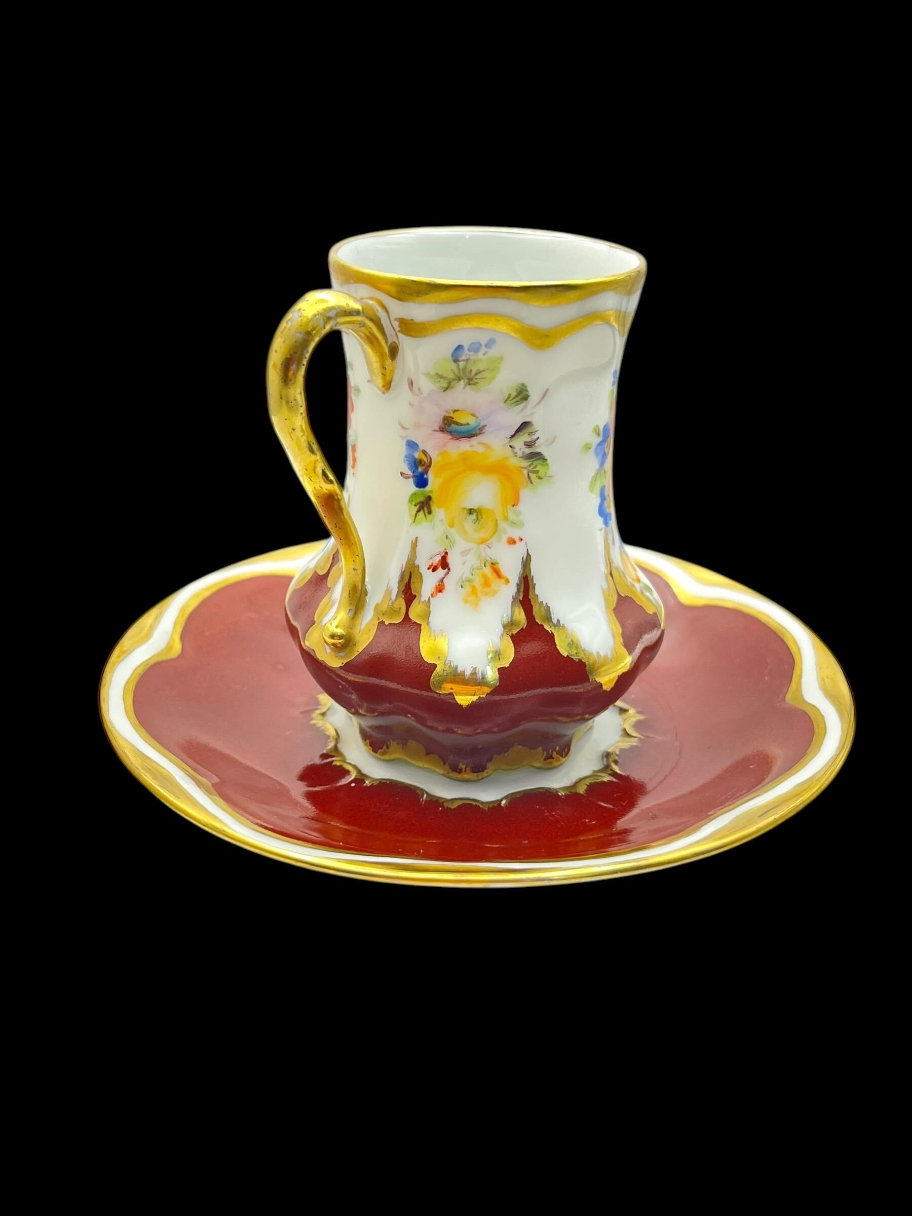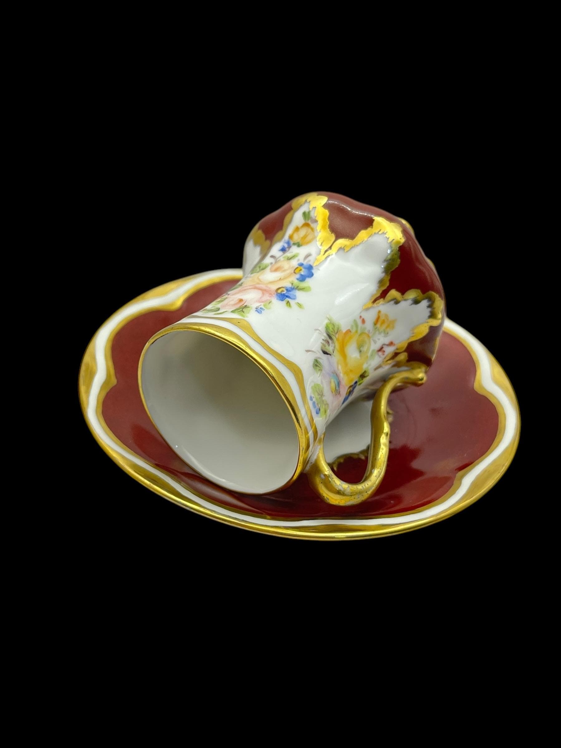 The cup features a beautifully contoured silhouette, adorned with floral motifs in soft pastel tones framed by a rich deep burgundy ground and luxurious gold accents. The scalloped saucer mirrors the opulence with matching decoration, creating a harmonious ensemble that radiates Belle Époque charm.