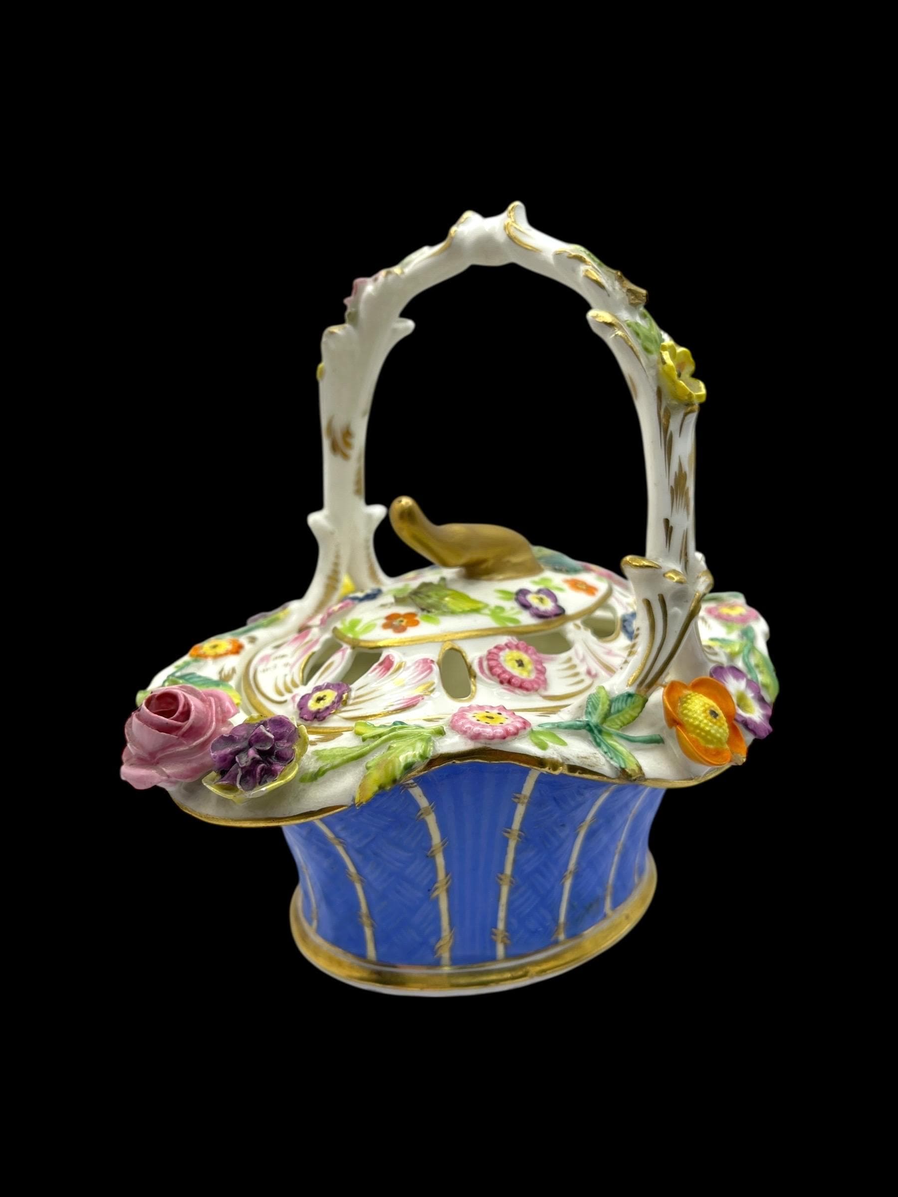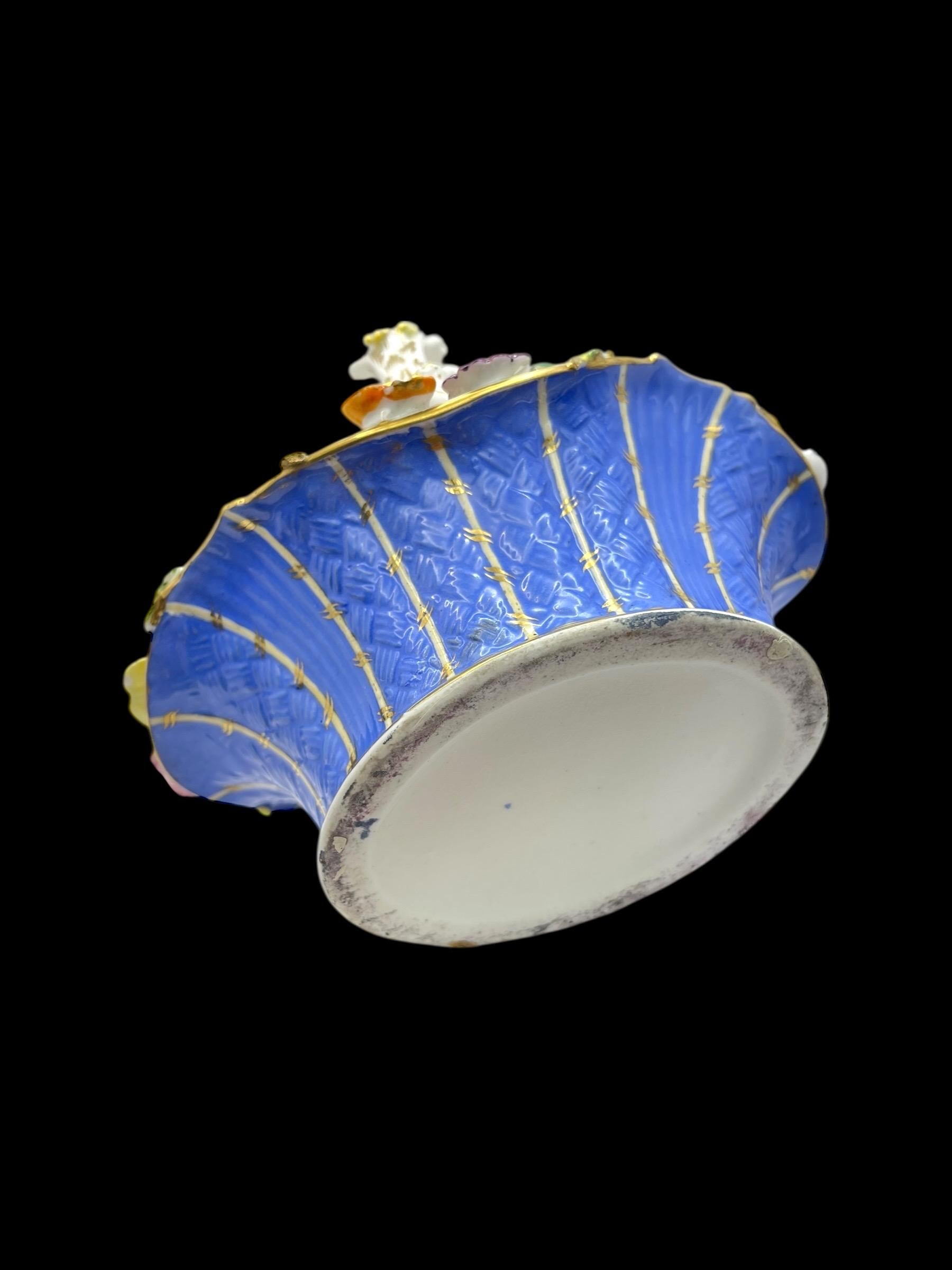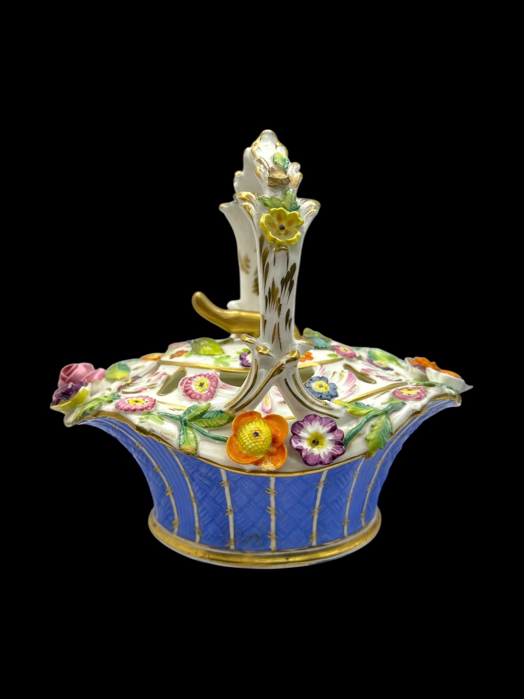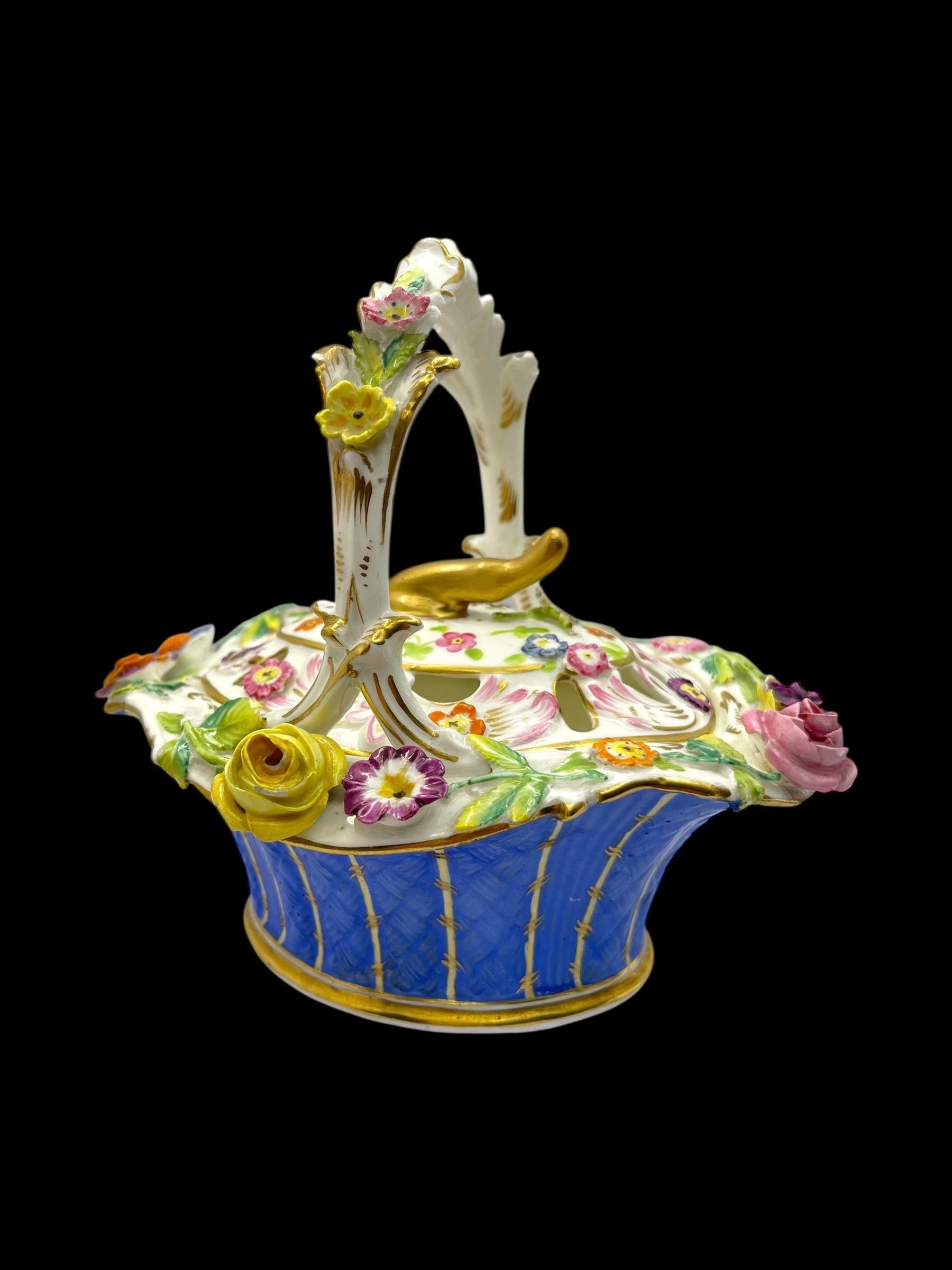 A charming and highly collectible 19th-century Coalbrookdale porcelain flower basket, crafted in England and richly decorated with delicate, hand-modeled flowers in vibrant hues. The basket features a beautifully sculpted openwork lid, a lavishly gilded handle entwined with blossoms, and a striking cobalt blue base textured to resemble woven wicker.
