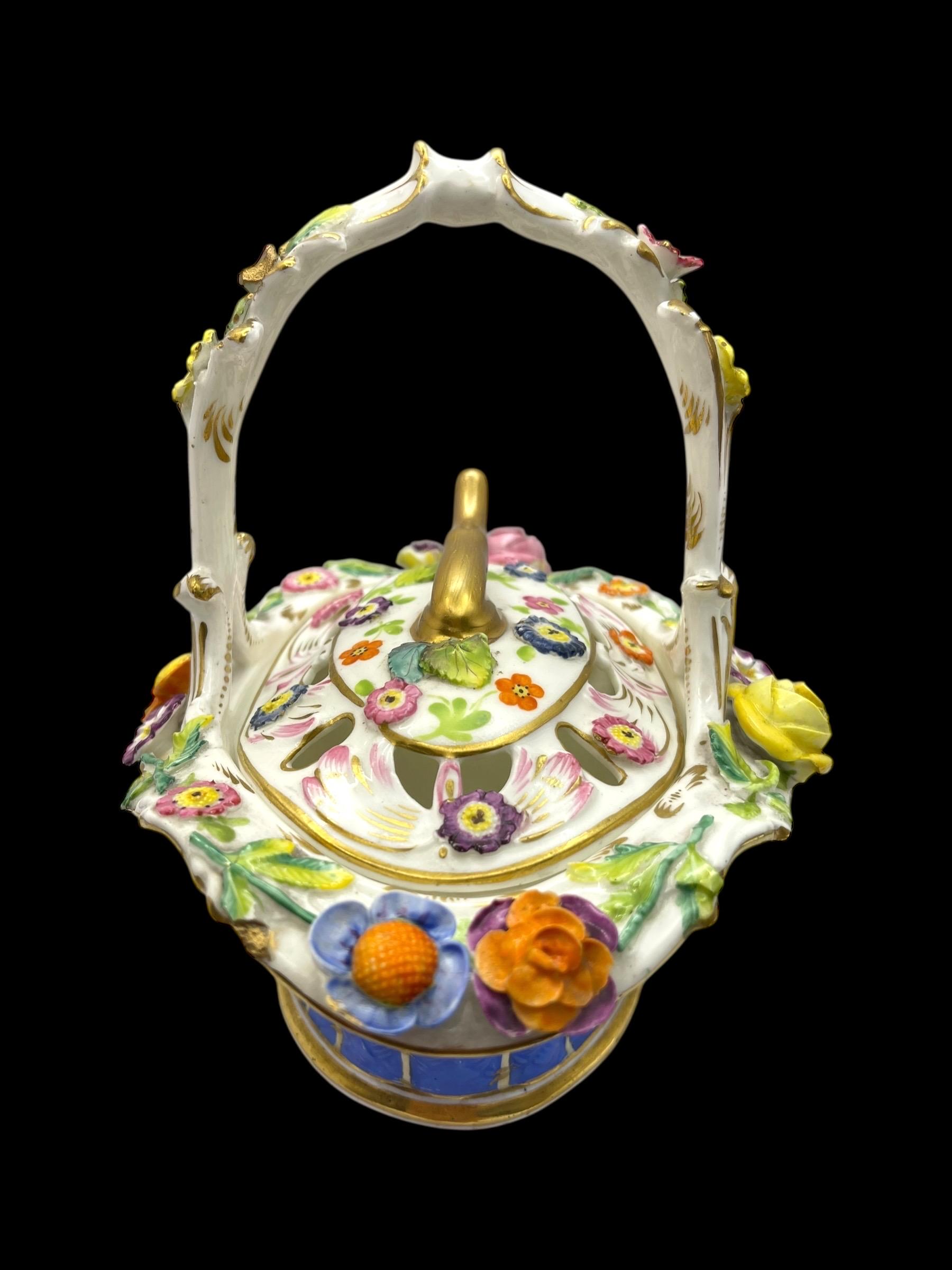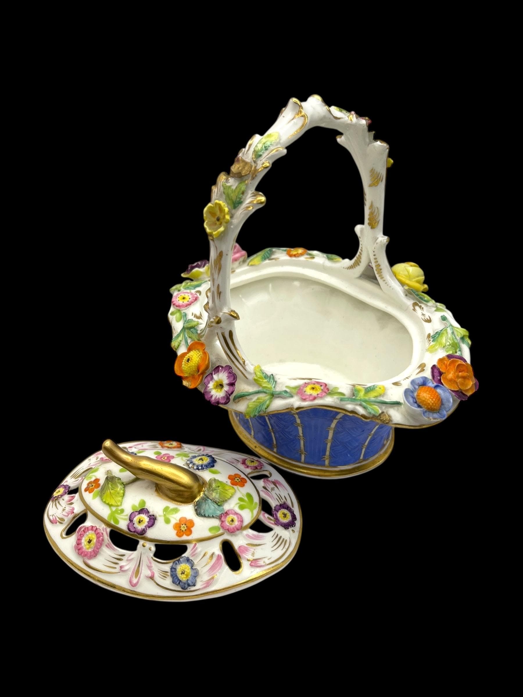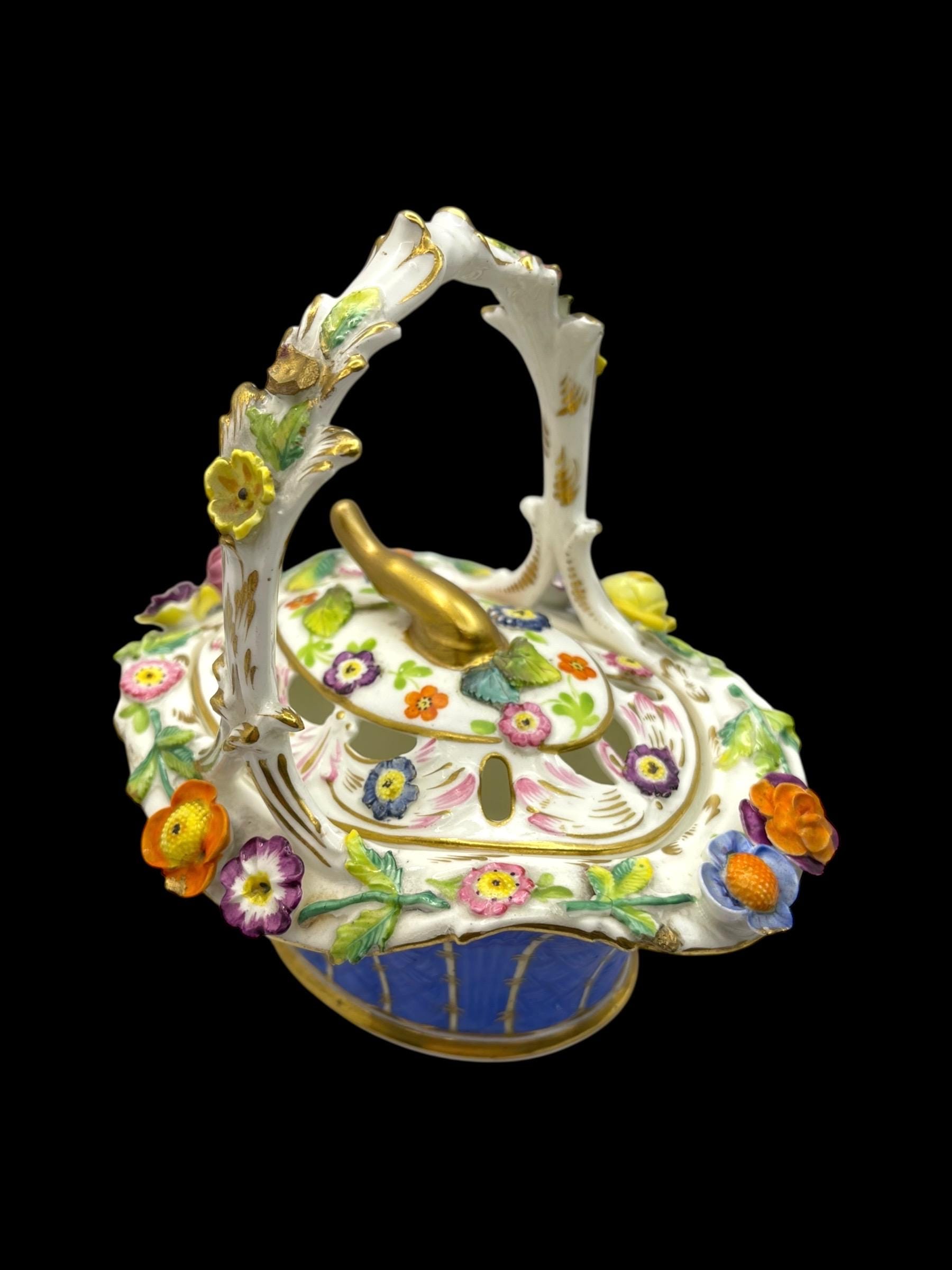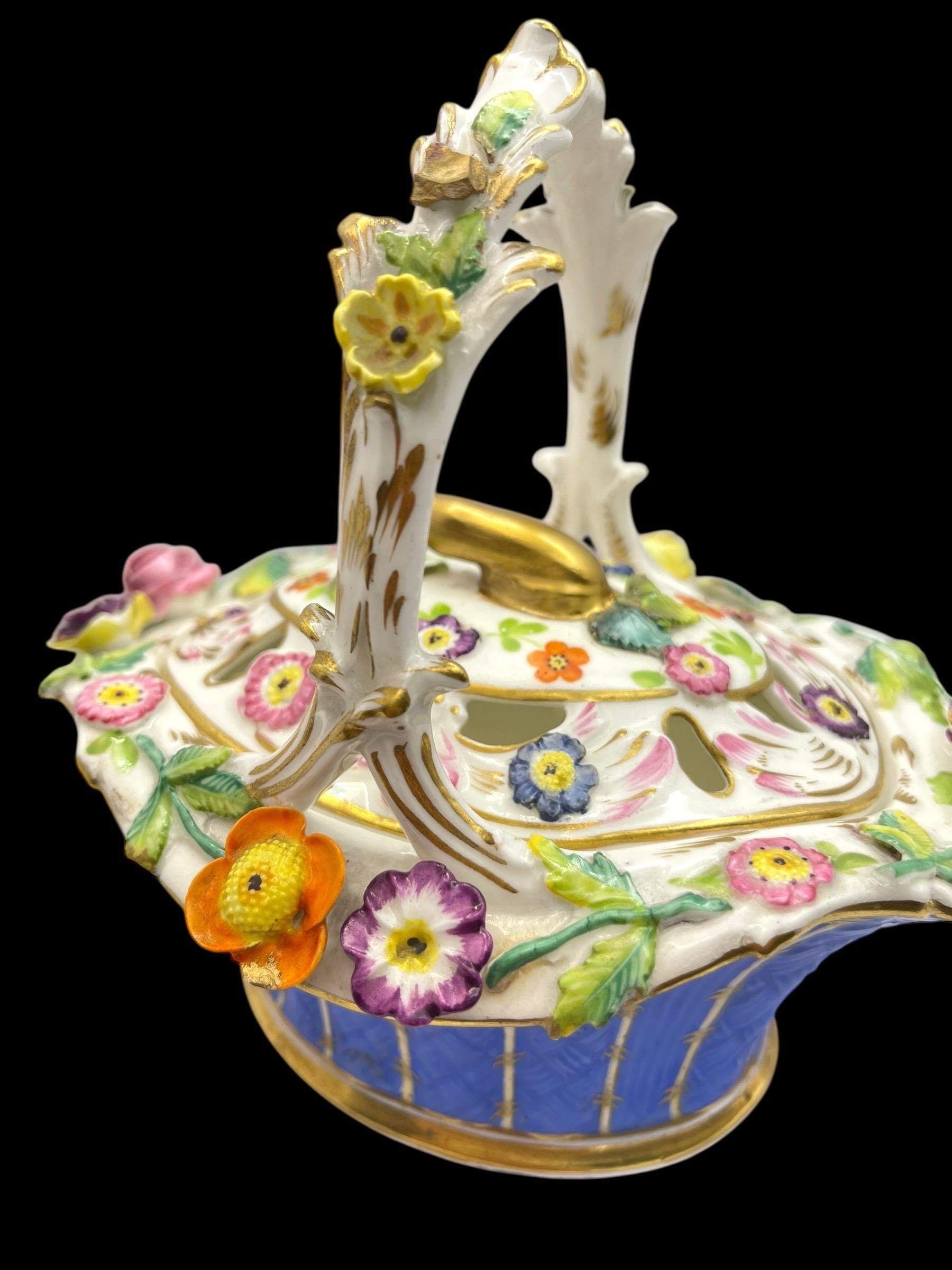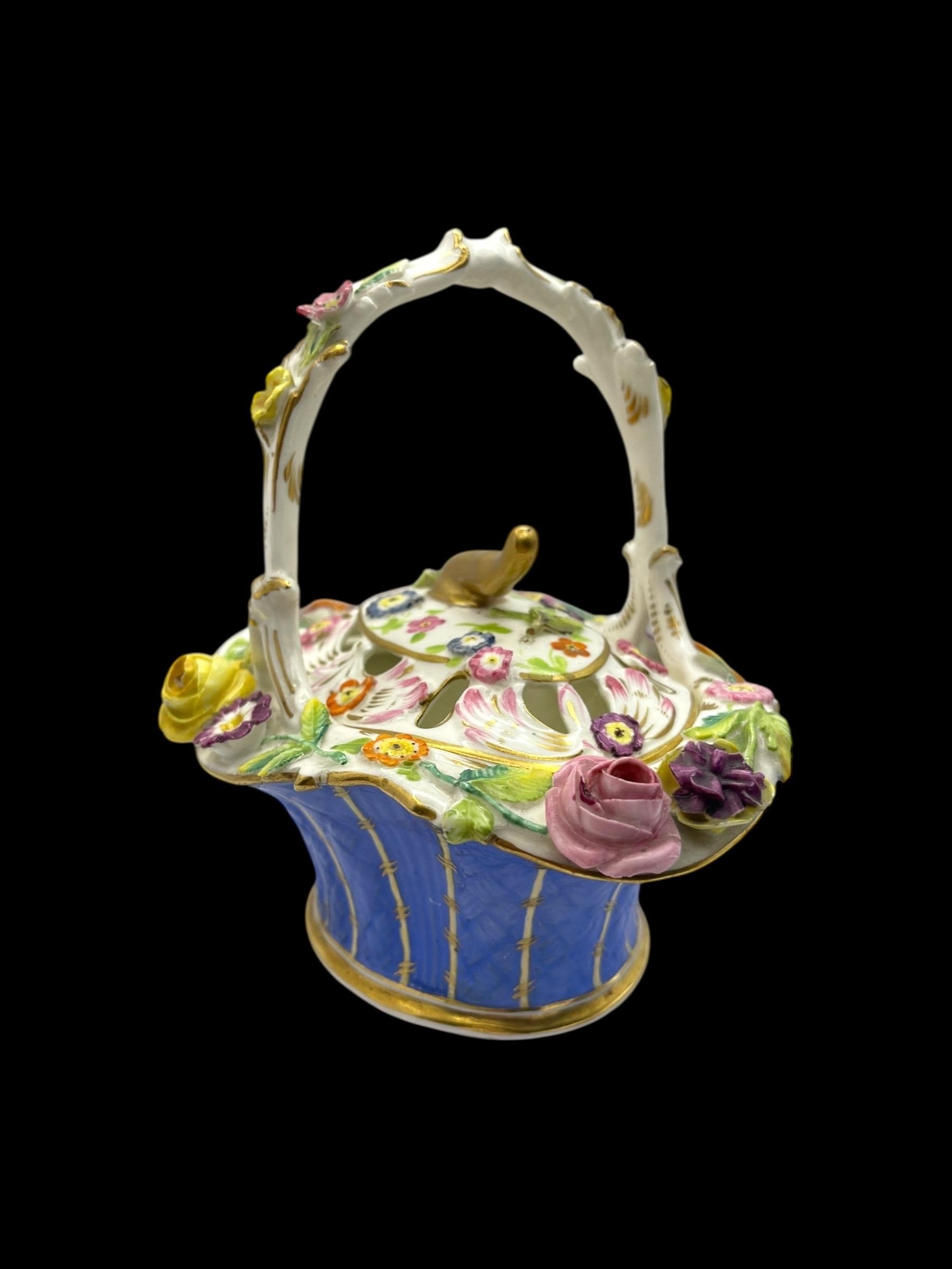 A charming and highly collectible 19th-century Coalbrookdale porcelain flower basket, crafted in England and richly decorated with delicate, hand-modeled flowers in vibrant hues. The basket features a beautifully sculpted openwork lid, a lavishly gilded handle entwined with blossoms, and a striking cobalt blue base textured to resemble woven wicker.
