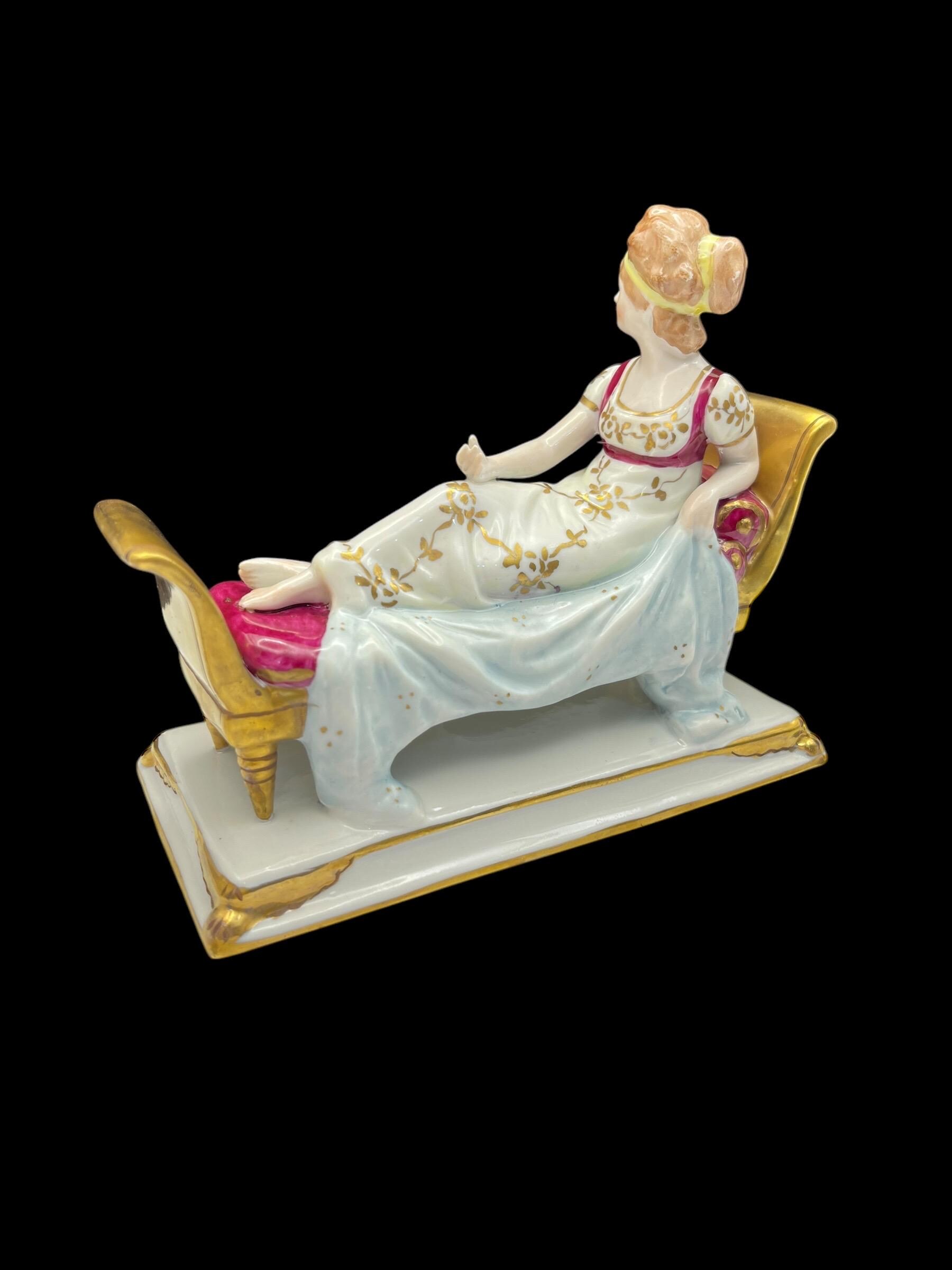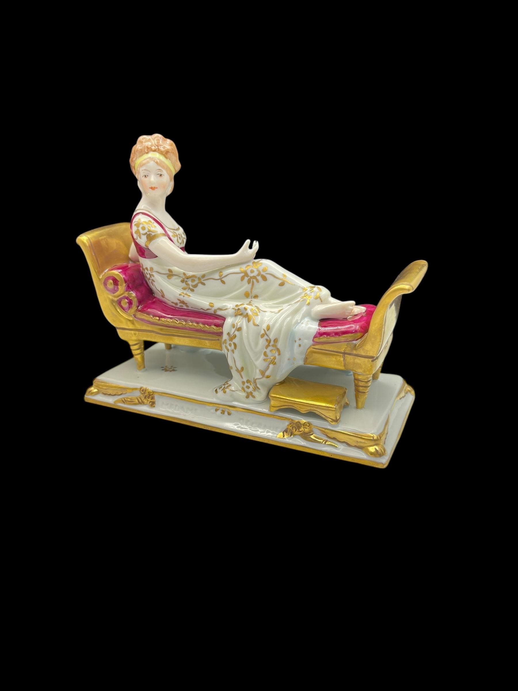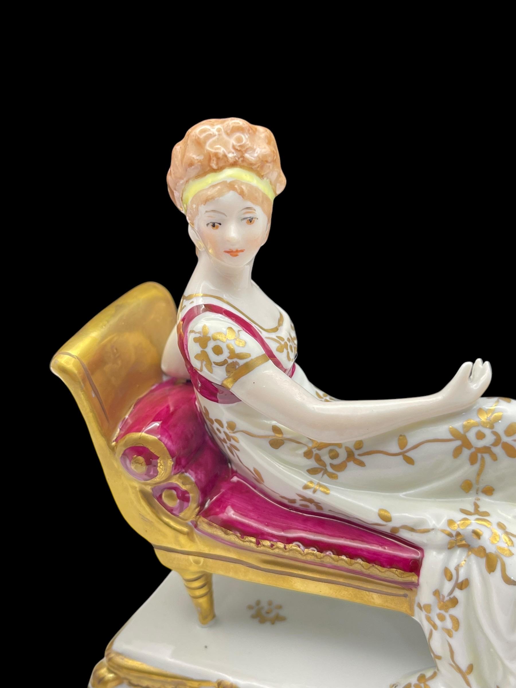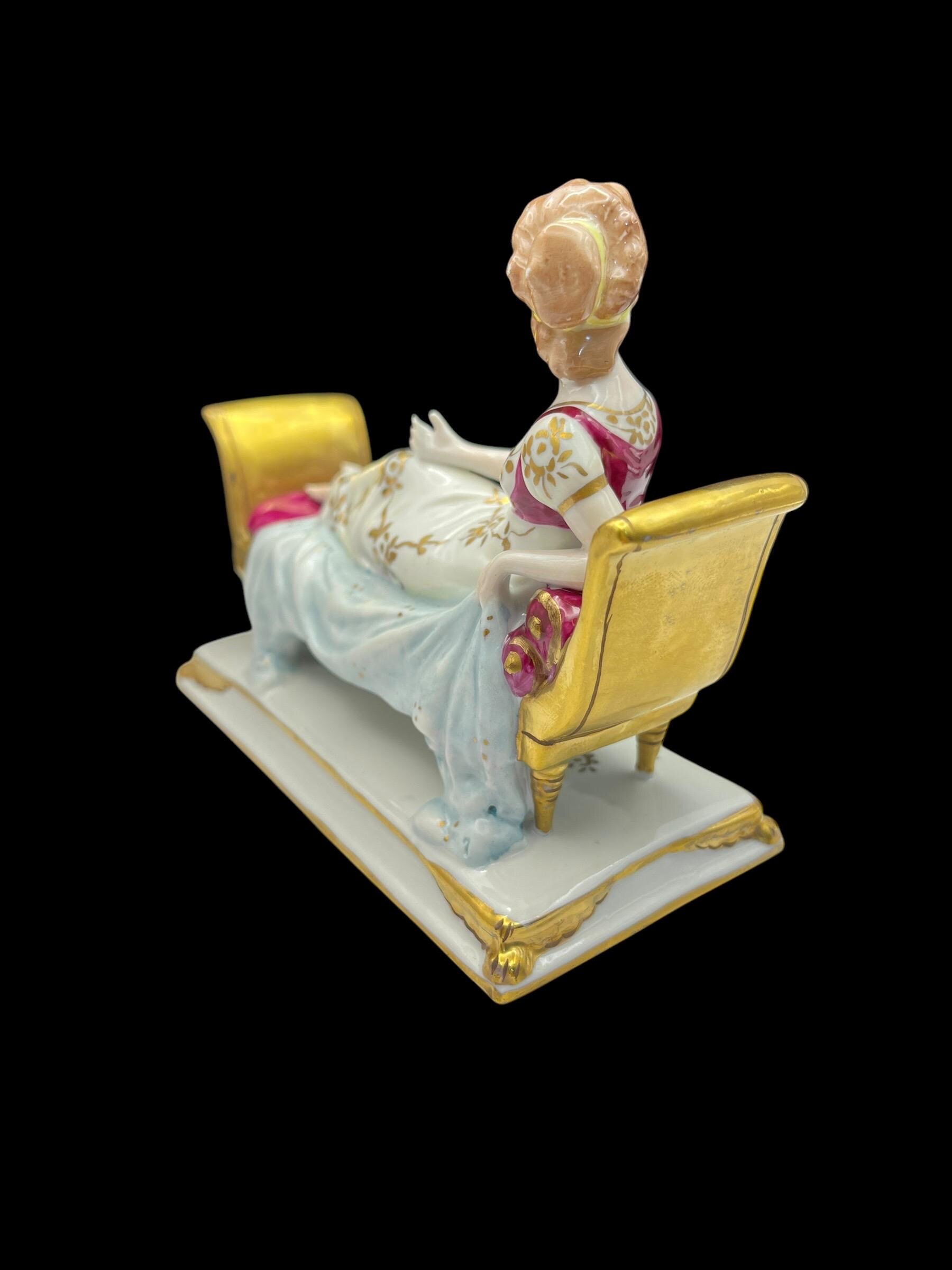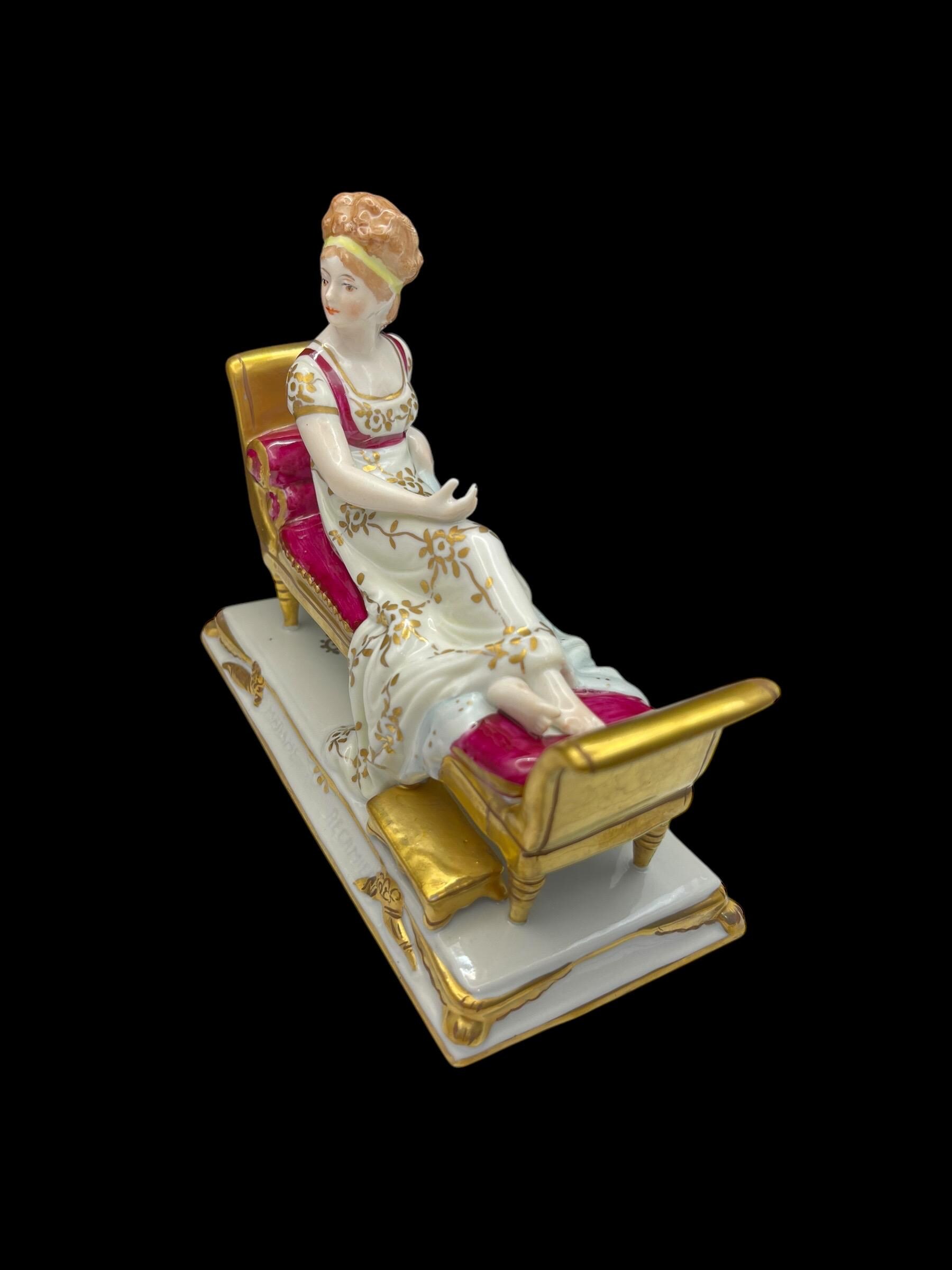 A finely crafted hand-painted porcelain figurine by Scheibe Alsbach, Germany (marked with the “S” used from 1905 to 1972), portraying Juliette Récamier — one of the most celebrated beauties of the Consulate era.