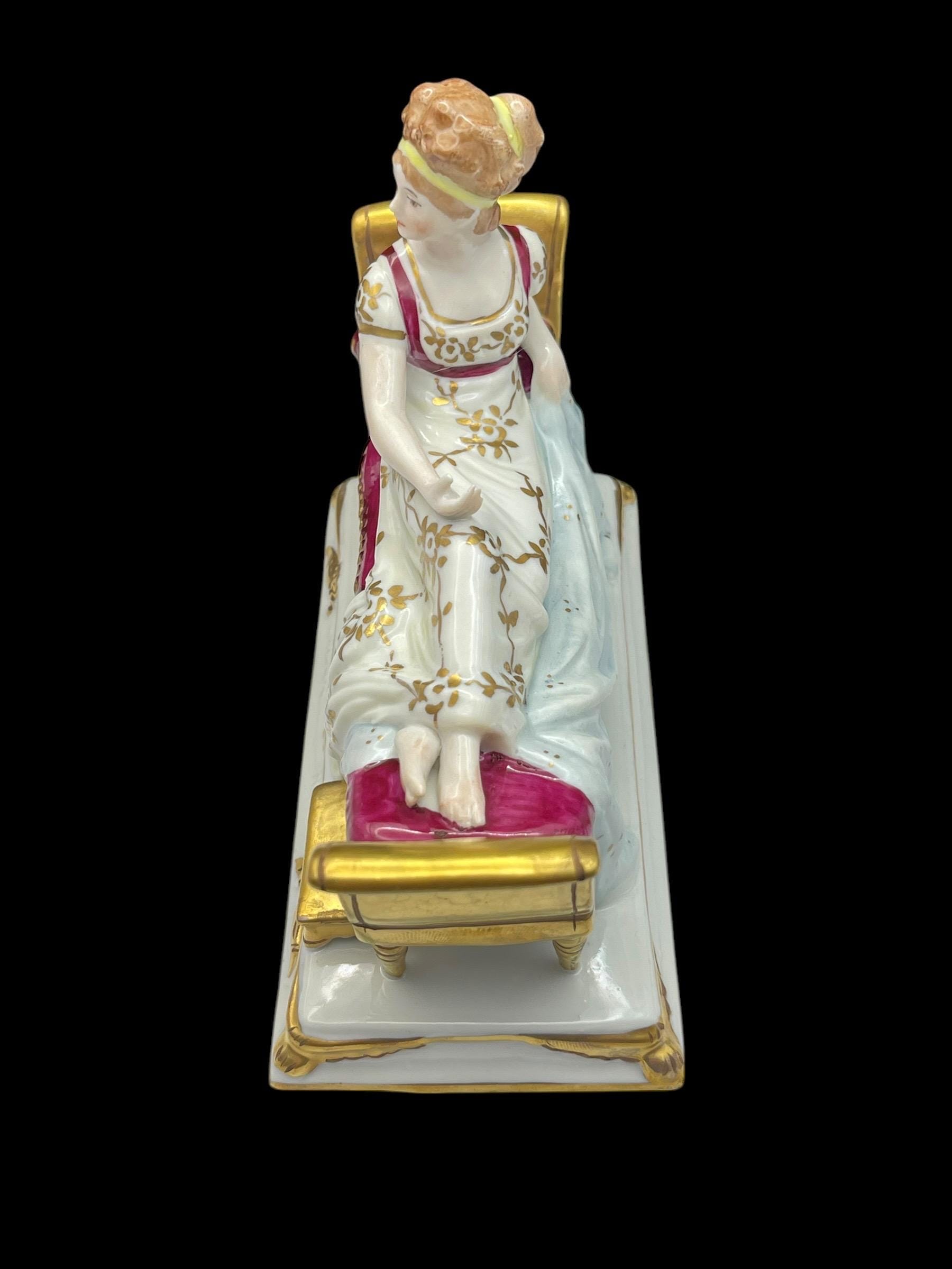 David’s composition broke with traditional portraiture by placing the sitter at a dramatic distance, half-reclined like a Roman matron in a minimalist interior. The empty space and restrained palette heightened the quiet power and grace of Récamier’s figure — elements this porcelain figurine subtly echoes through its elegant posture, flowing dress, and golden ornamental detailing.
