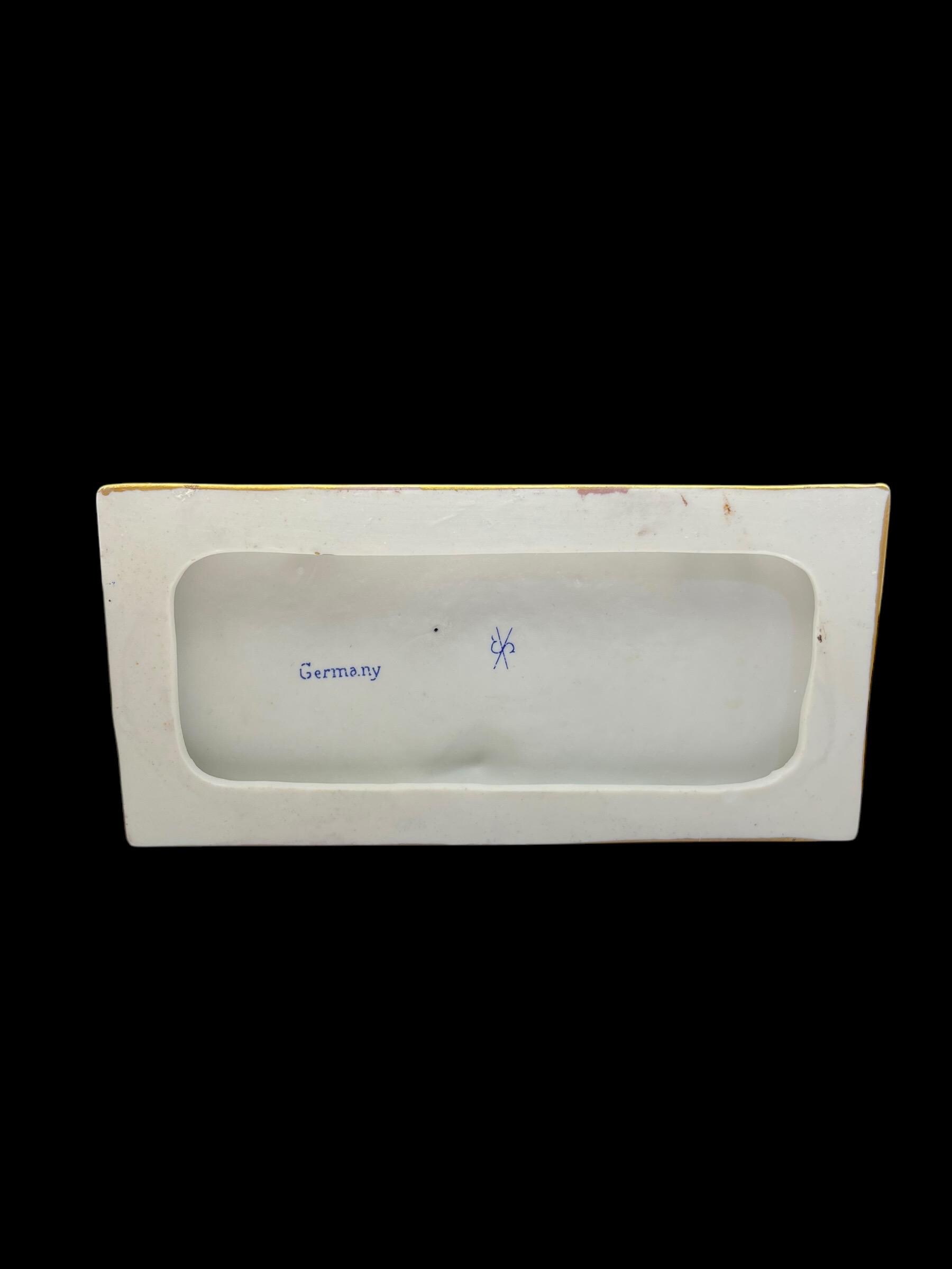 • Origin: Germany • Mark: Underglaze blue “S” for Scheibe Alsbach • Period: 1905–1972 • Subject: Juliette Récamier • Inspired by: The iconic portrait by Jacques-Louis David (1800, oil on canvas, 174 × 244 cm, Louvre Museum) • Dimensions: Height 11.5 cm (4.5 in), Width 15 cm (5.9 in) • Material: High-quality porcelain • Decoration: Hand-painted with gilded accents • Condition: Excellent vintage condition. No chips, cracks, or restorations.