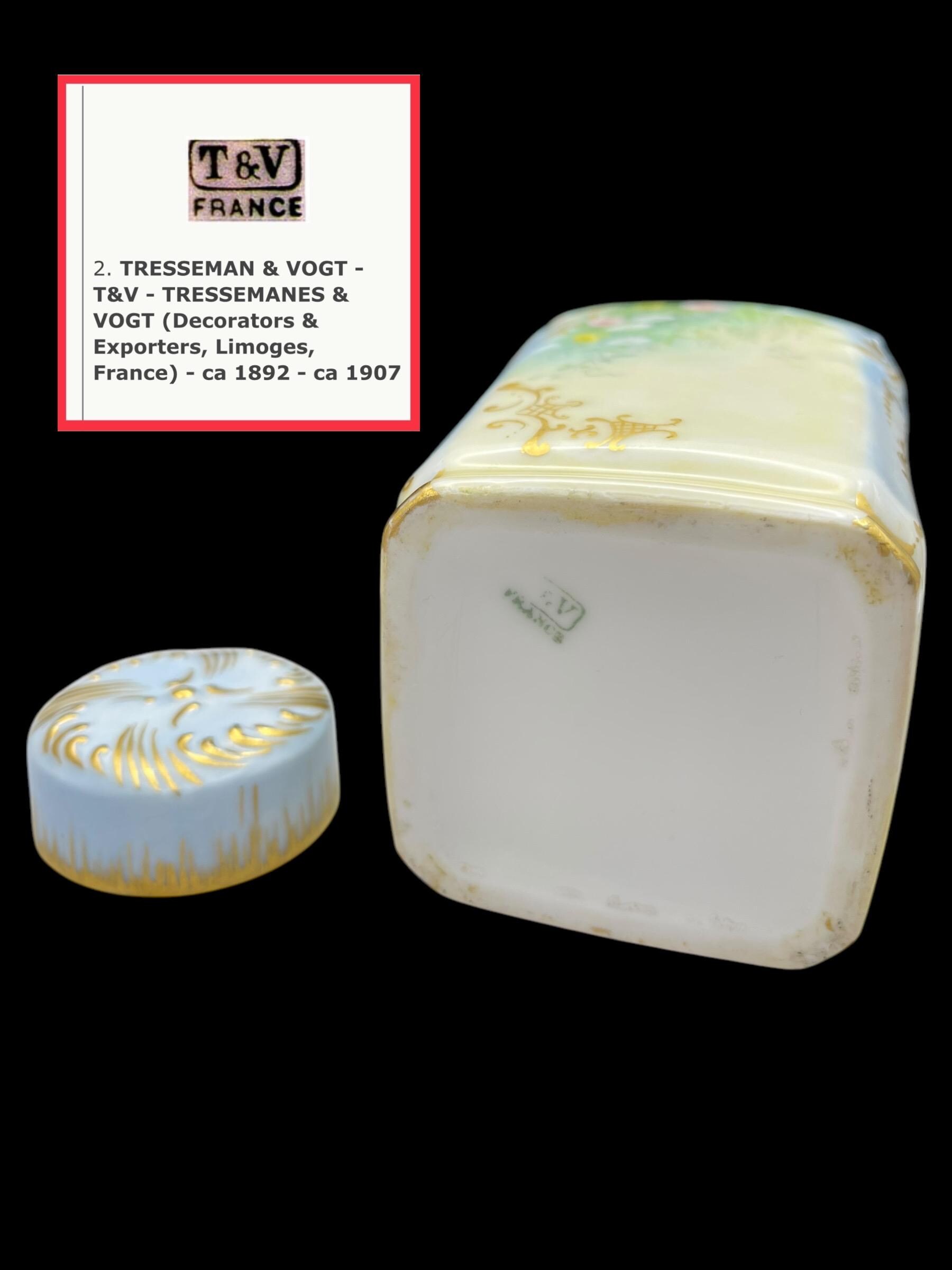• Maker: Tressemanes & Vogt (T&V France) • Mark: Underglaze green T&V FRANCE, used between 1892–1907 • Origin: Limoges, France • Material: Fine porcelain • Decoration: Hand-painted florals with gilded scrollwork, artist signed • Height: Approx. 4 5/6 in (12.3 cm) • Width: Approx. 3 3/4 in (9.5 cm) • Capacity: Approx. 600 ml / 20.3 fl oz (US) • Condition: Excellent antique condition. No chips, cracks, or restorations. Gold is well preserved.