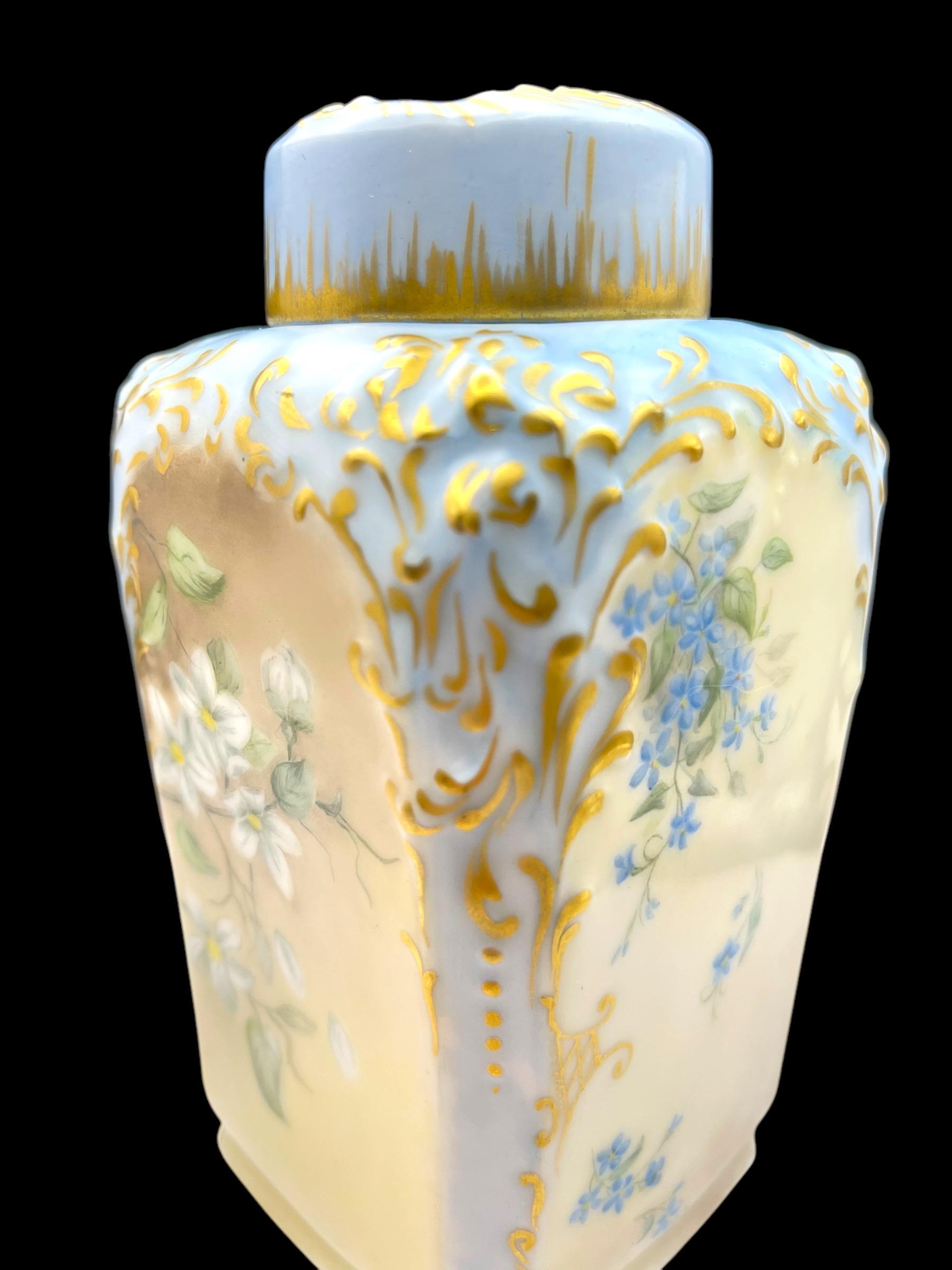 A stunning antique Limoges porcelain tea caddy by Tressemanes & Vogt (T&V France), dating from circa 1892–1907, during the golden age of French porcelain artistry. The piece is richly decorated with hand-painted floral panels on each side, featuring blue forget-me-nots, white blossoms, and morning glories in delicate pastel hues, framed by elegant raised gold scrollwork.