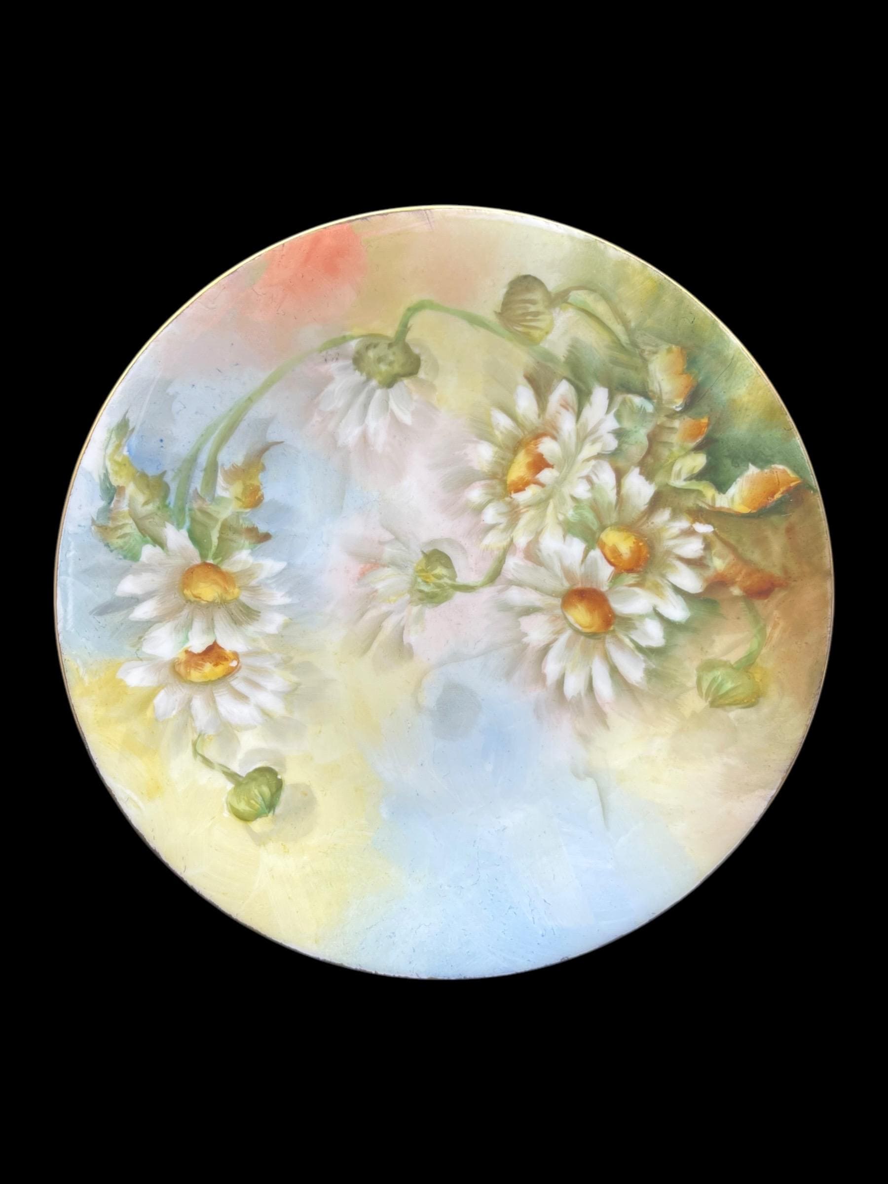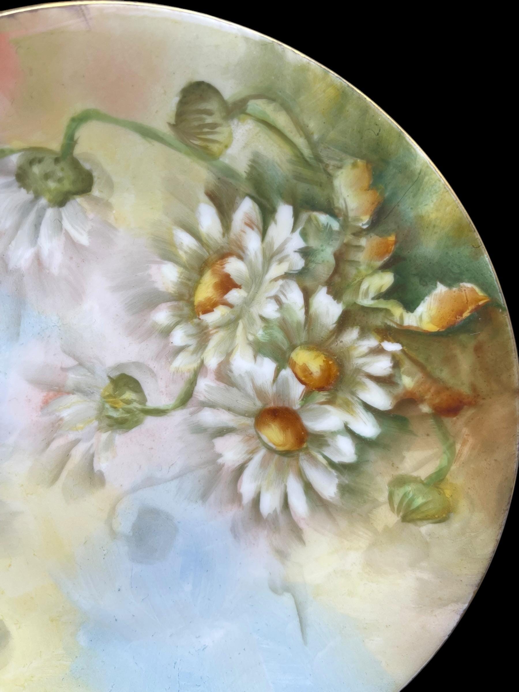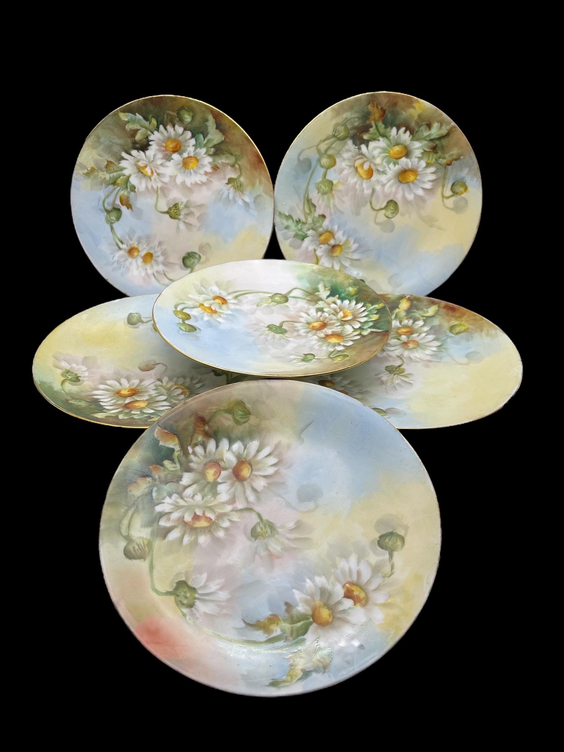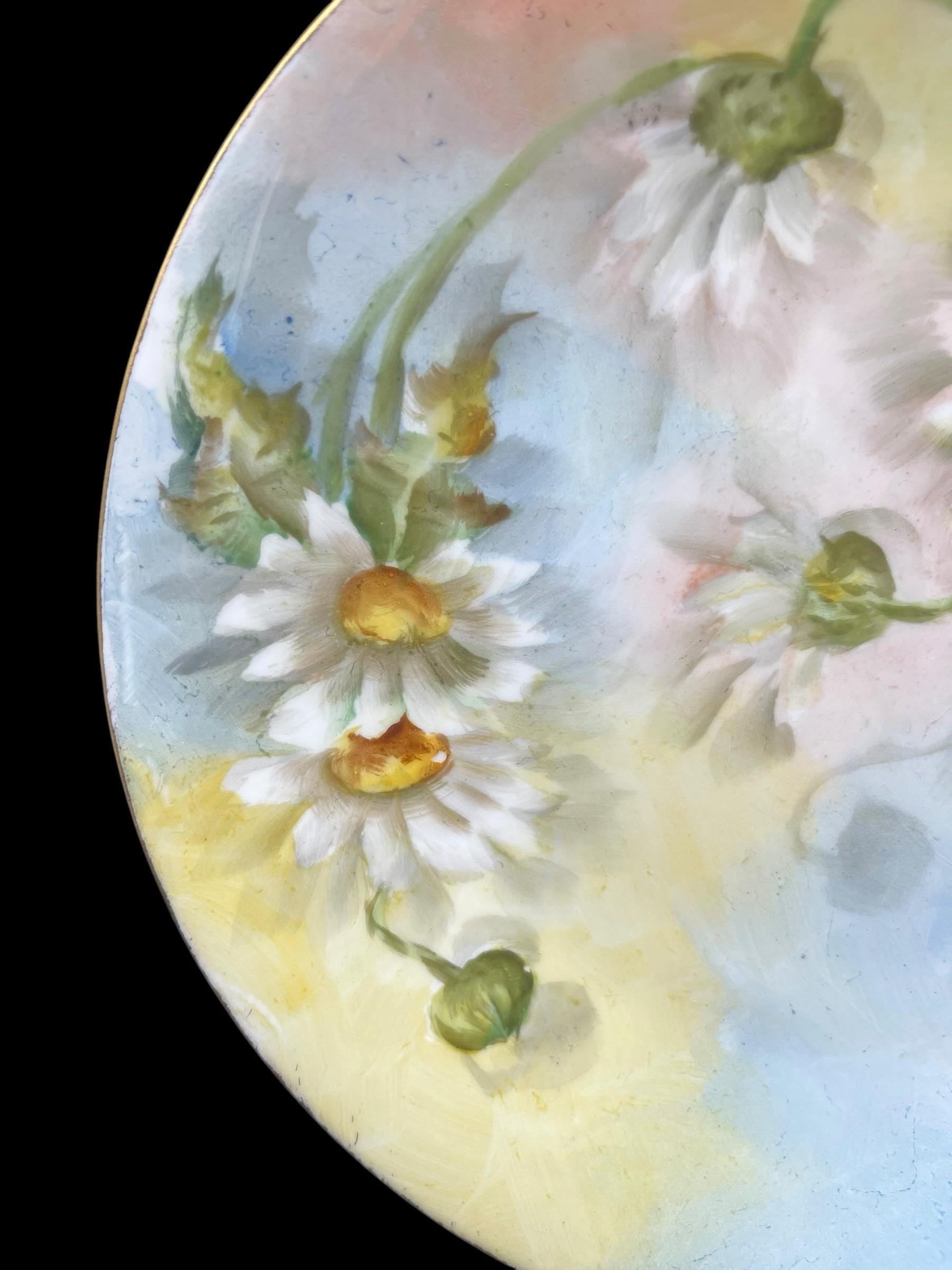 Each plate features a delicate hand-painted daisy motif over a dreamy pastel background with soft gradient washes of pale yellow, sky blue, and warm coral, showcasing the finesse of turn-of-the-century French craftsmanship.