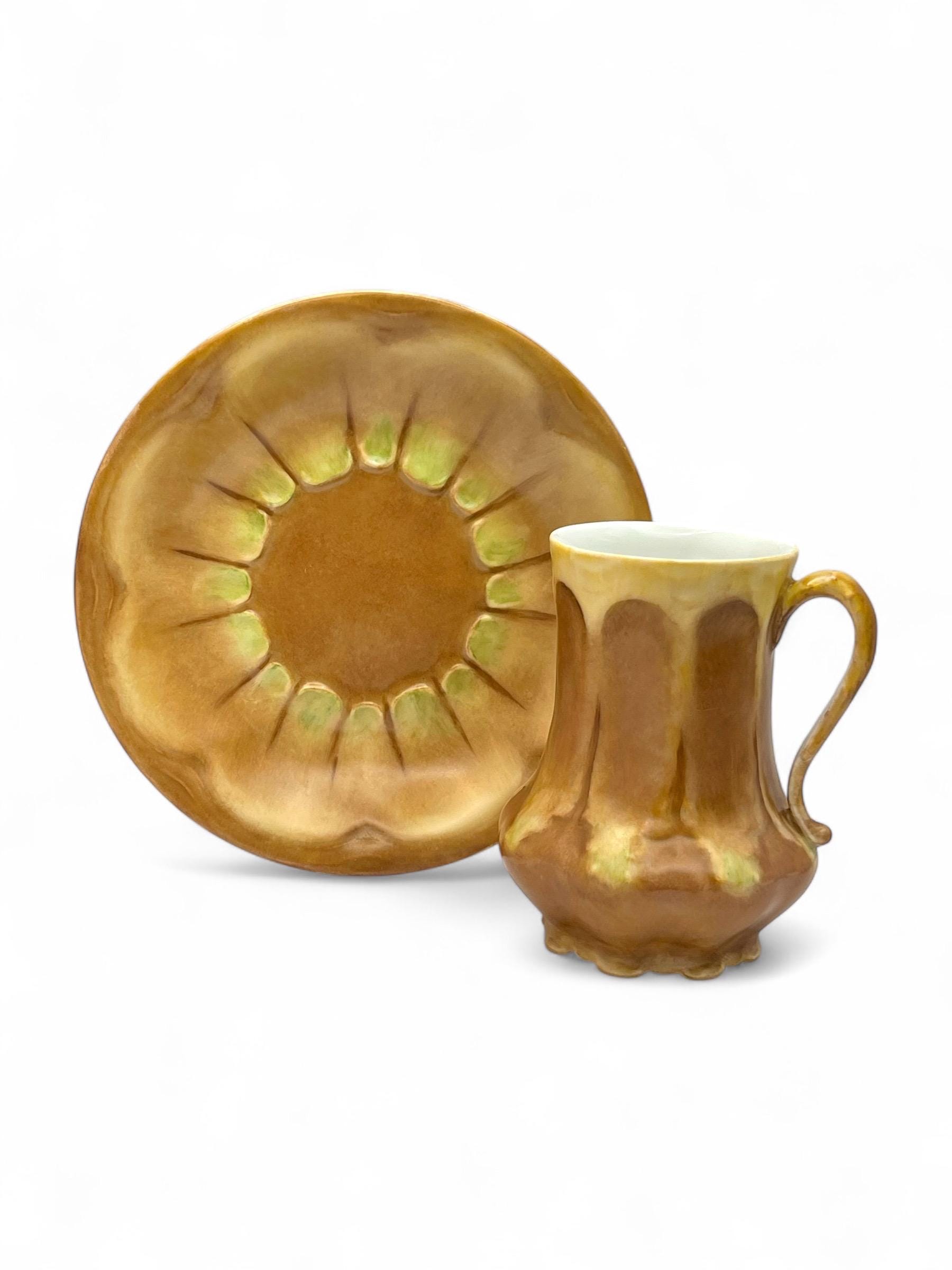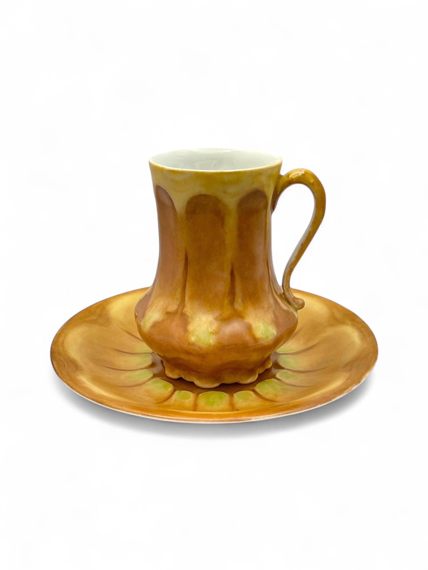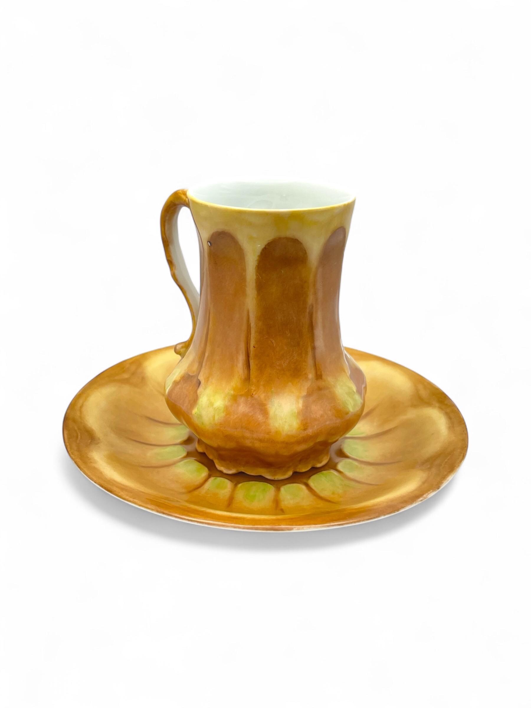 This exquisite antique chocolate cup and saucer set dates to the 1920s–1940s and is a stunning example of Art Nouveau porcelain from Limoges, France. Both the cup and saucer feature a warm hand-painted glaze with golden-brown, yellow, and soft green hues in an organic floral motif.