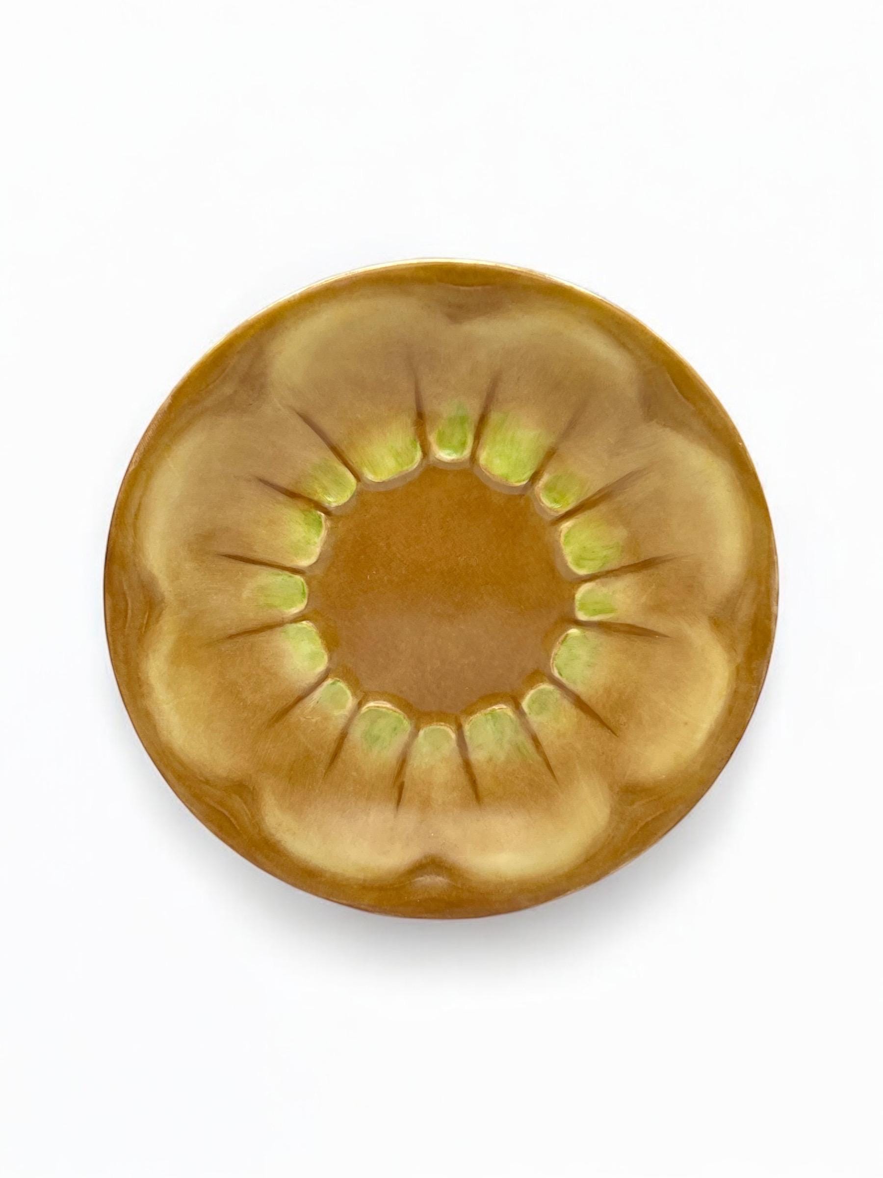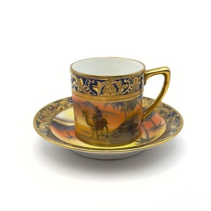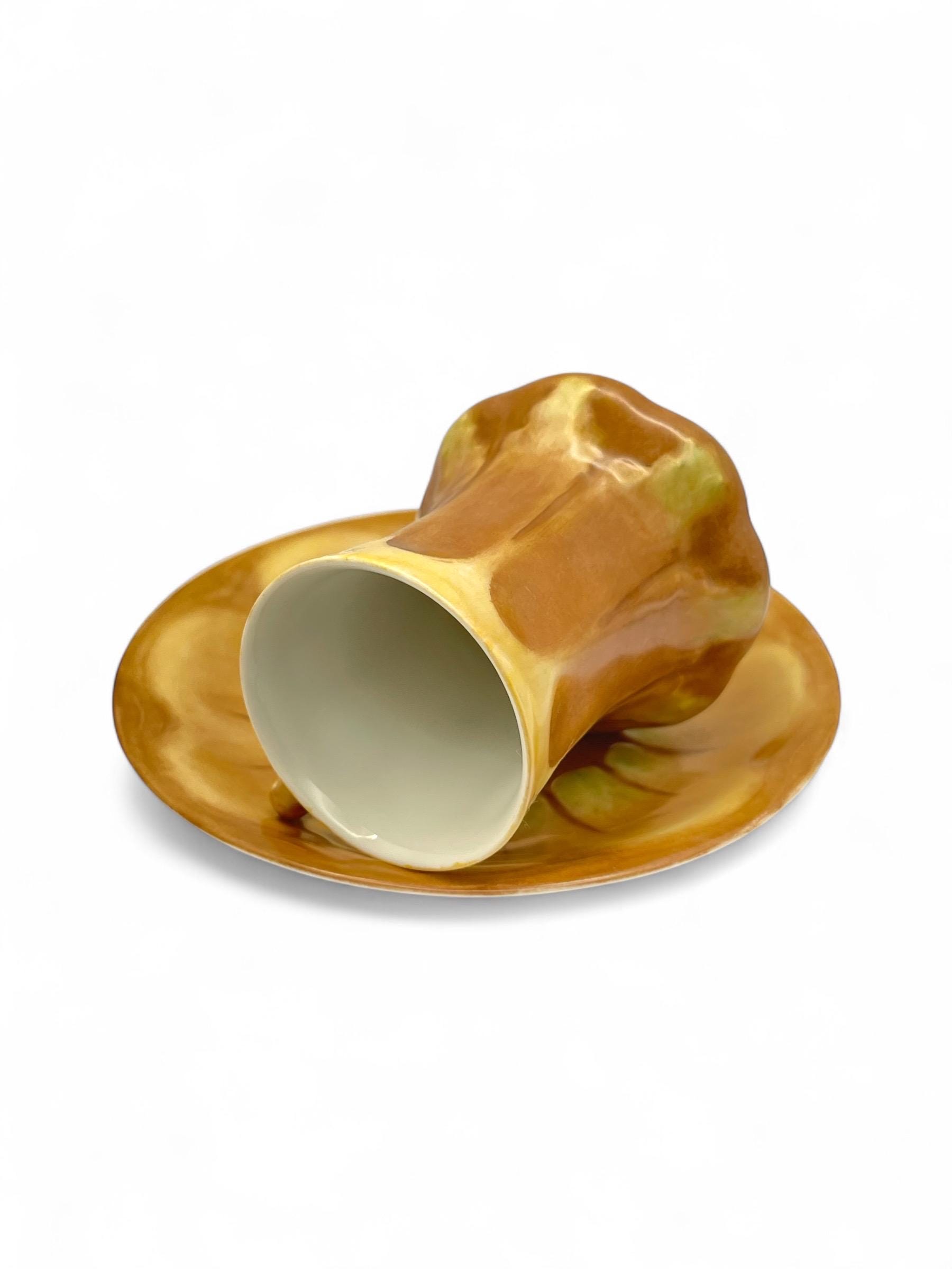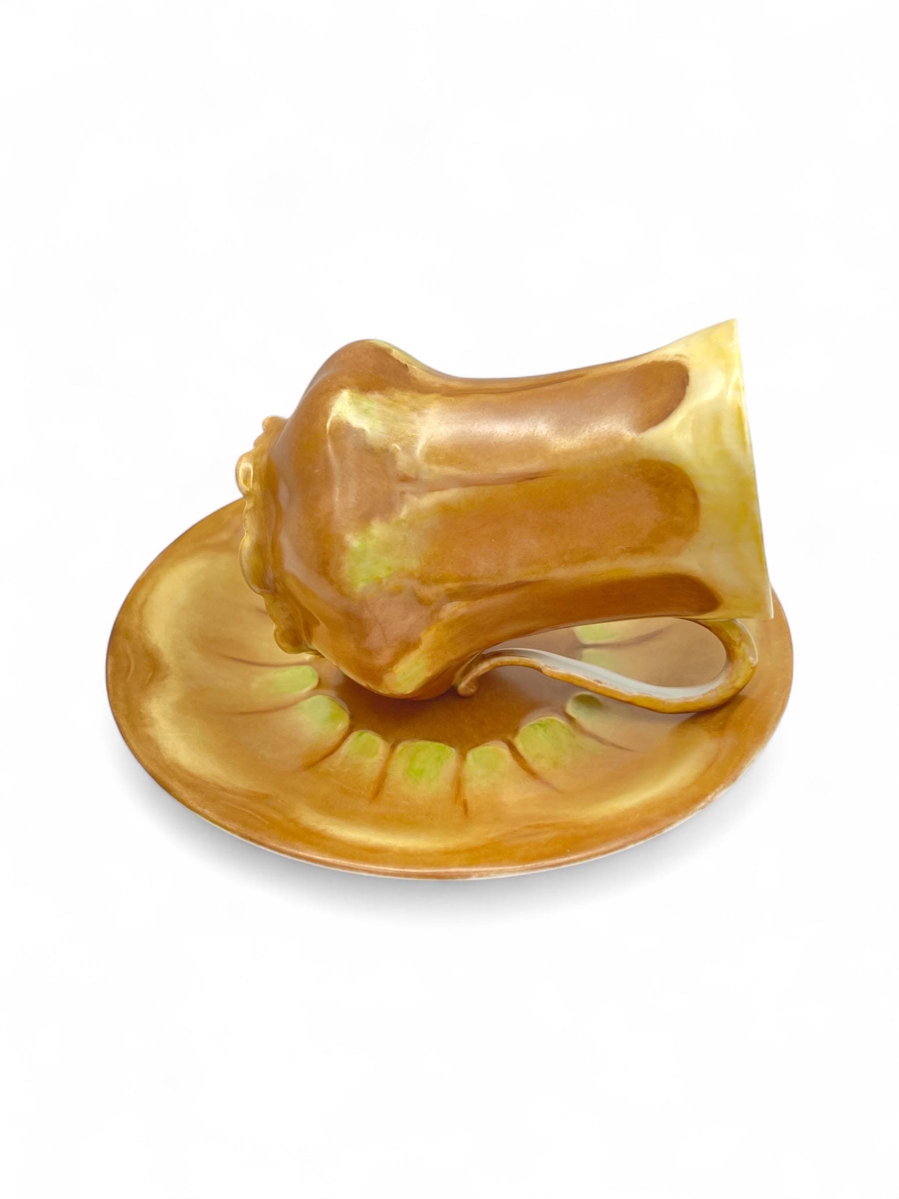This exquisite antique chocolate cup and saucer set dates to the 1920s–1940s and is a stunning example of Art Nouveau porcelain from Limoges, France. Both the cup and saucer feature a warm hand-painted glaze with golden-brown, yellow, and soft green hues in an organic floral motif.