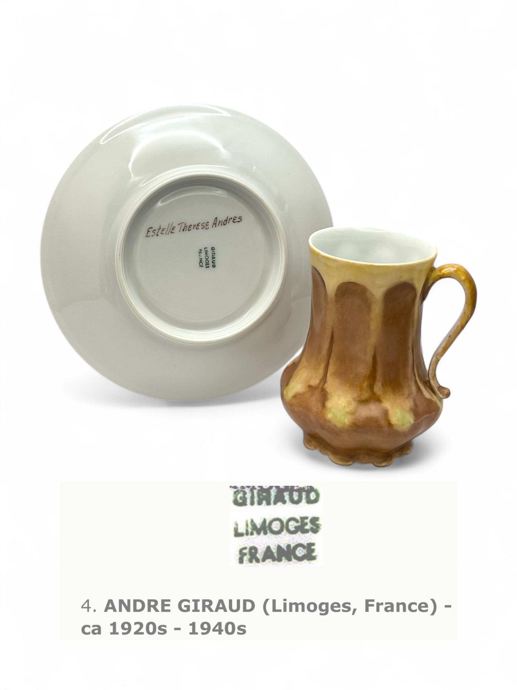 The base of both pieces is stamped “Giraud Limoges France,” and the saucer is signed by artist Estelle Therese Andres in freehand script. The sculptural shape of the cup and petal-like pattern of the saucer reflect the influence of nature and fluid form typical of the Art Nouveau movement.