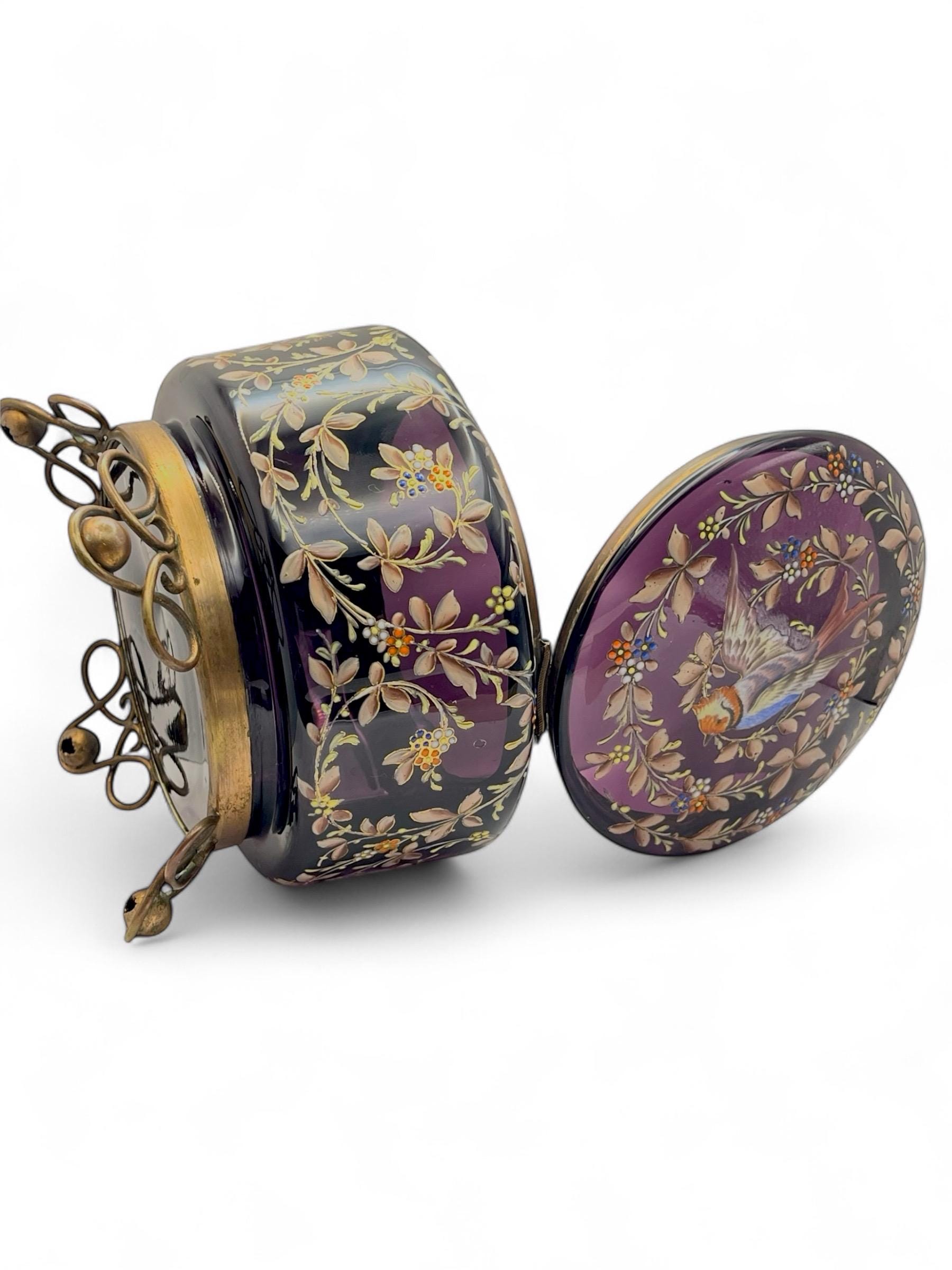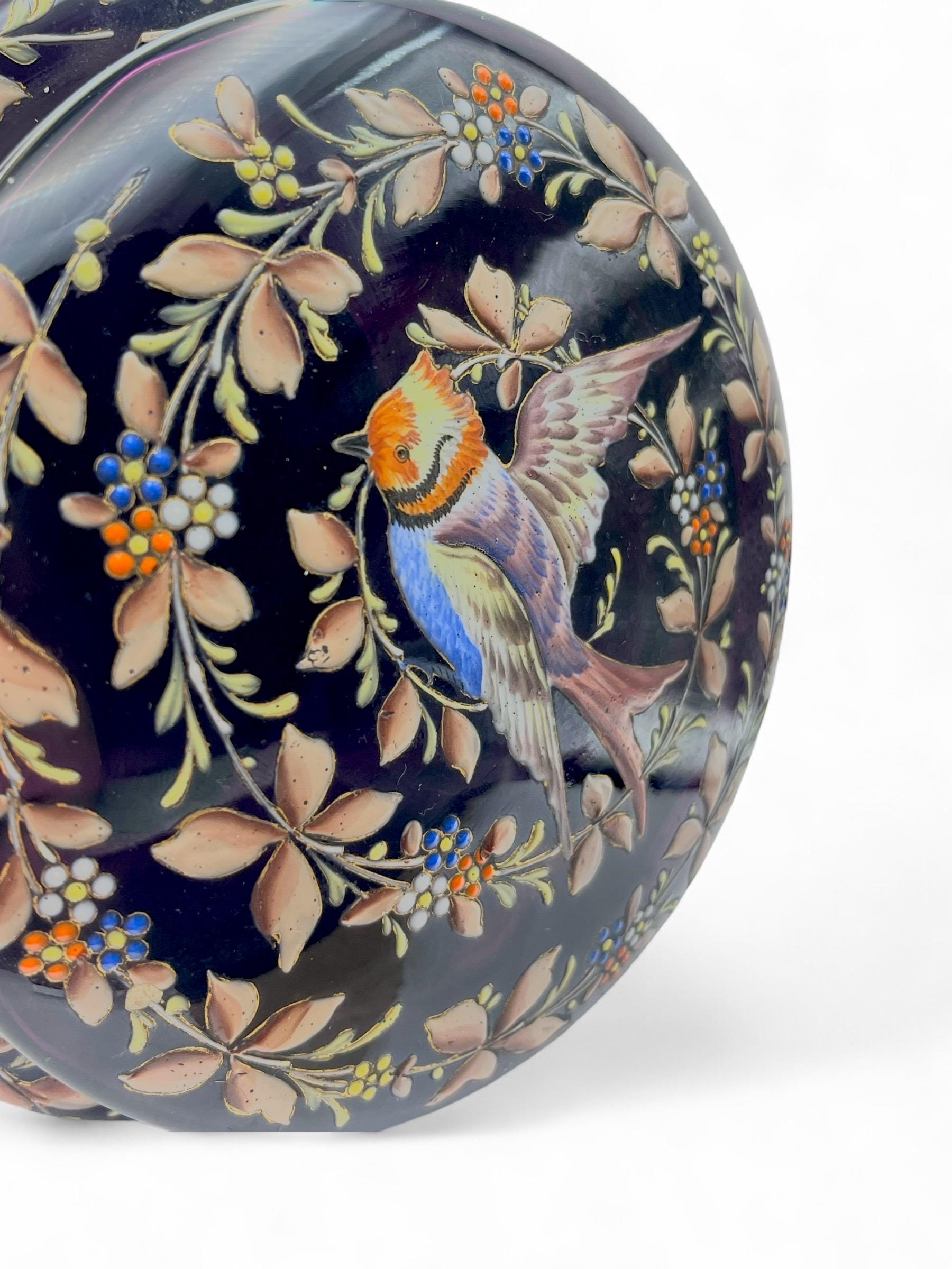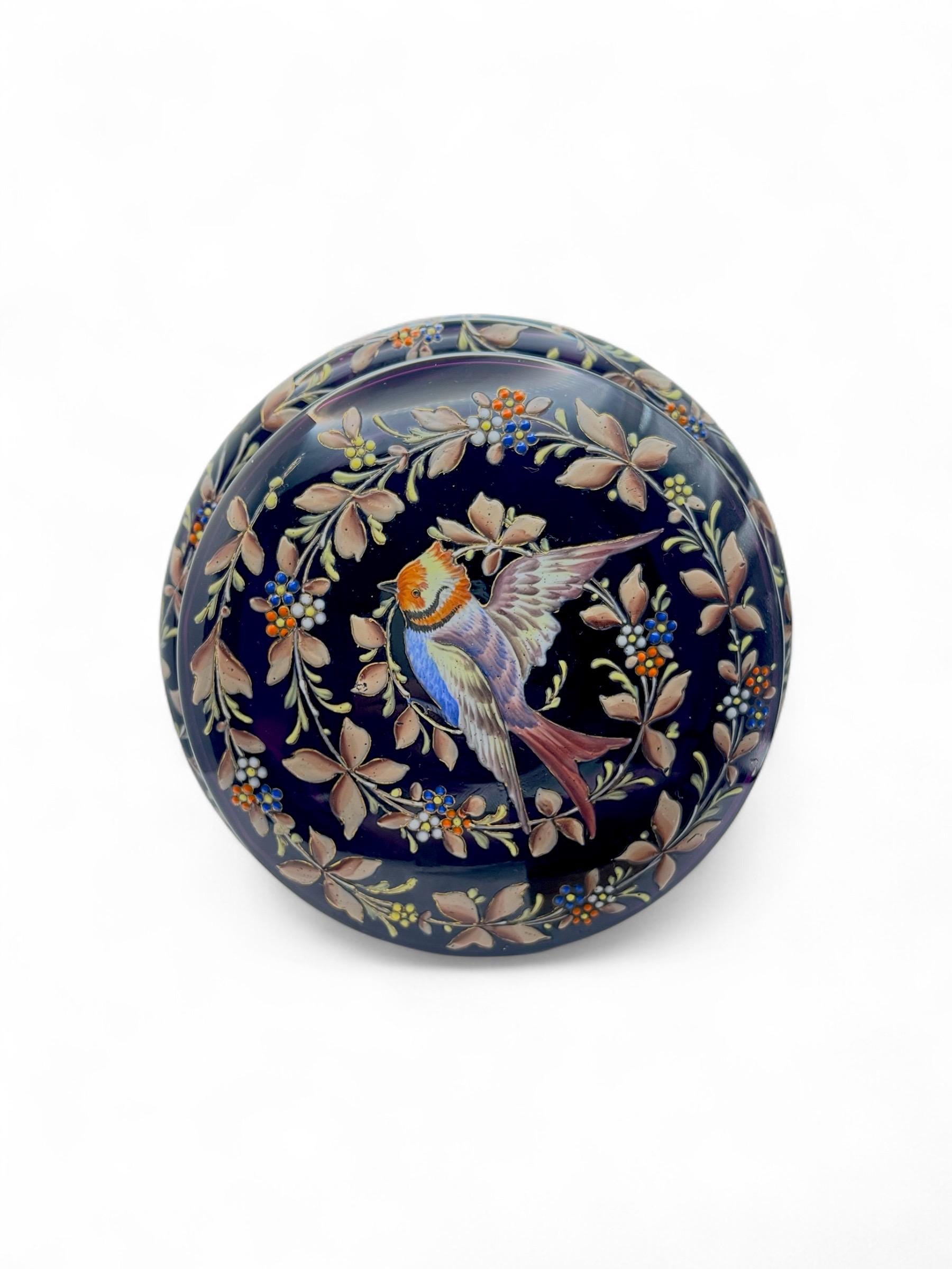 Crafted in deep cobalt blue opaline glass, the surface is richly decorated with enamel-painted floral motifs and a central bird design on the lid. The inside features a rare purple-hued inner layer with delicate etched plant details, offering both external elegance and internal charm.