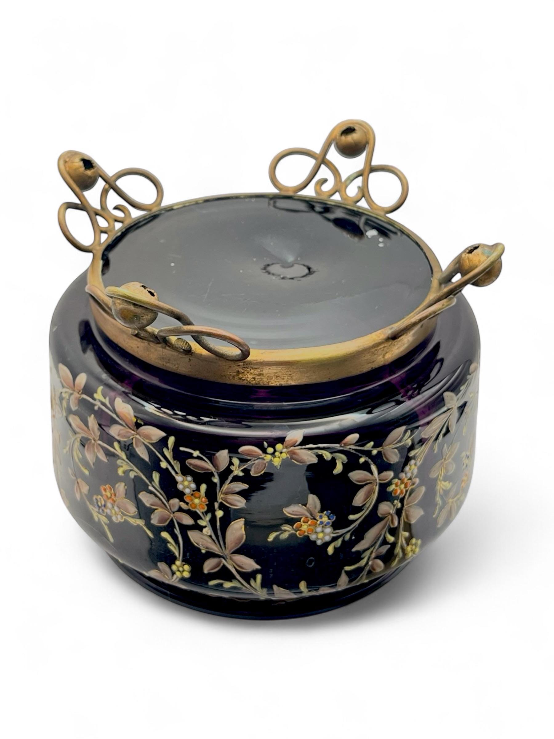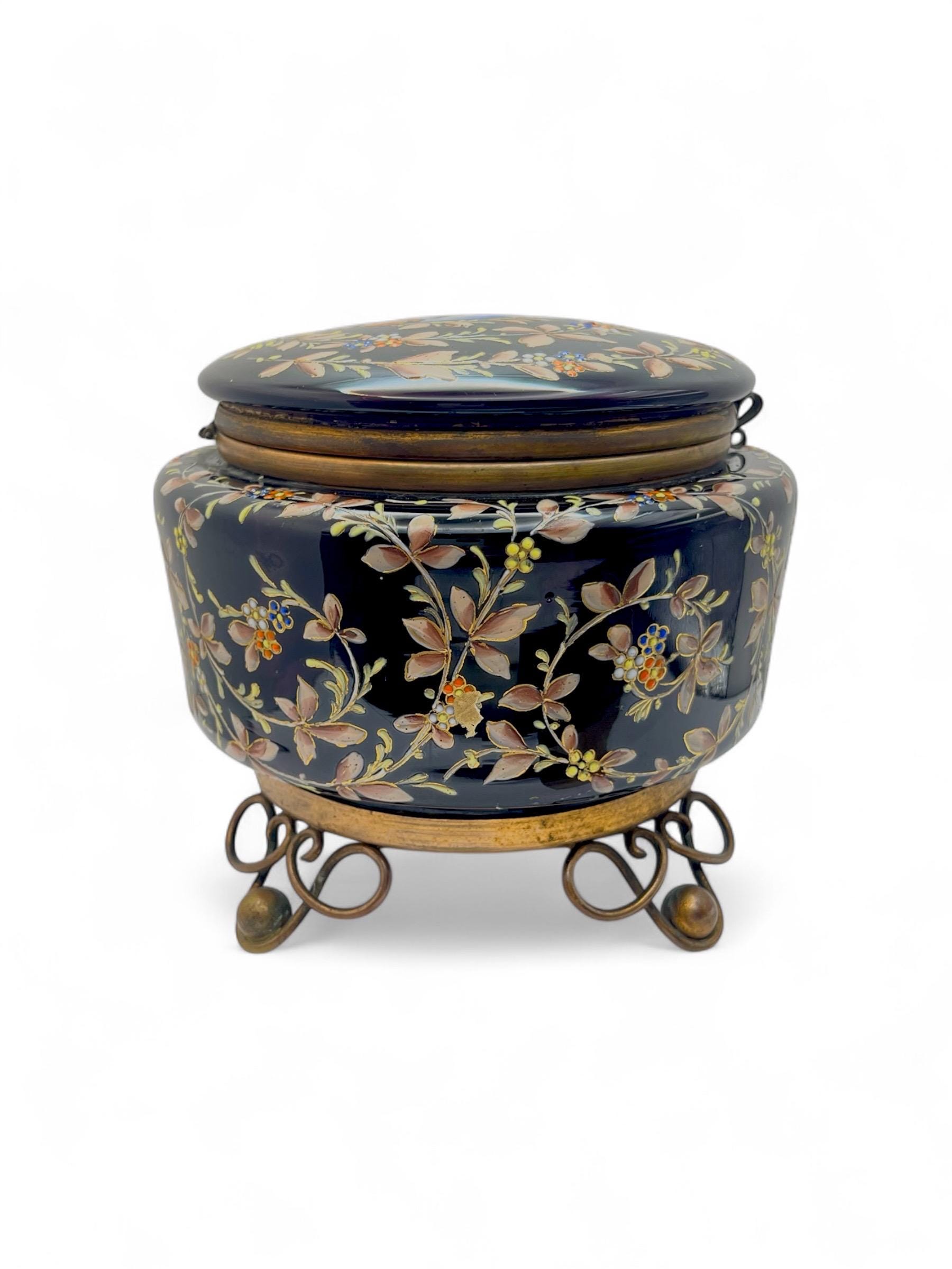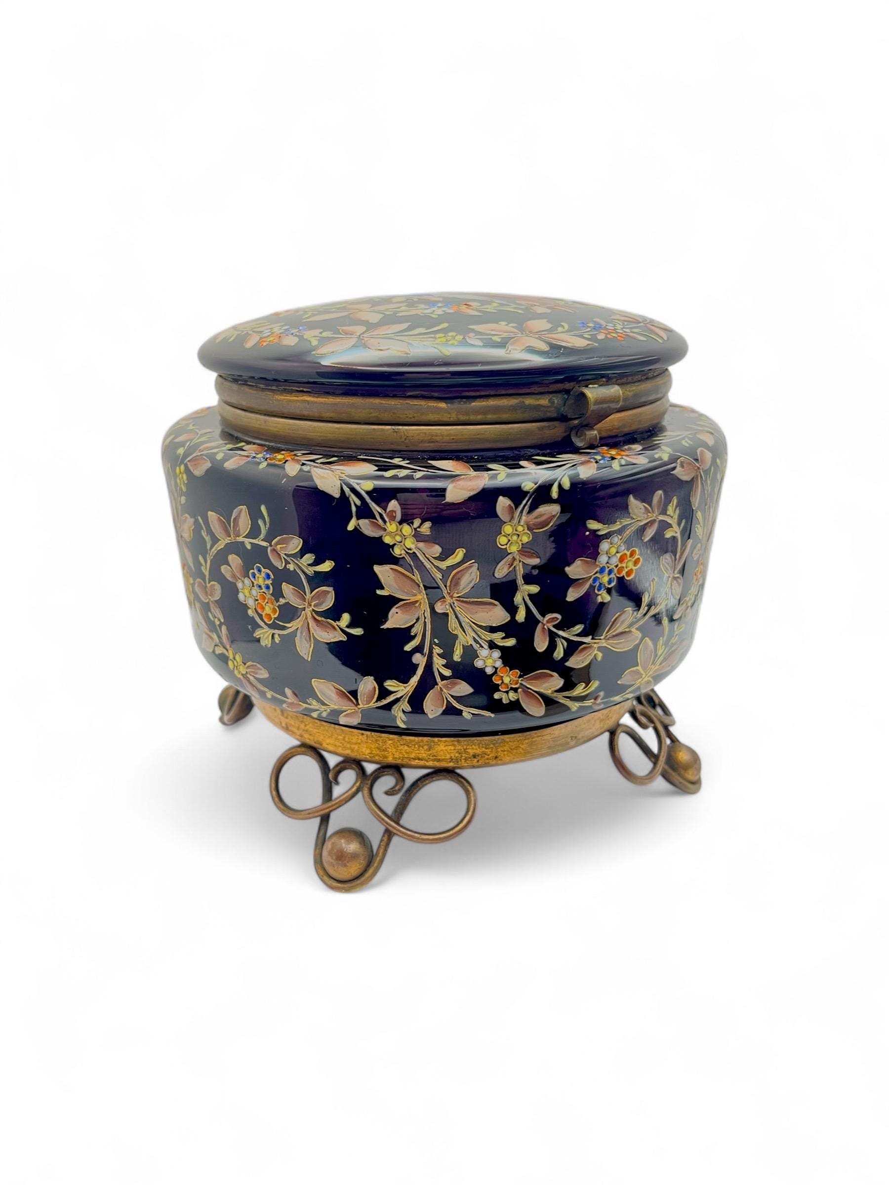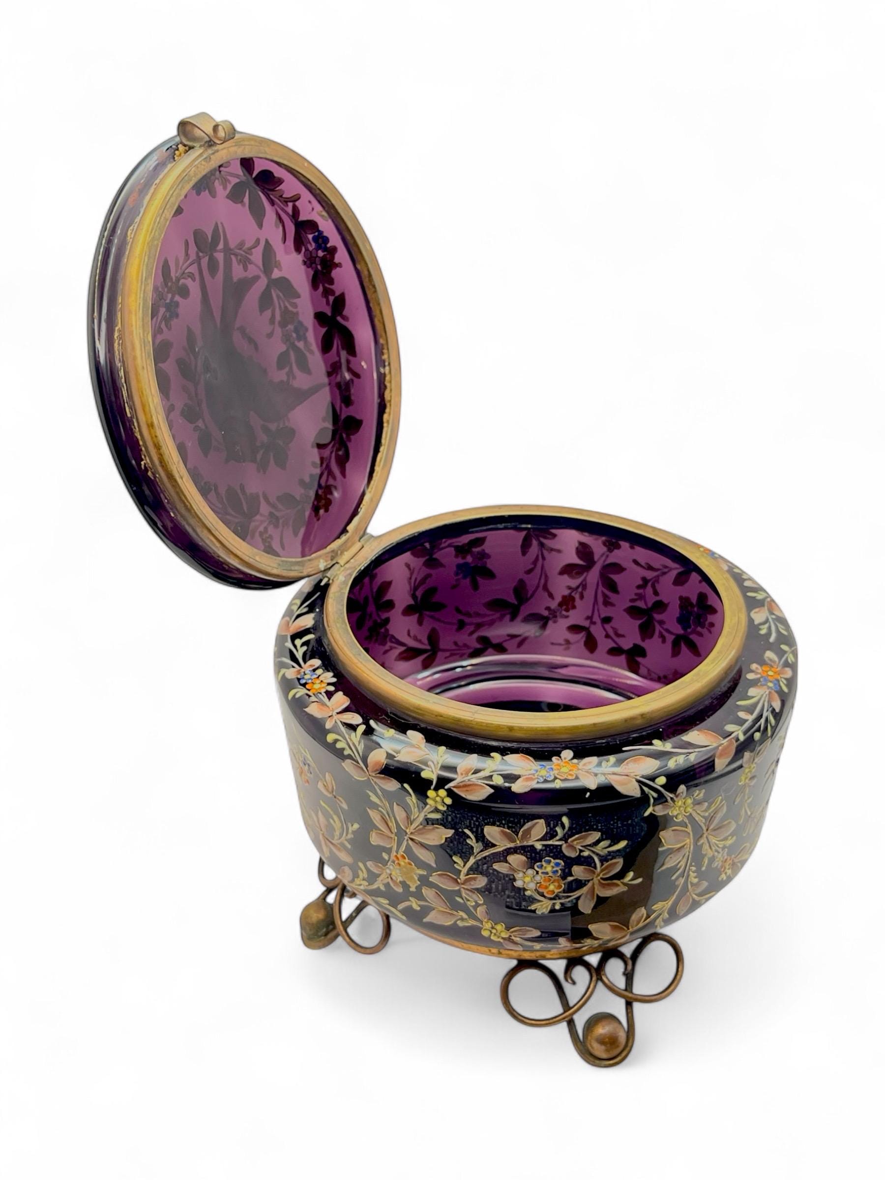 Crafted in deep cobalt blue opaline glass, the surface is richly decorated with enamel-painted floral motifs and a central bird design on the lid. The inside features a rare purple-hued inner layer with delicate etched plant details, offering both external elegance and internal charm.