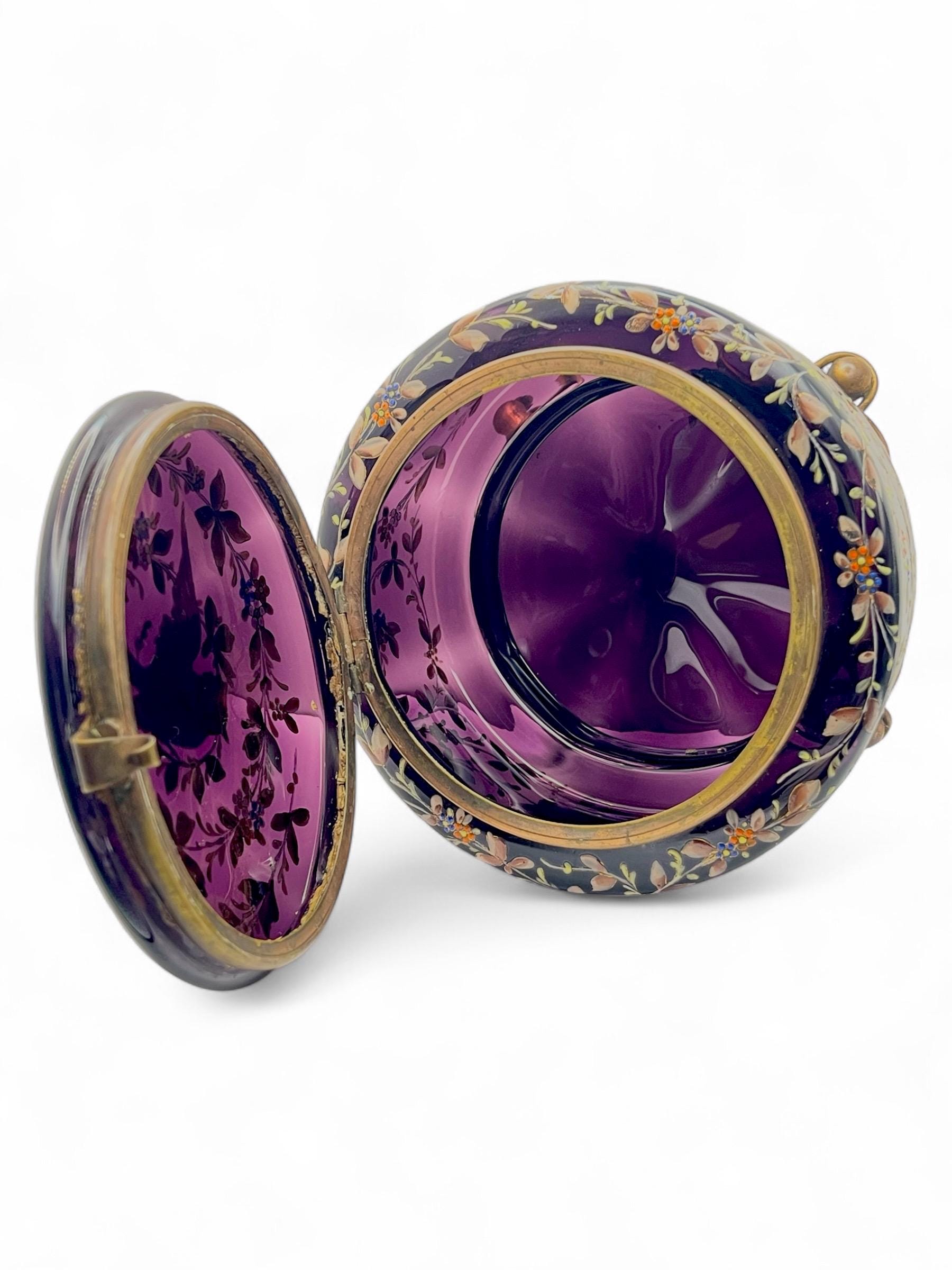 This exquisite late 19th-century Bohemian glass box showcases the pinnacle of European decorative artistry in hand-blown and hand-painted glass.