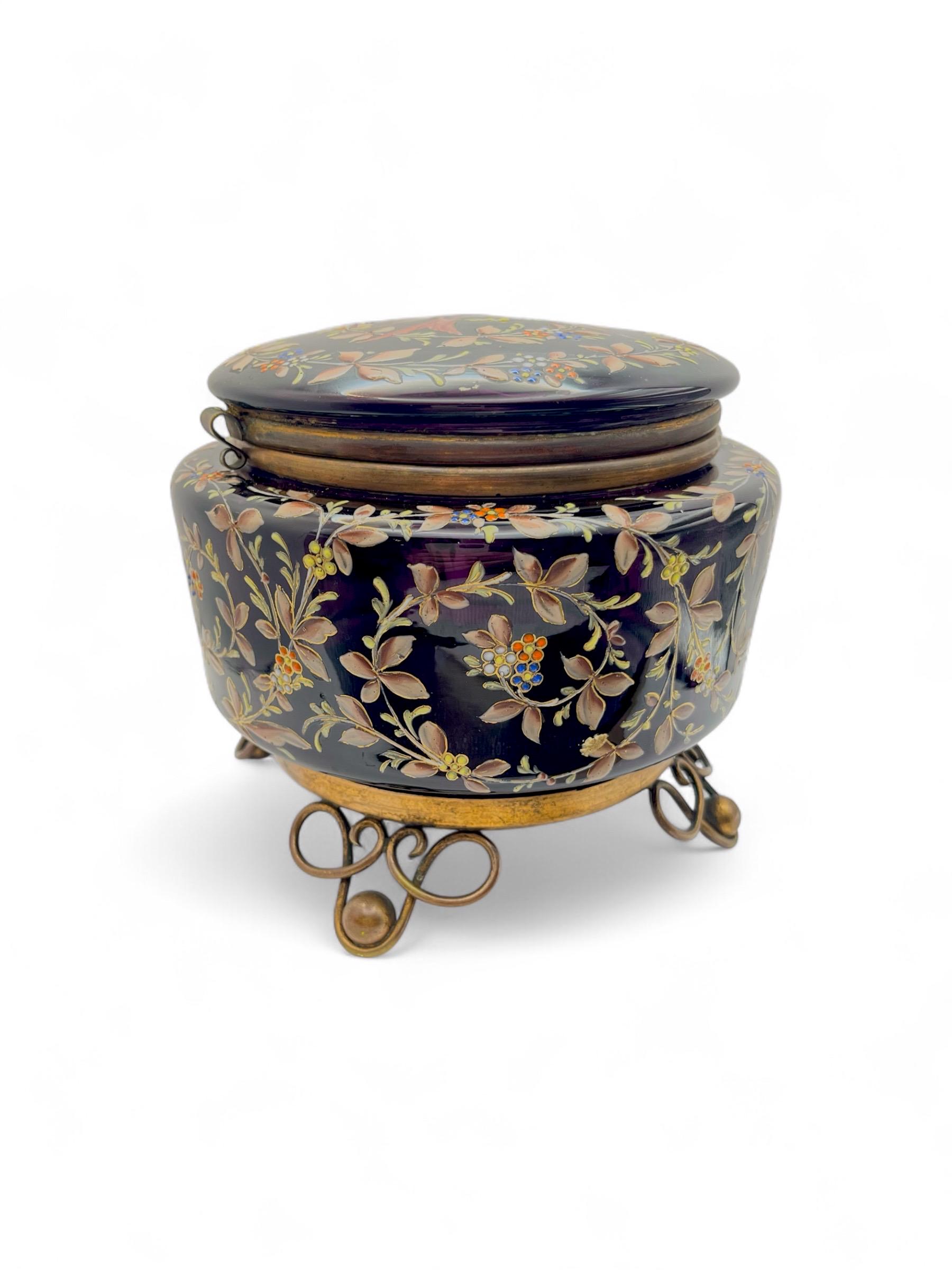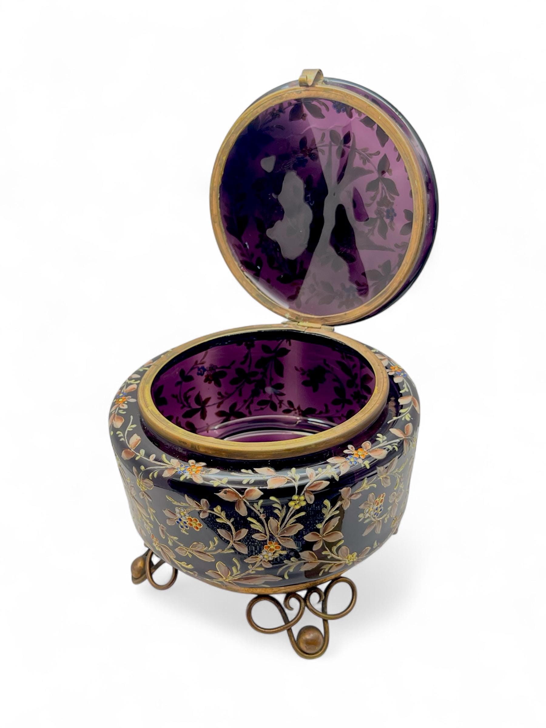 Mounted on finely crafted gilt bronze feet with a hinged lid and metal rim, this piece exemplifies the sophisticated craftsmanship of the Bohemian region during the late 1800s.
