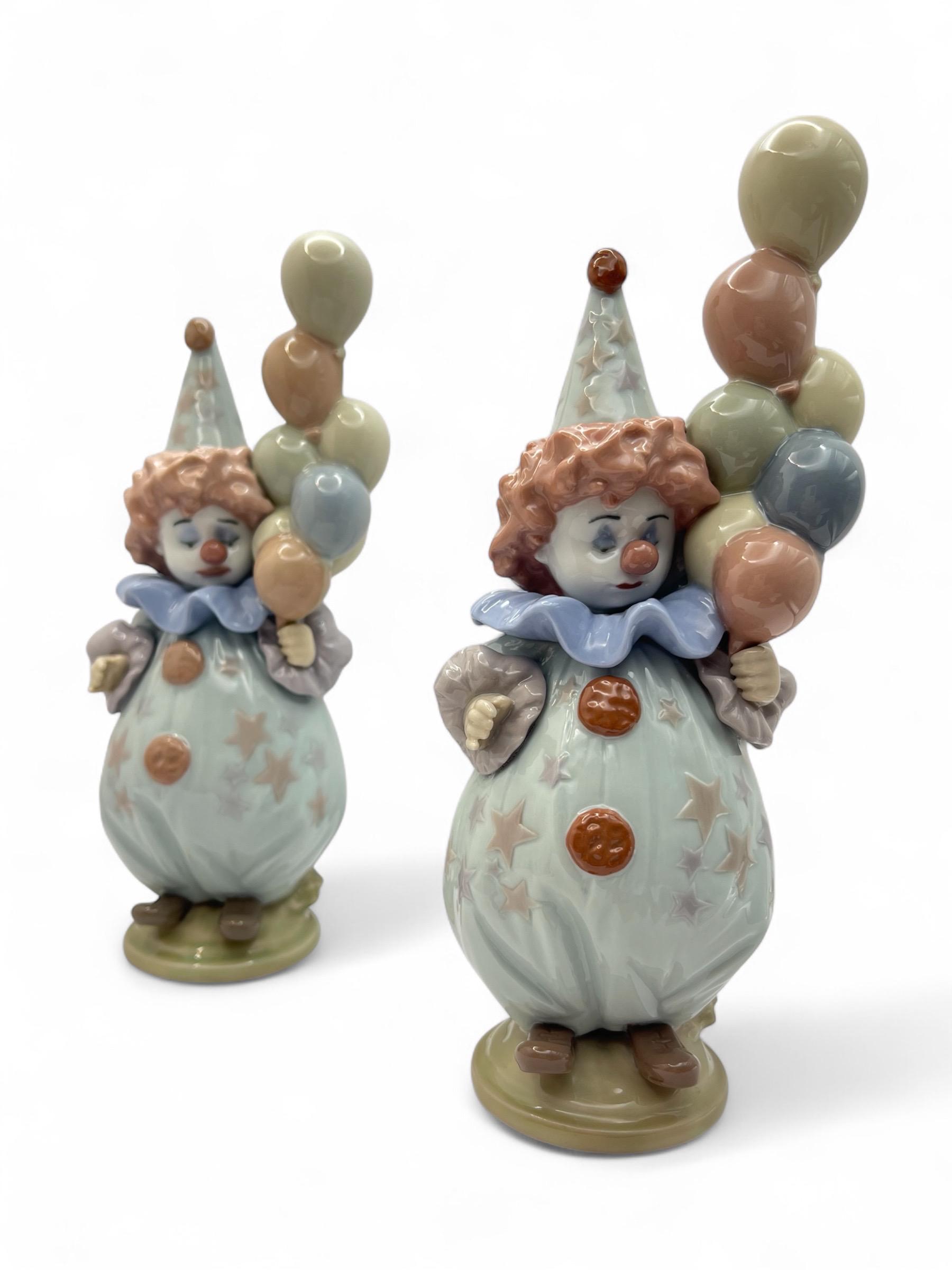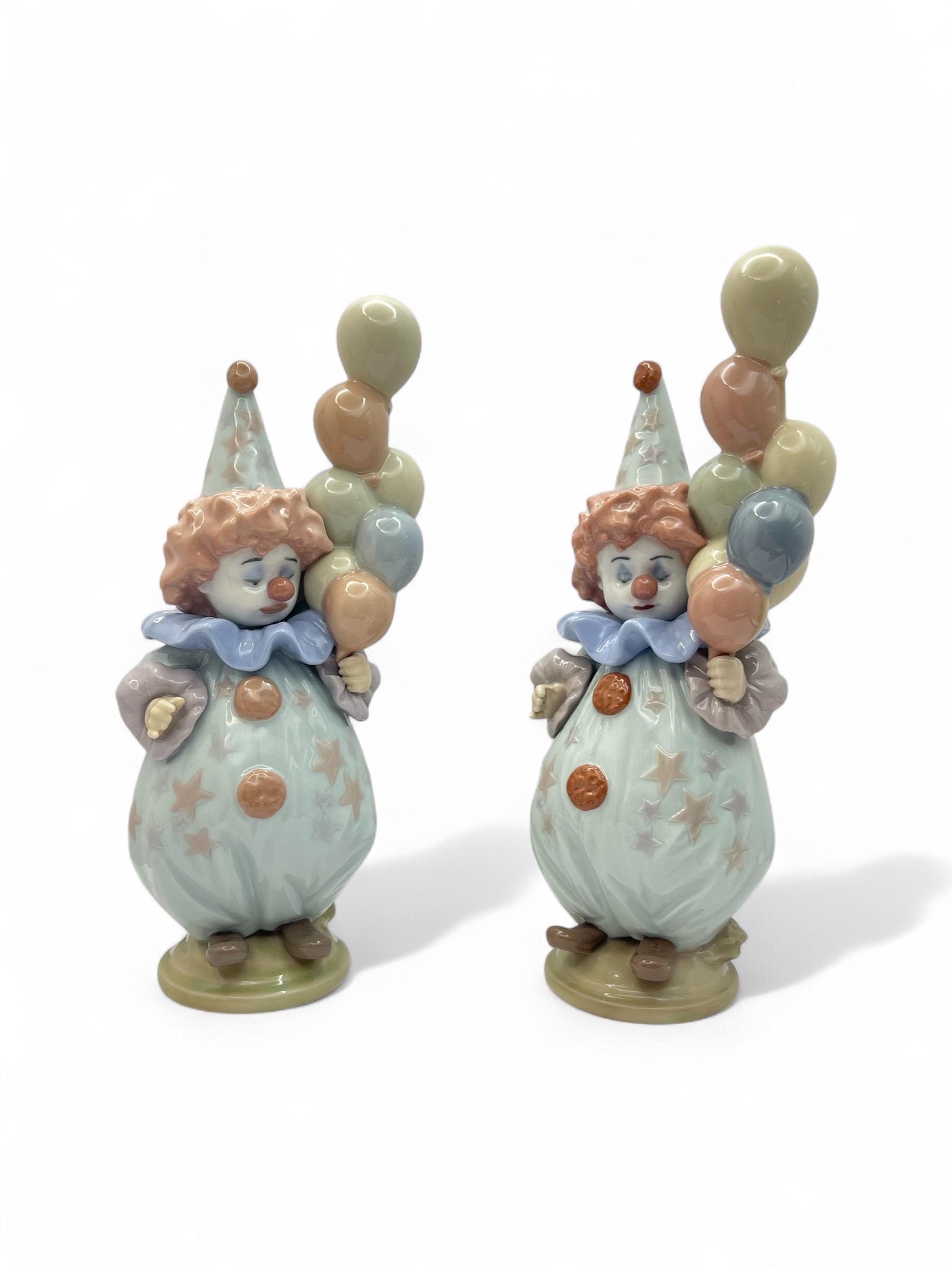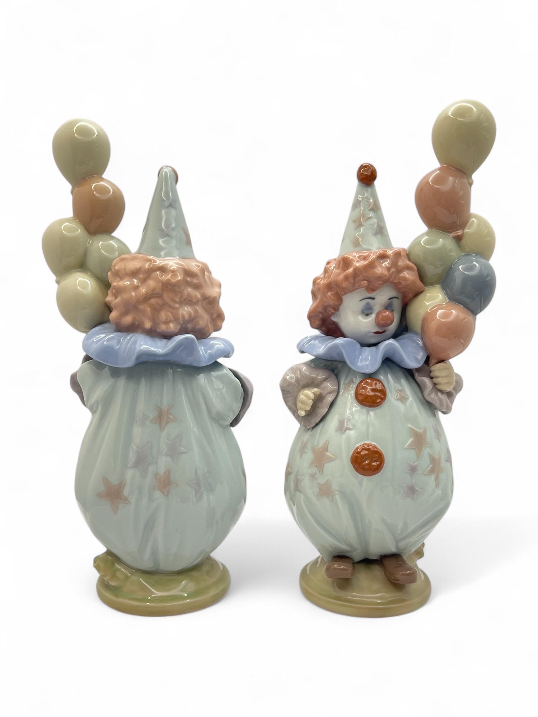 A refined and charming pair of vintage Lladro porcelain figurines, each meticulously hand-crafted and hand-painted in Spain. Featuring two cheerful clowns holding pastel-toned balloons, these pieces reflect Lladro’s signature balance of whimsical subject matter and exquisite craftsmanship.