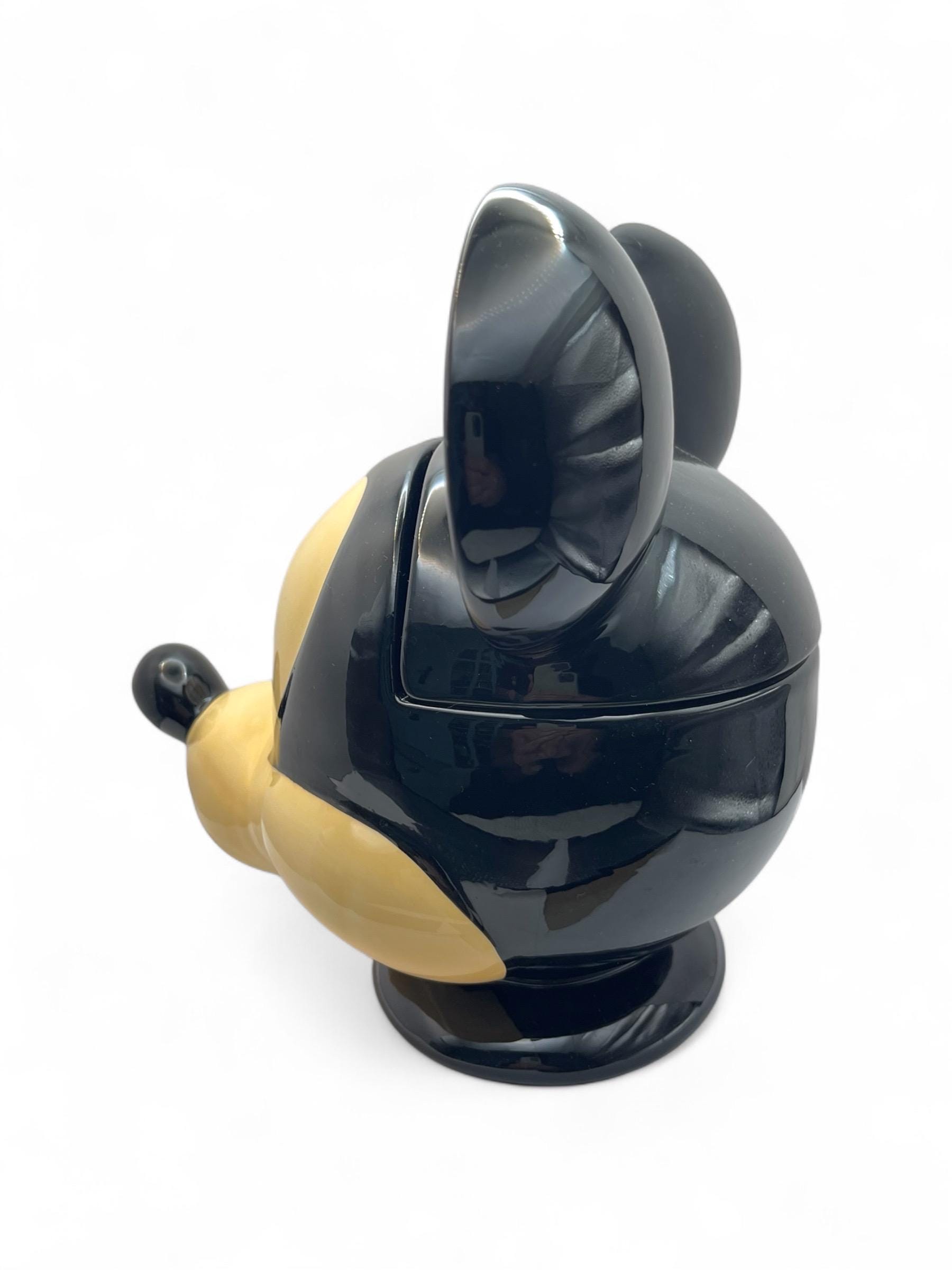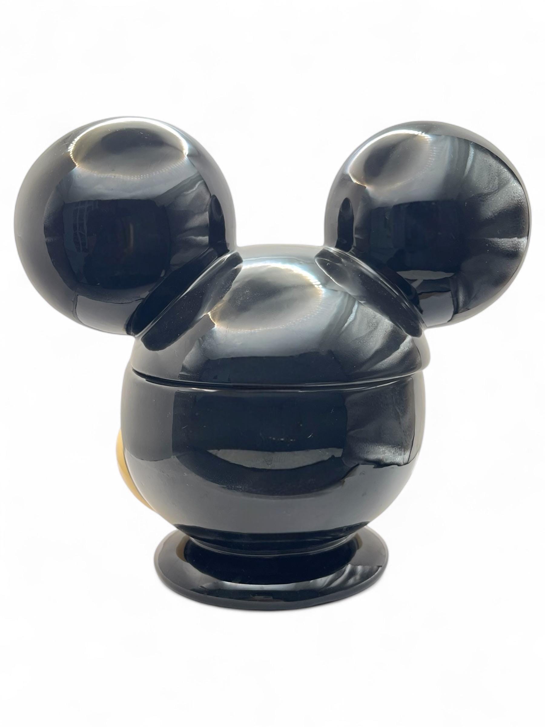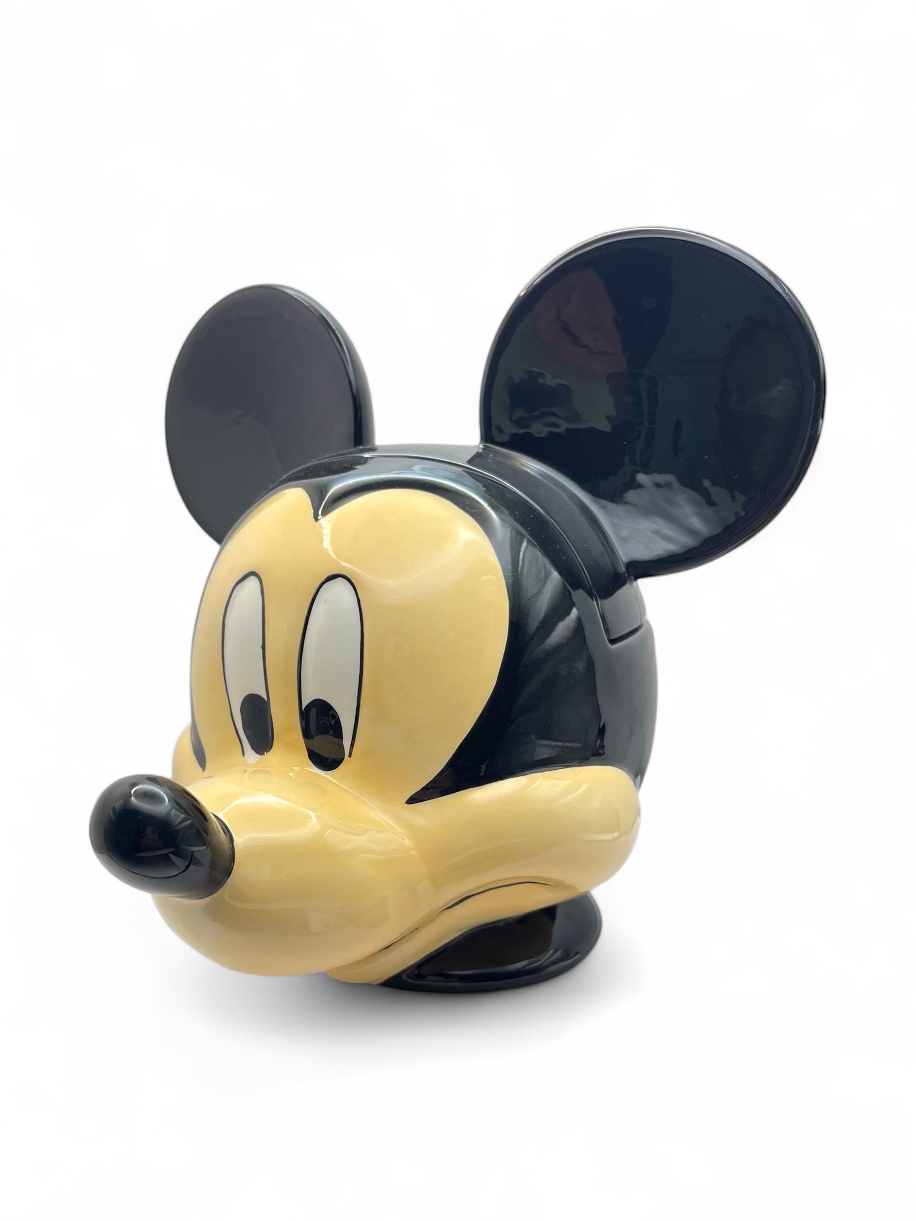 This is a vintage lidded biscuit jar in the form of Mickey Mouse’s iconic head, officially licensed by Disney. Crafted from glossy porcelain with hand-painted features, it functions both as a decorative display piece and a playful storage container. The lid (Mickey’s upper head and ears) lifts off, revealing a hollow interior suitable for storing cookies, biscuits, or small items.