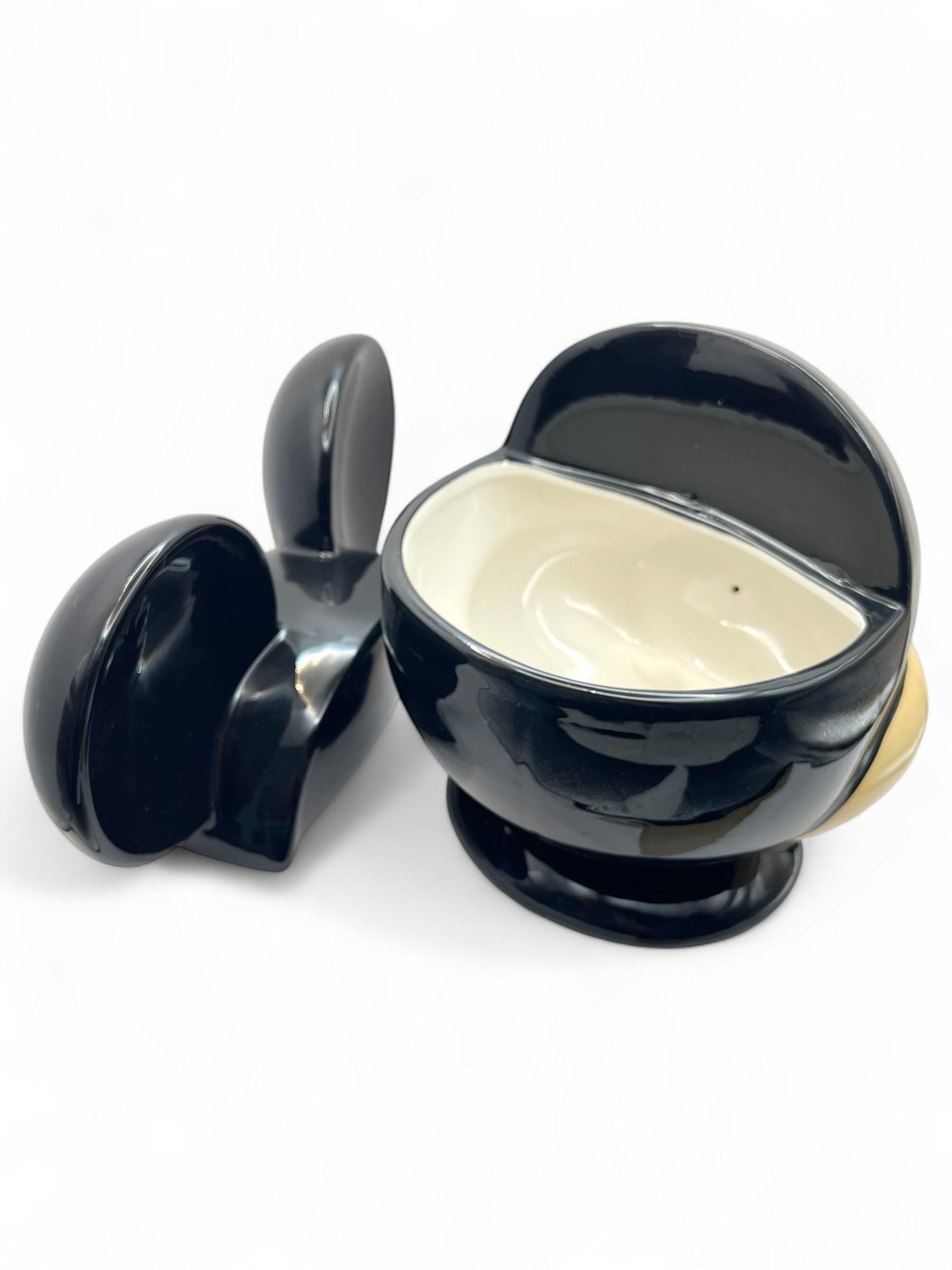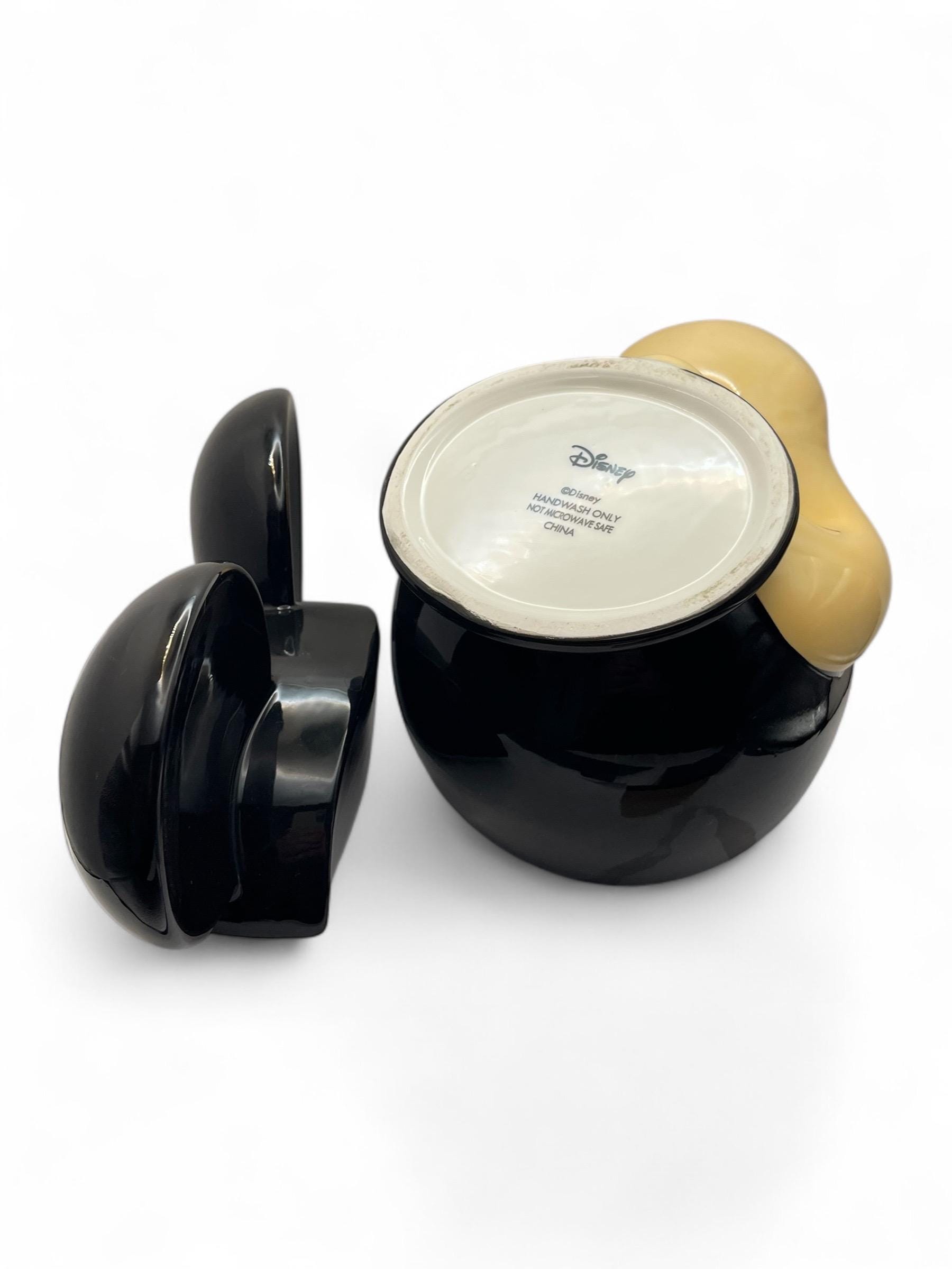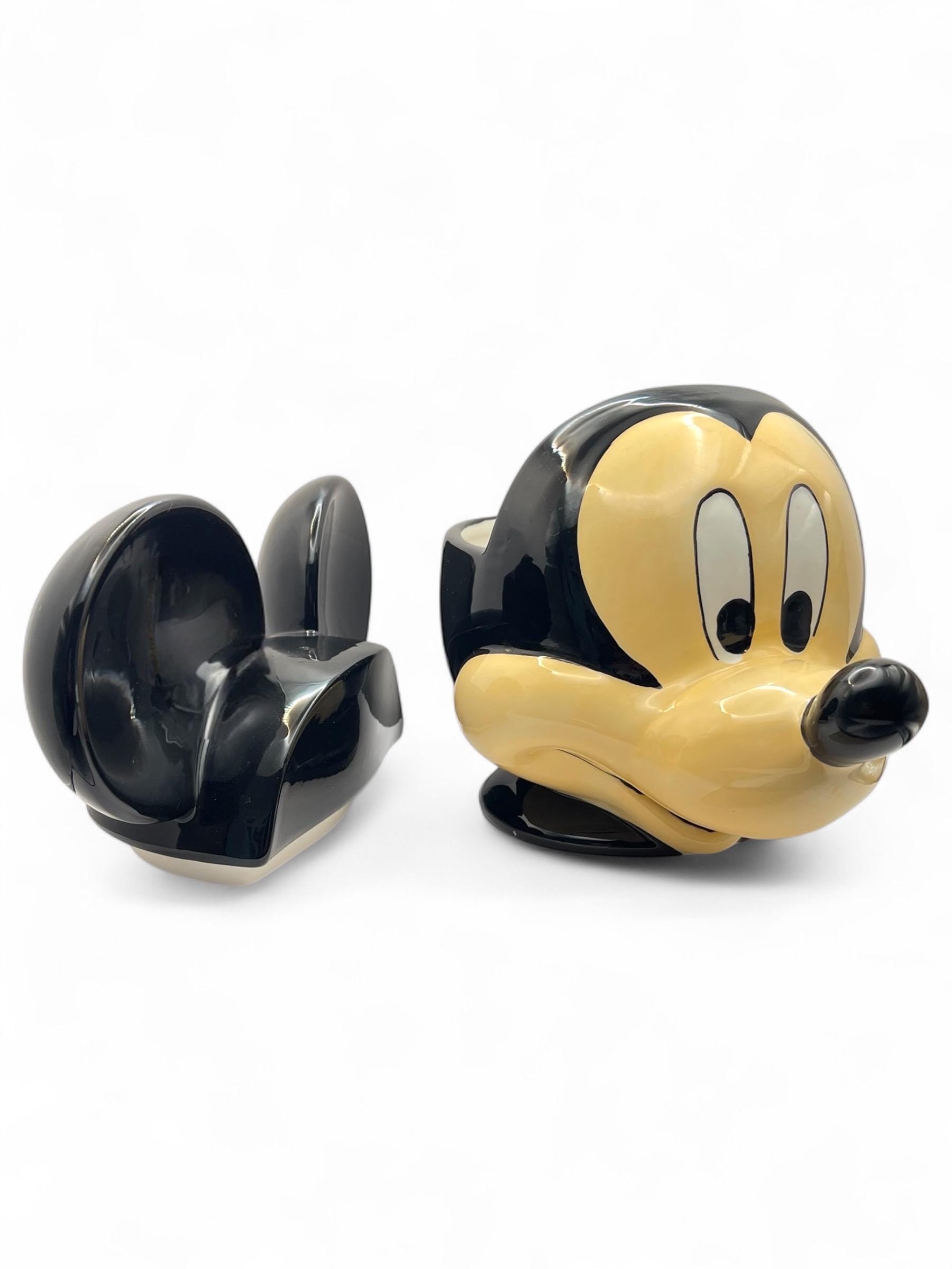 This is a vintage lidded biscuit jar in the form of Mickey Mouse’s iconic head, officially licensed by Disney. Crafted from glossy porcelain with hand-painted features, it functions both as a decorative display piece and a playful storage container. The lid (Mickey’s upper head and ears) lifts off, revealing a hollow interior suitable for storing cookies, biscuits, or small items.