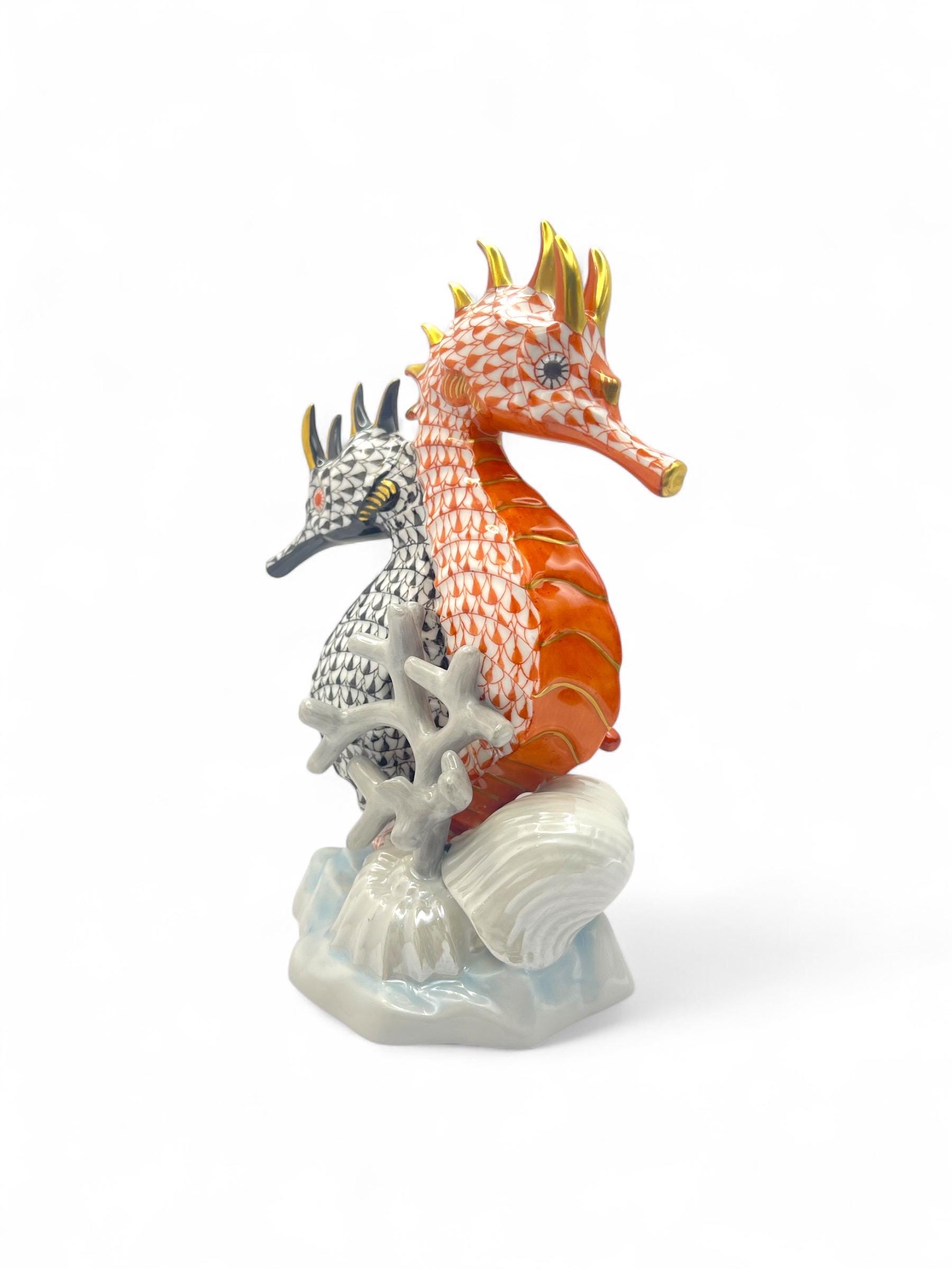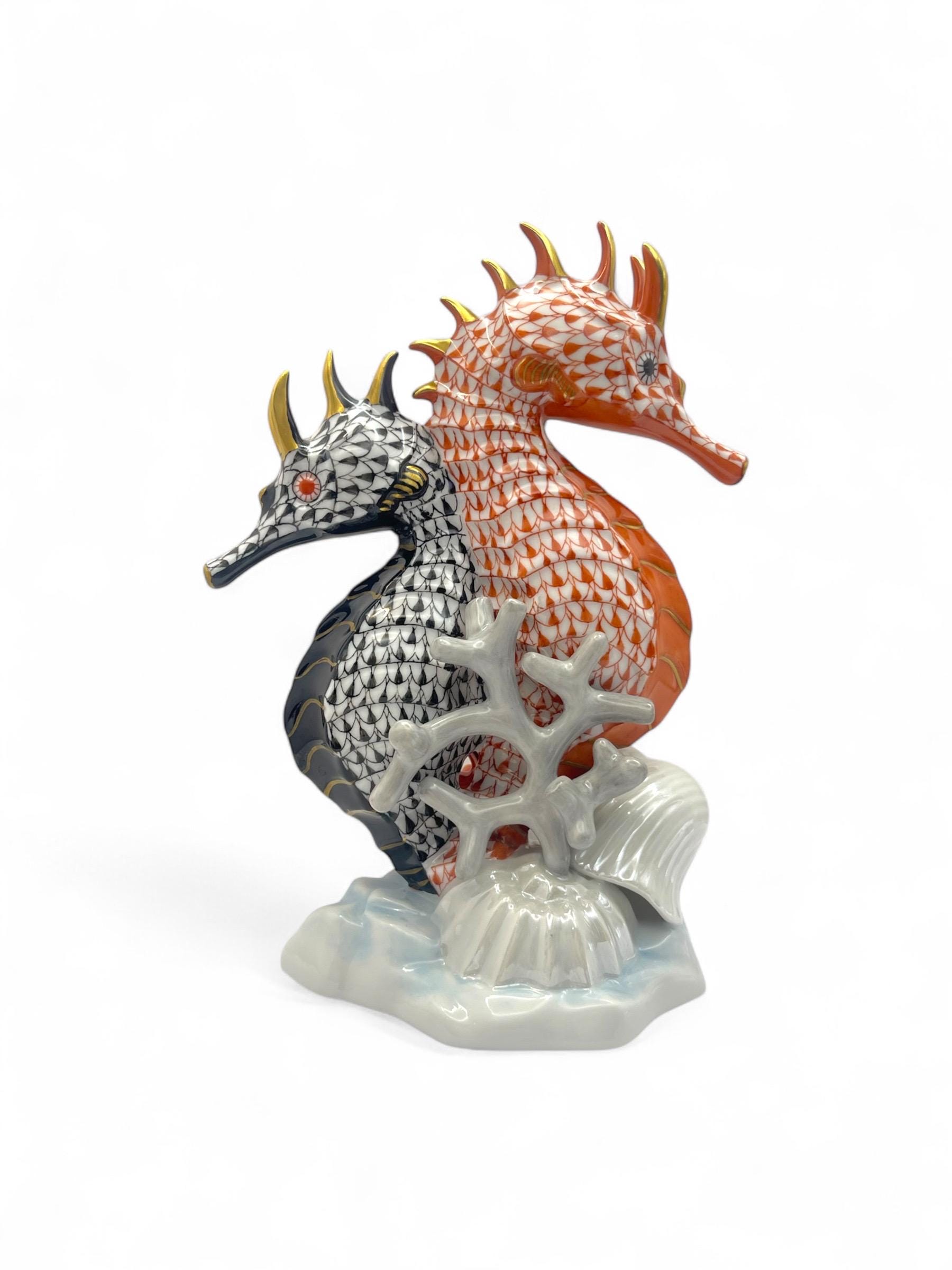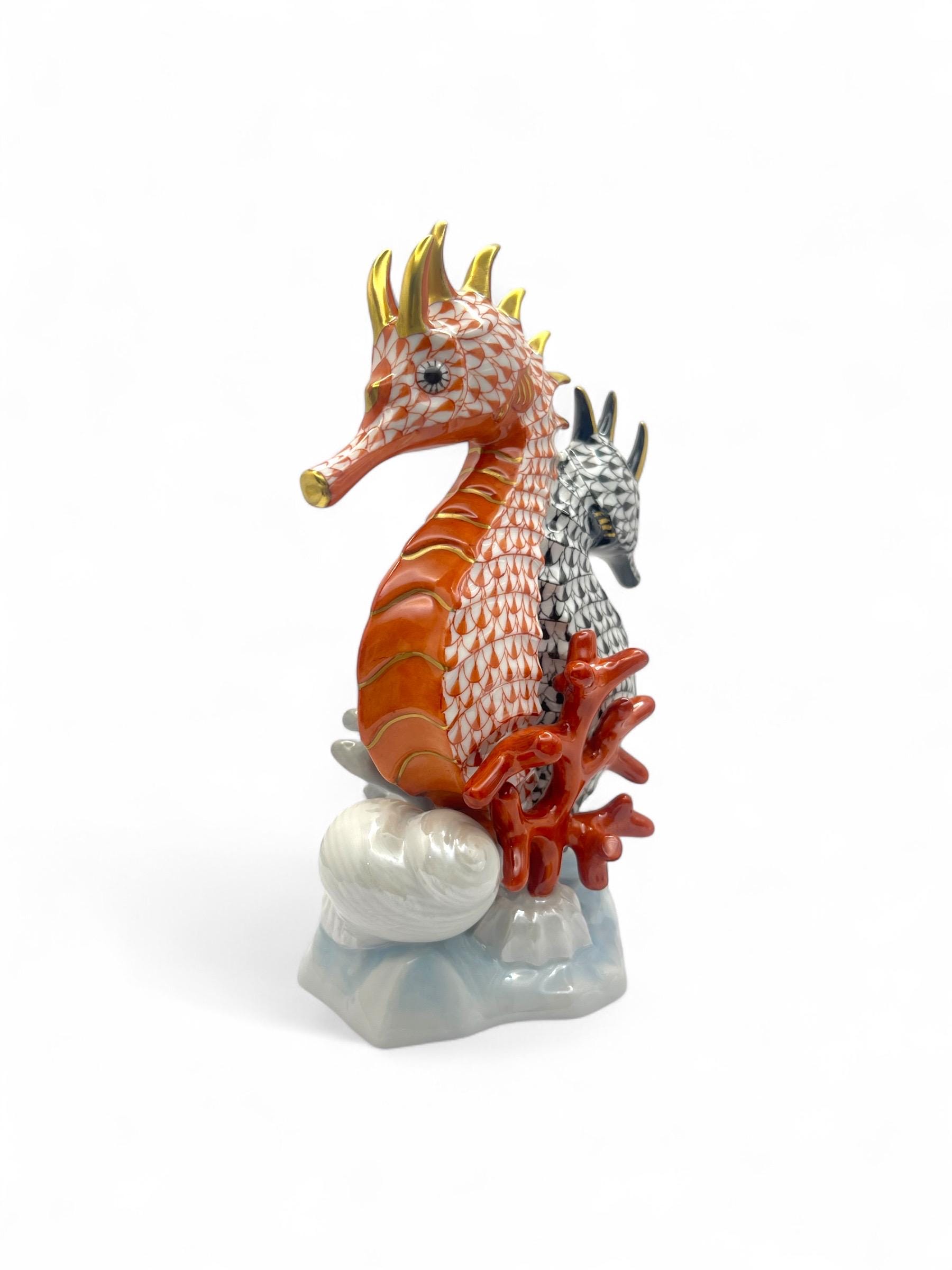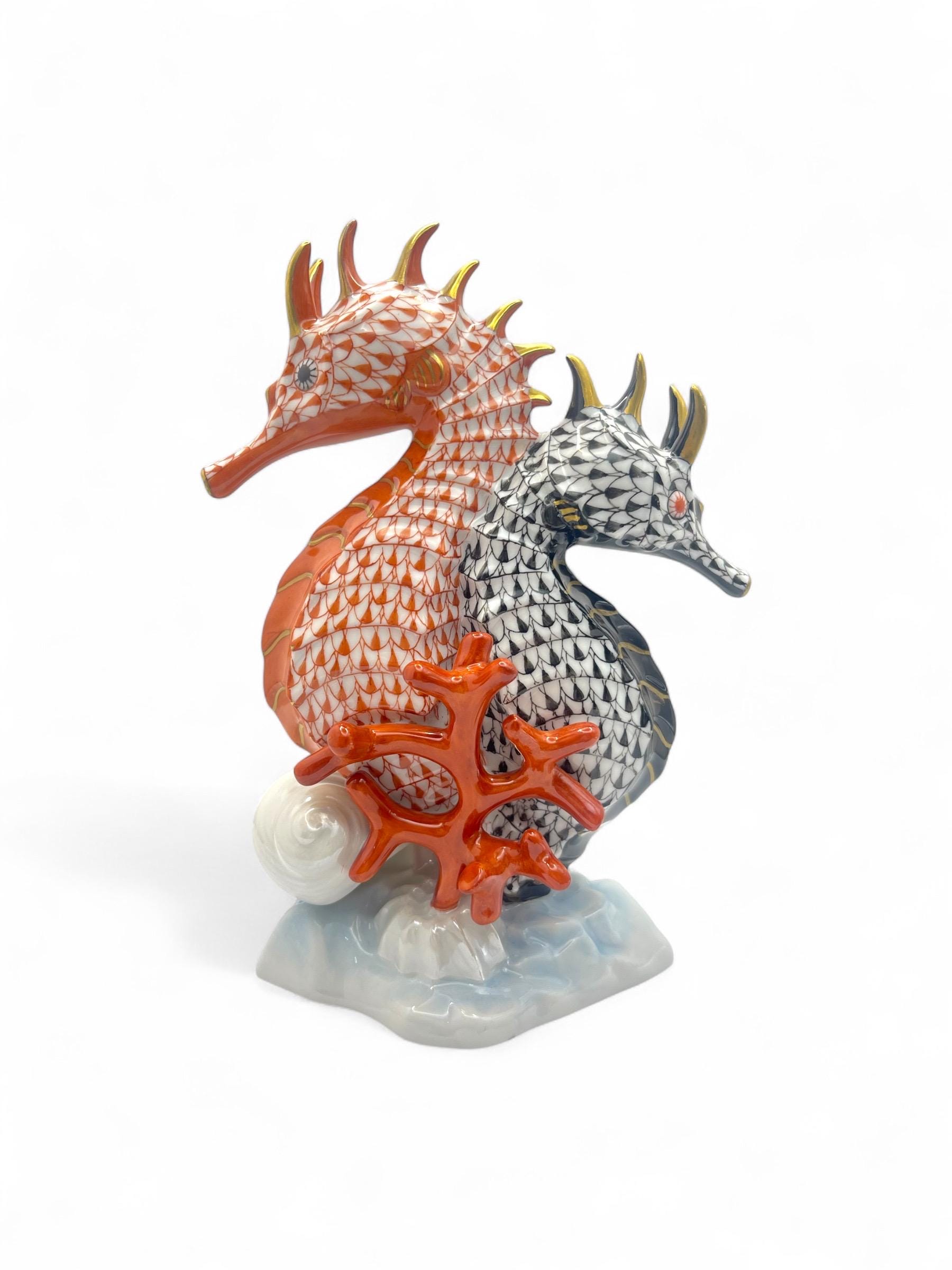 This exquisite Herend porcelain sculpture features a pair of seahorses, gracefully intertwined in the brand’s signature Fishnet pattern. One figure is finished in vibrant orange, the other in deep black, each accented with gold detailing. They are surrounded by hand-sculpted coral and seashell motifs, all resting on a softly glazed wave base.