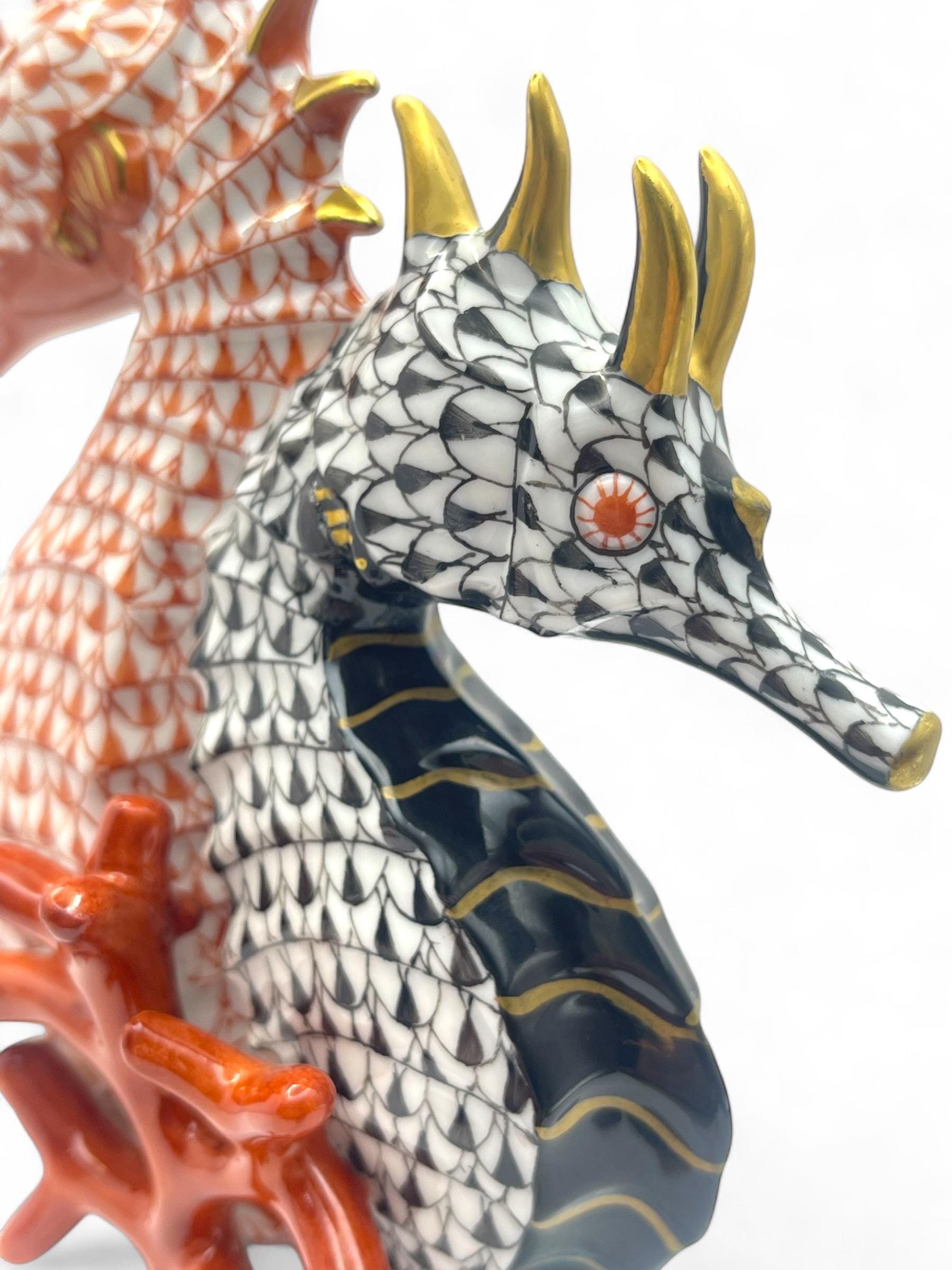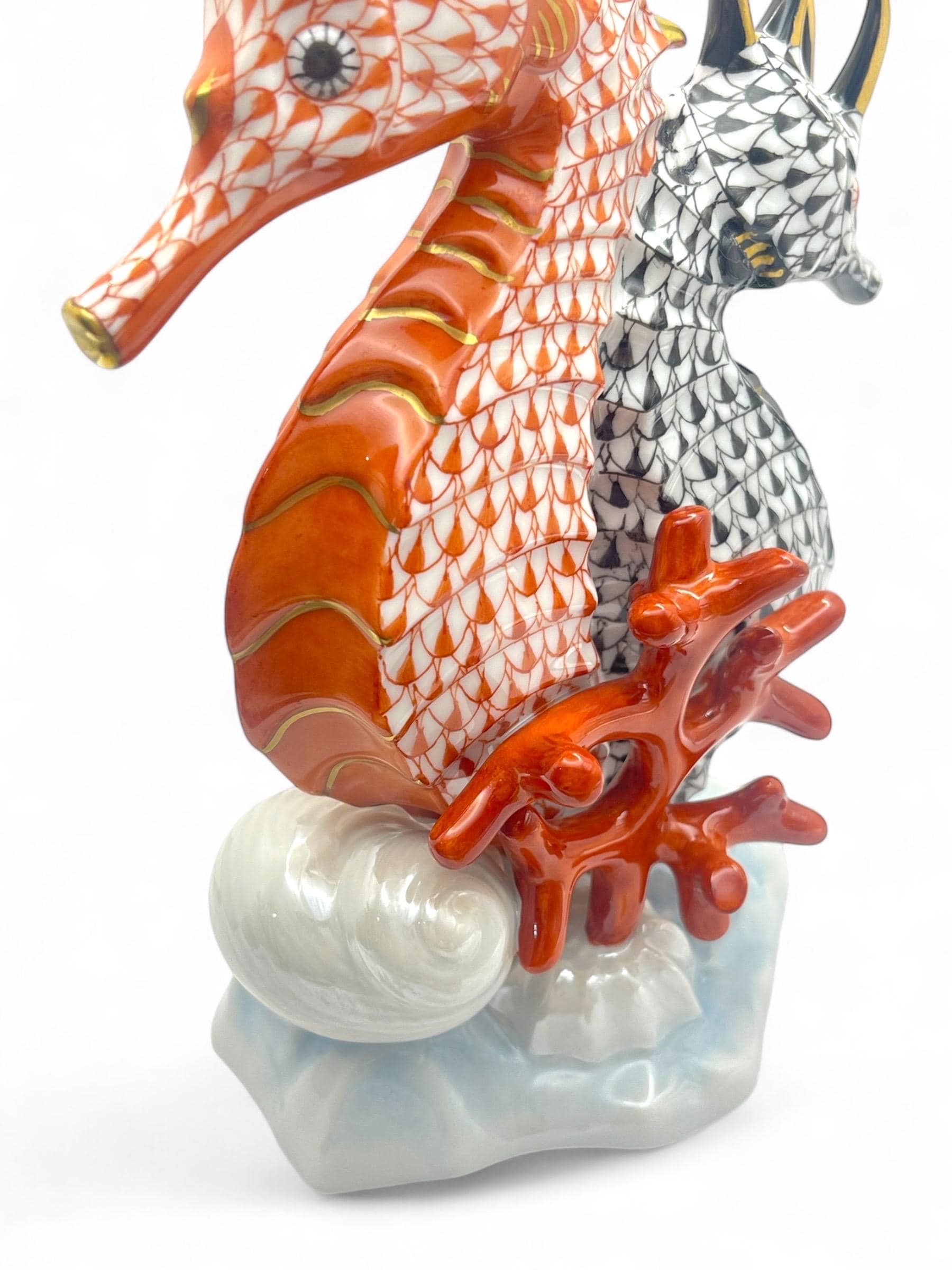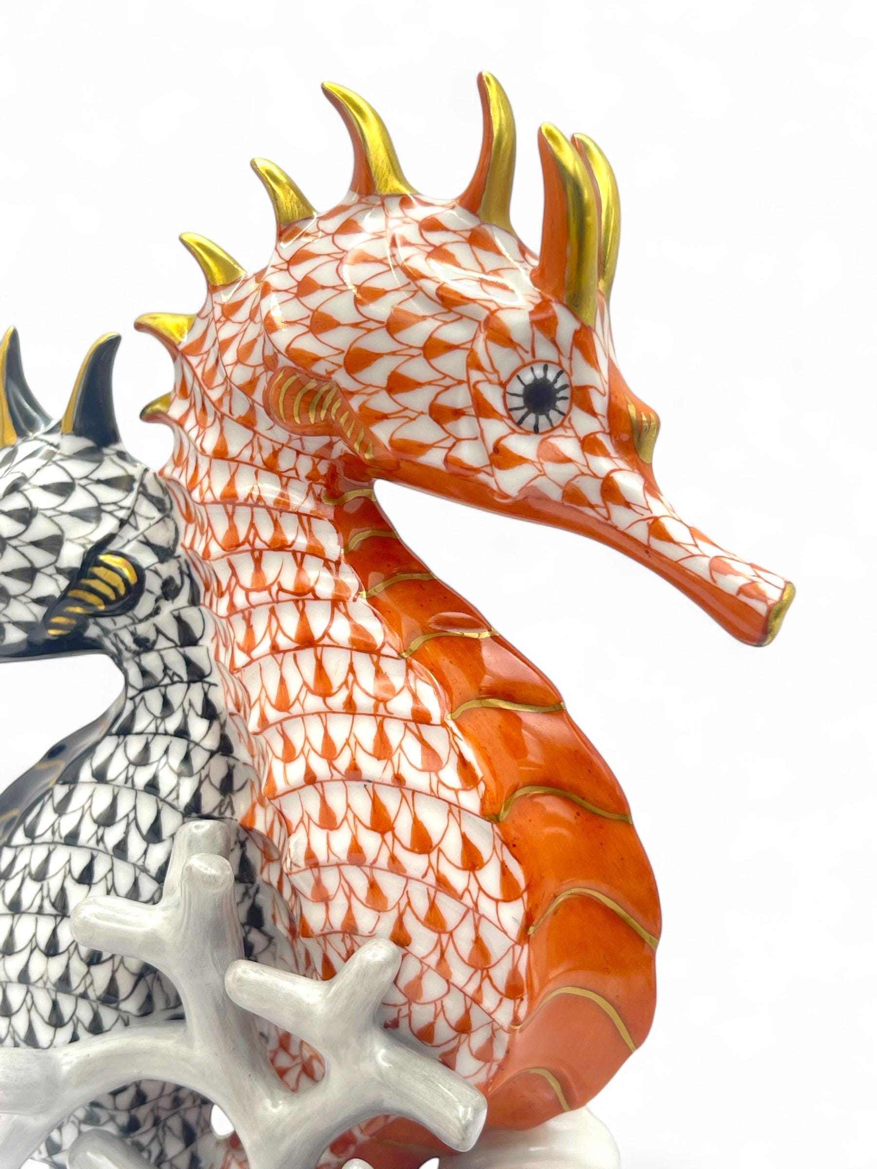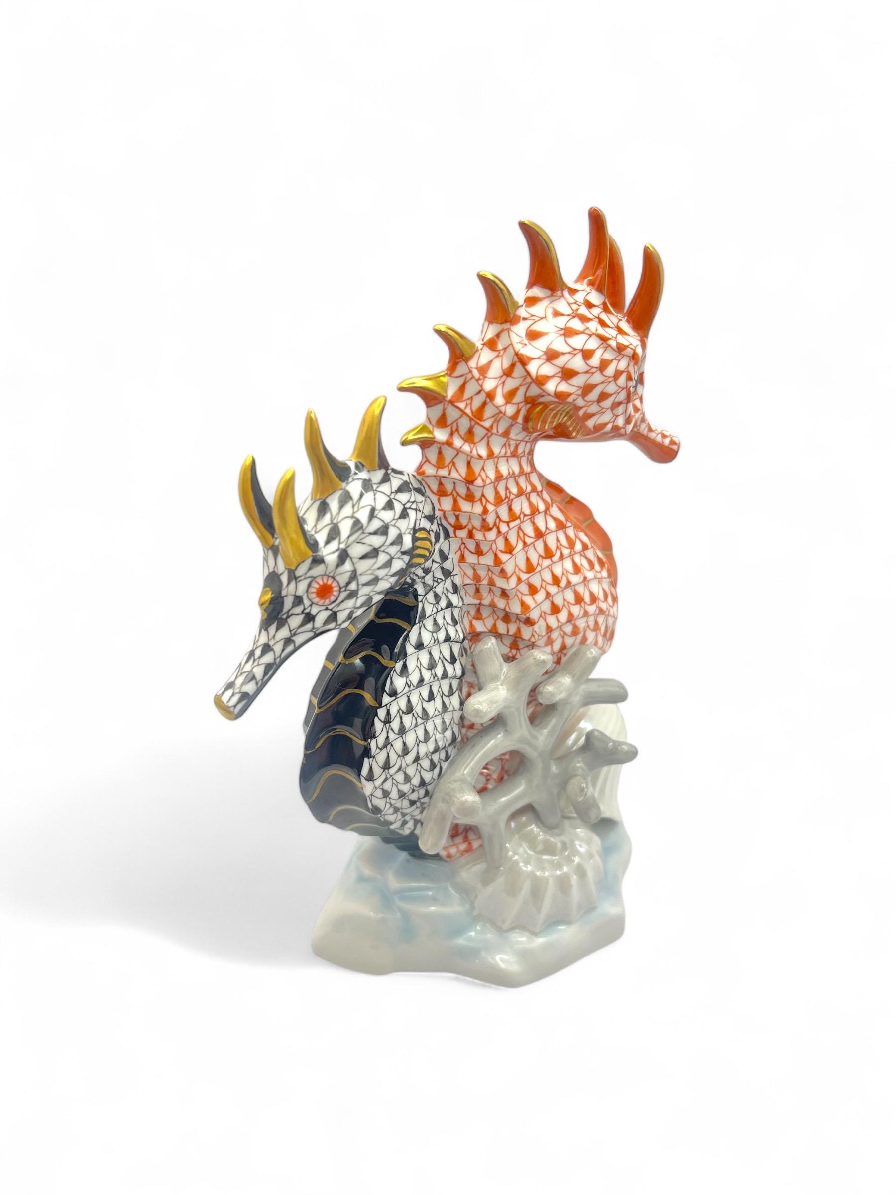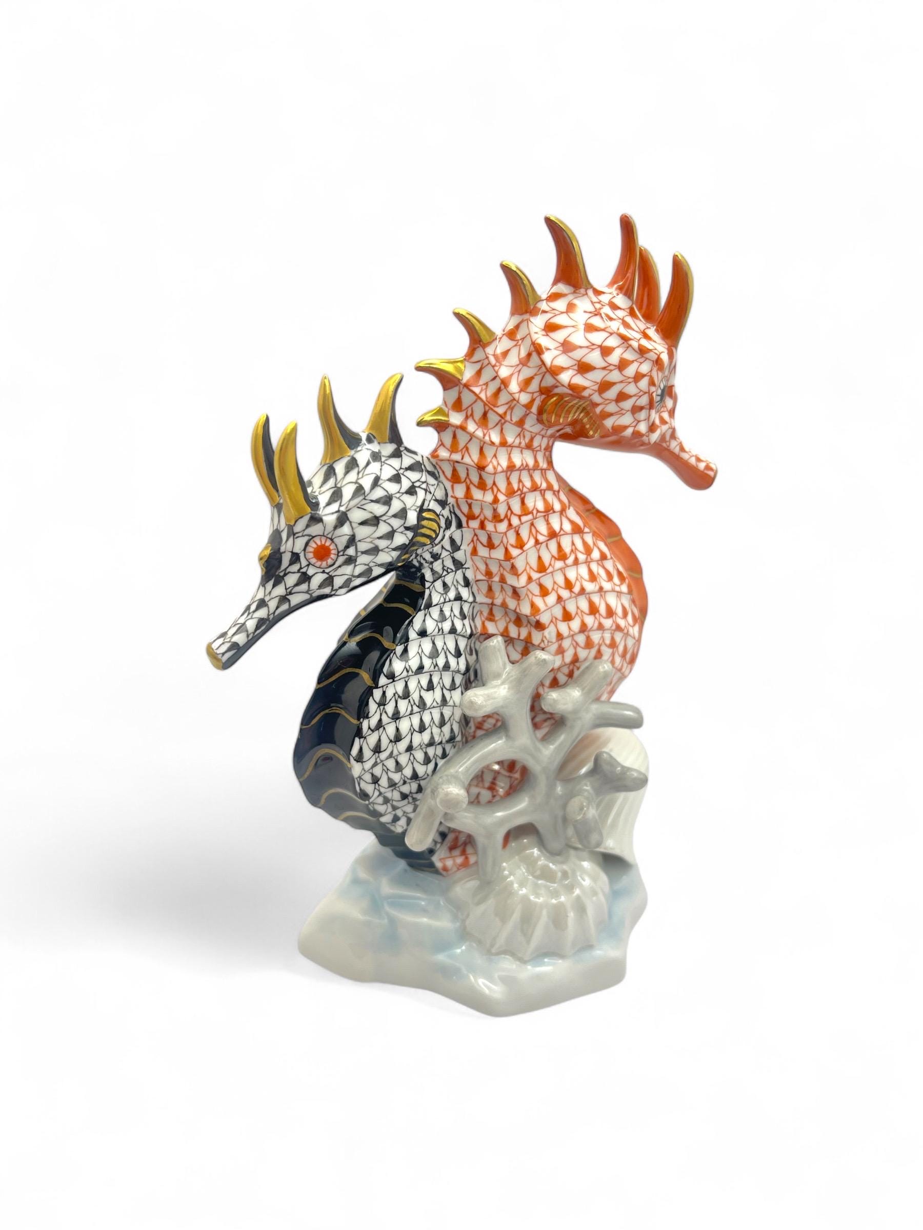 This exquisite Herend porcelain sculpture features a pair of seahorses, gracefully intertwined in the brand’s signature Fishnet pattern. One figure is finished in vibrant orange, the other in deep black, each accented with gold detailing. They are surrounded by hand-sculpted coral and seashell motifs, all resting on a softly glazed wave base.