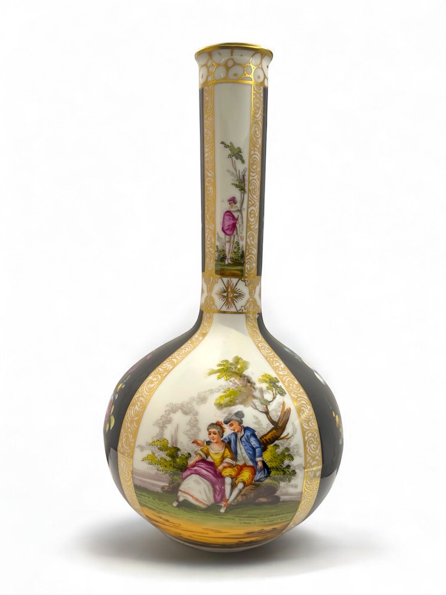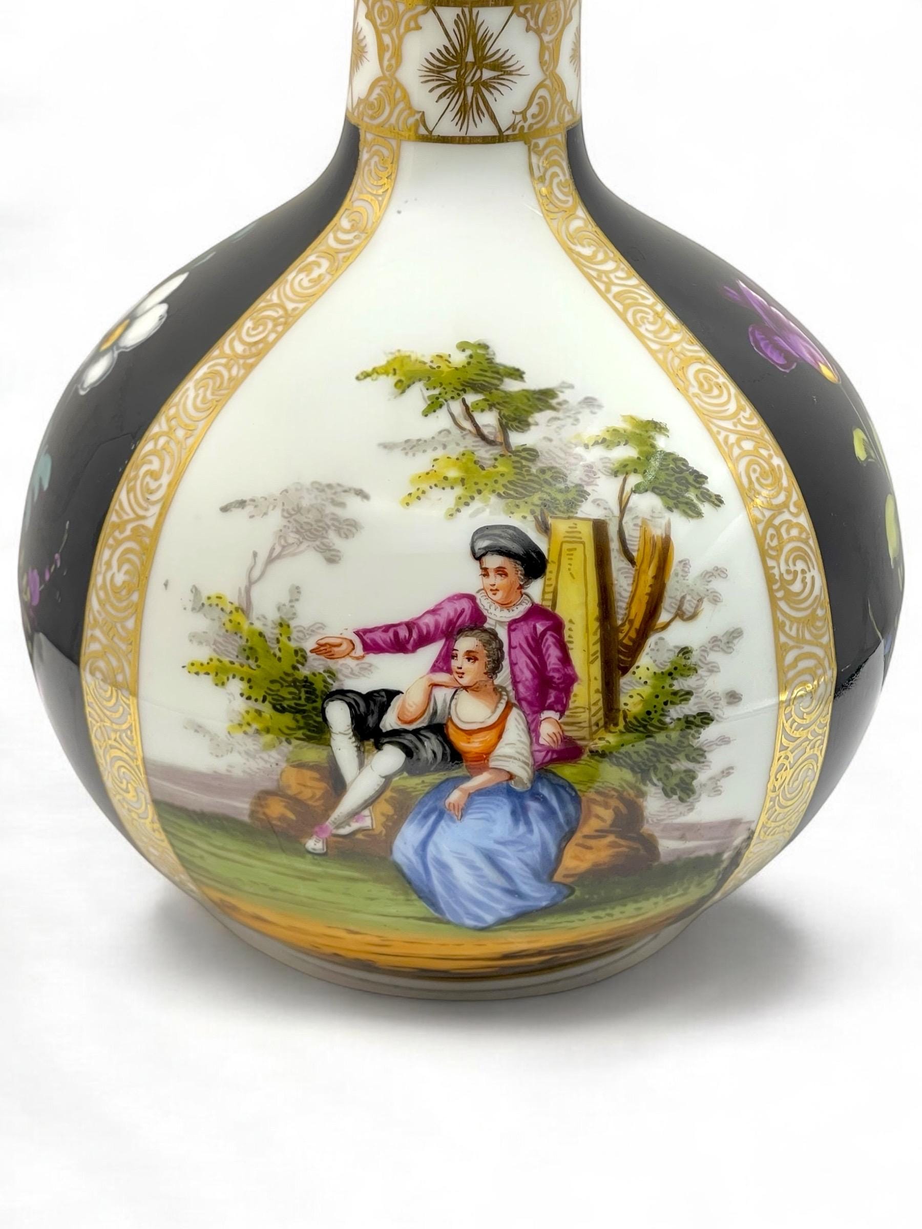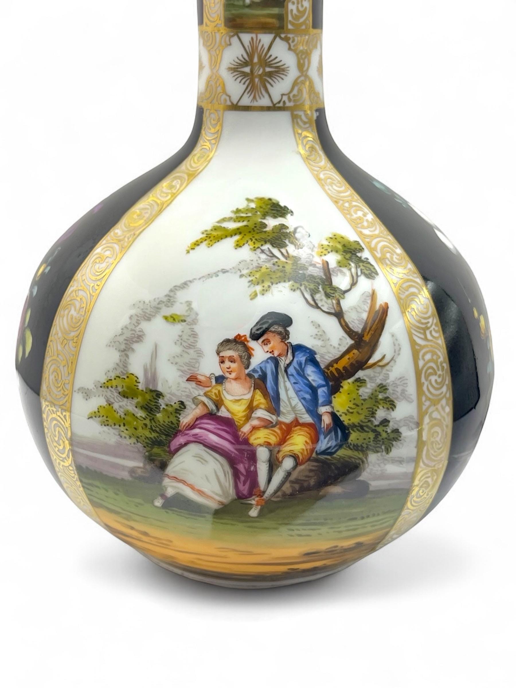 Superbly Hand-Painted in Multiple Panels Each side of the bulbous base features alternating romantic courting scenes and botanical floral bouquets, framed by intricate raised gold scrollwork and bordered by elongated painted figural panels that extend gracefully up the neck. The contrast between the deep black and ivory white grounds enhances the clarity and elegance of each hand-rendered motif.