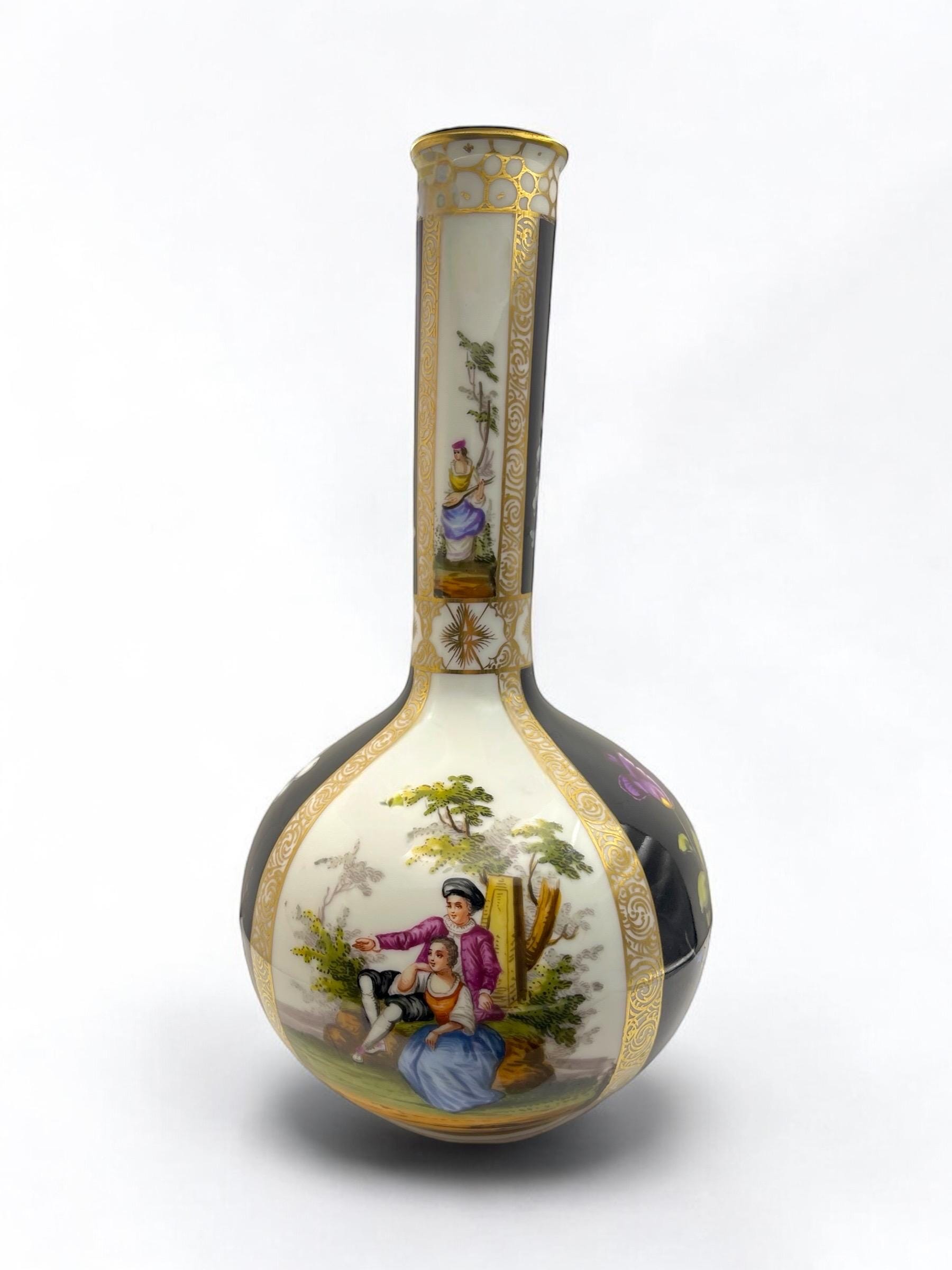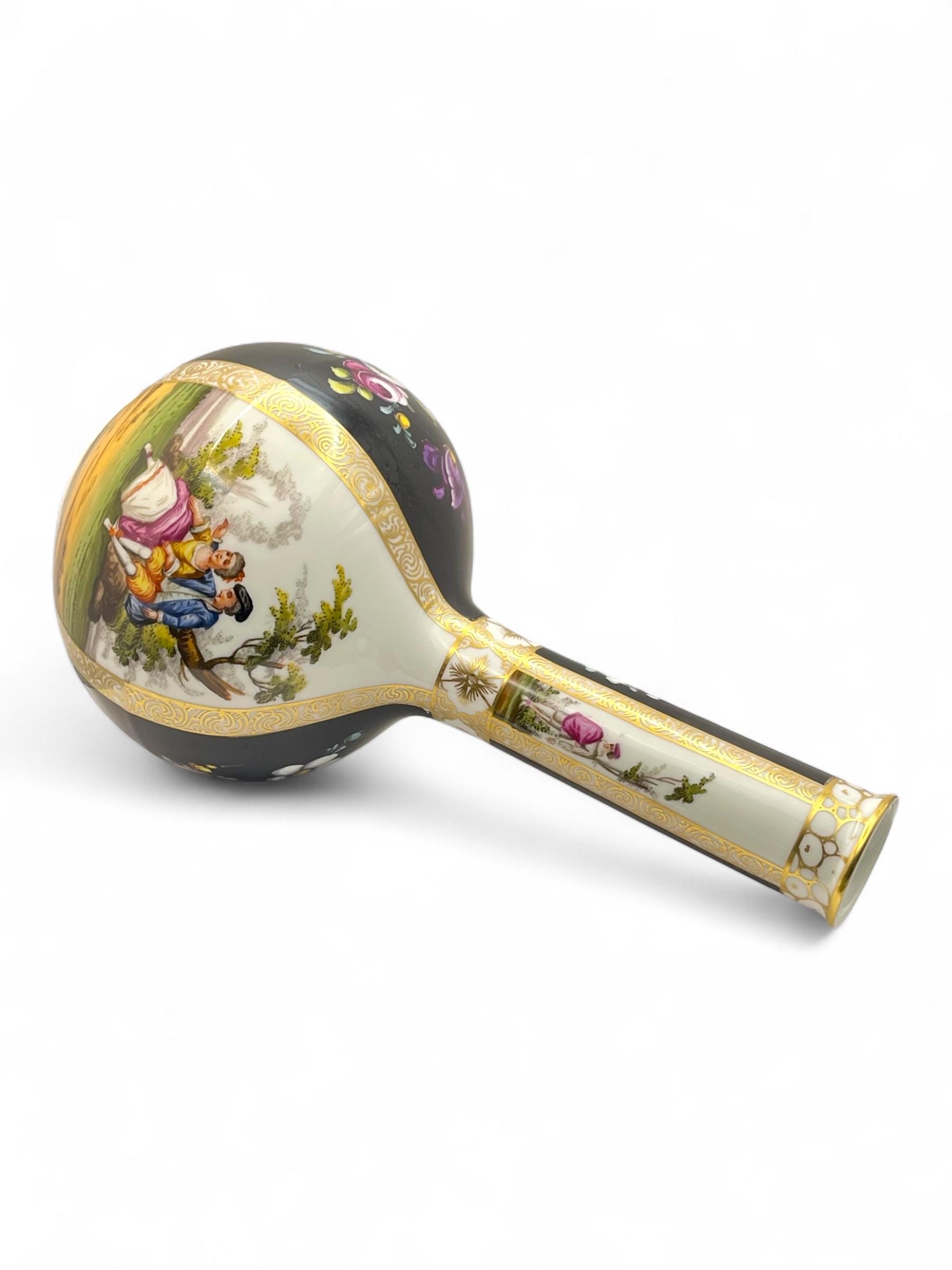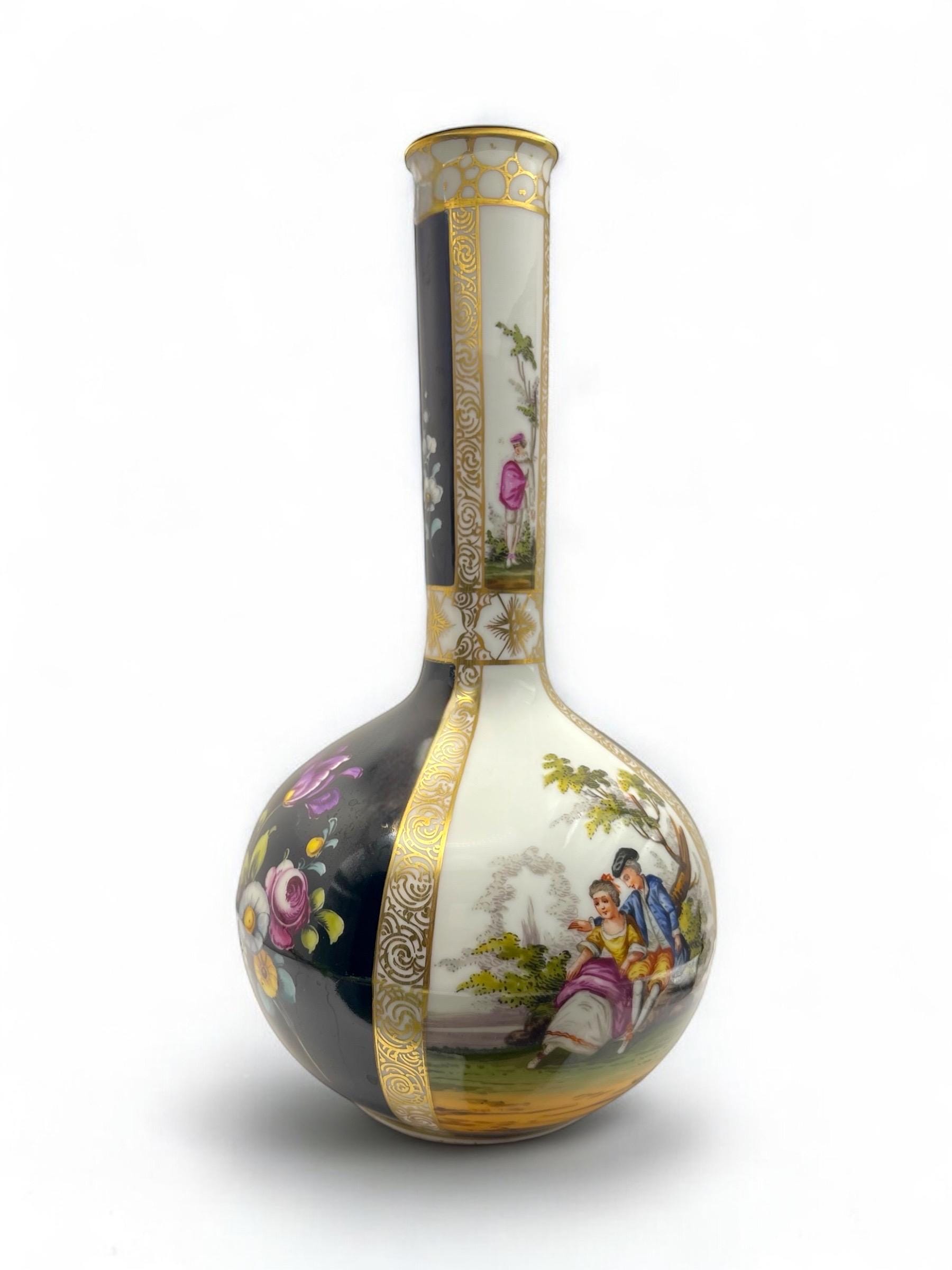 Superbly Hand-Painted in Multiple Panels Each side of the bulbous base features alternating romantic courting scenes and botanical floral bouquets, framed by intricate raised gold scrollwork and bordered by elongated painted figural panels that extend gracefully up the neck. The contrast between the deep black and ivory white grounds enhances the clarity and elegance of each hand-rendered motif.