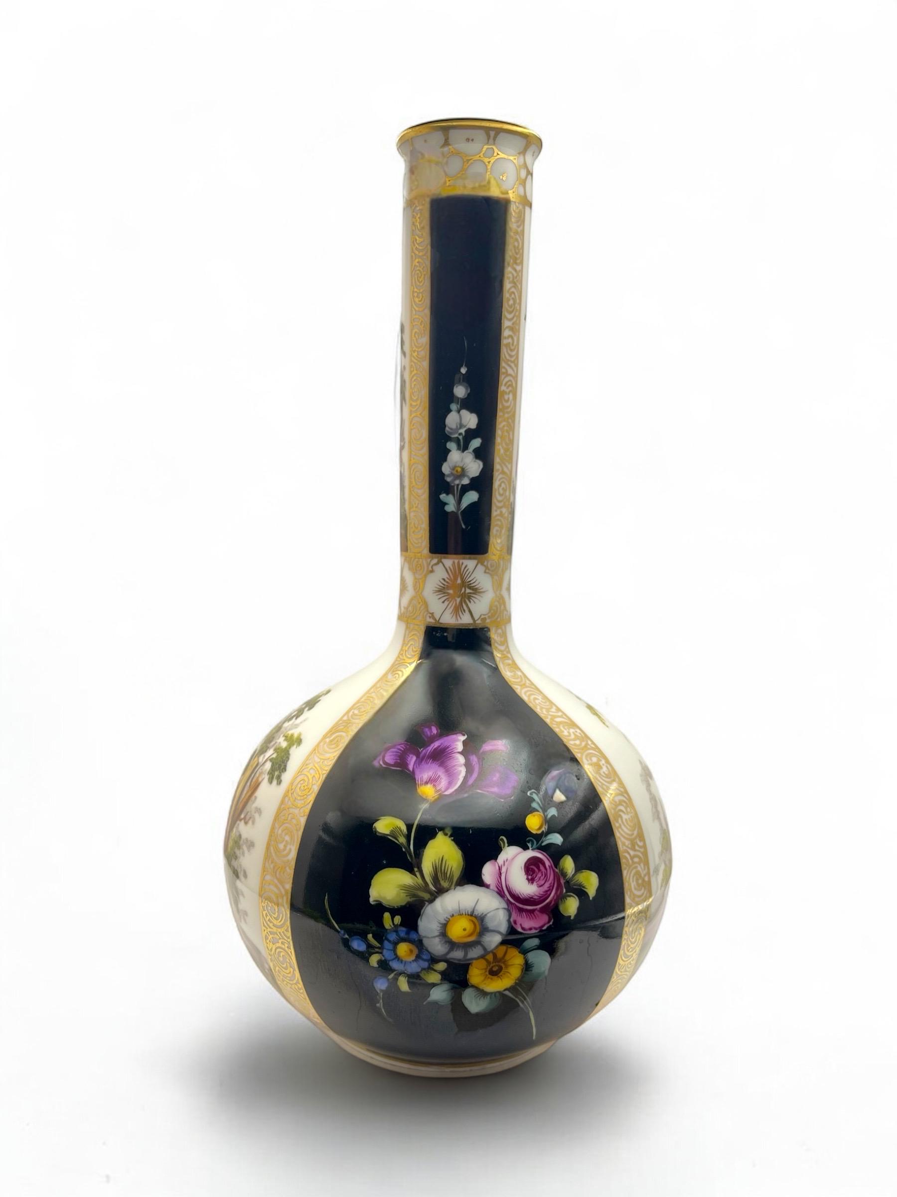 Exquisite 19th Century Dresden Bottle Vase A rare and elegant antique bottle-form vase originating from the renowned porcelain workshops of Dresden, Germany, dating to the mid to late 19th century.