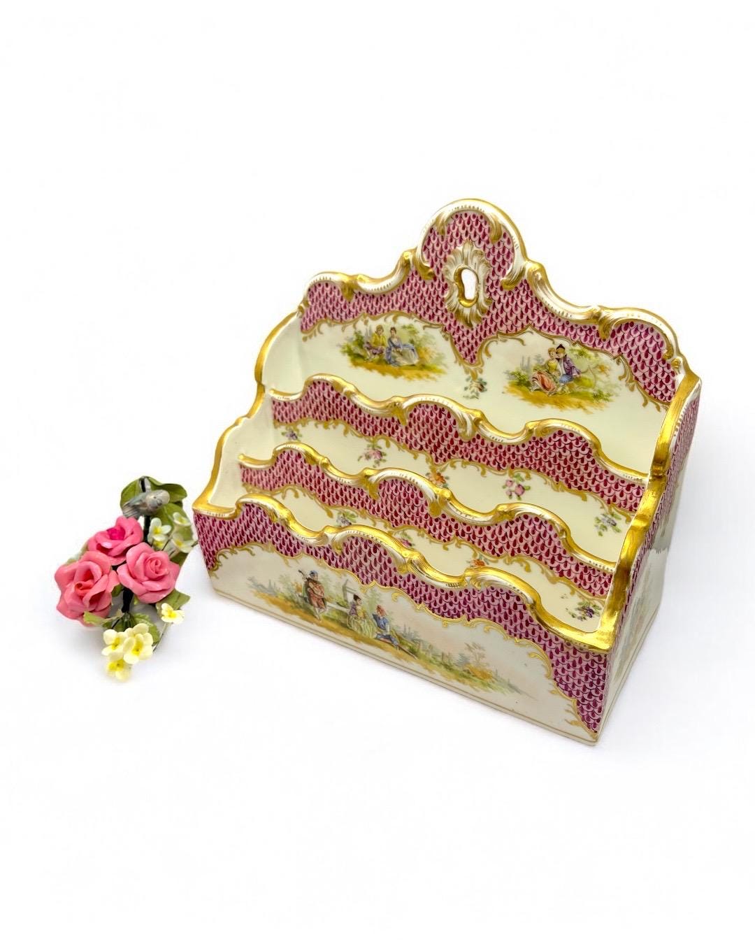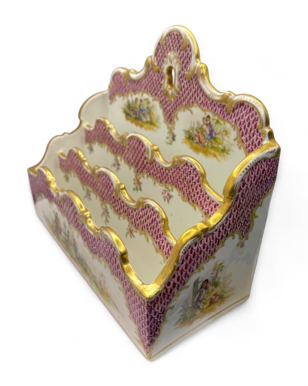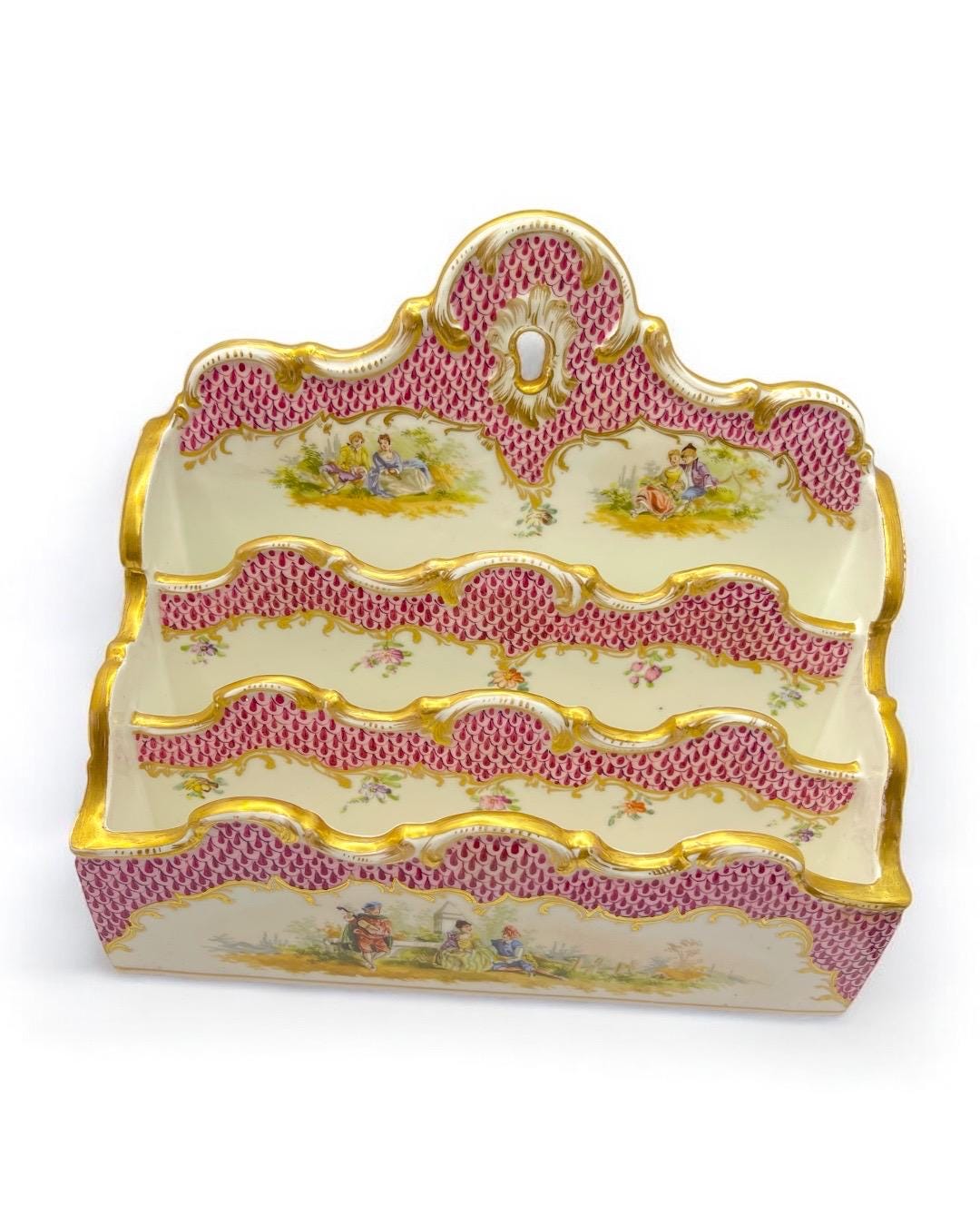 Featuring three tiered compartments, each outlined in raised, scalloped edges gilded in gold, the front and top surfaces are adorned with charming 18th-century courtship scenes rendered in delicate pastel tones. These vignettes, framed in a raspberry-hued fish-scale ground, are interspersed with floral sprays and exquisite gold tracery. The back of the letter holder is also hand-painted with scattered flowers, and a keyhole slot is present for optional wall mounting.