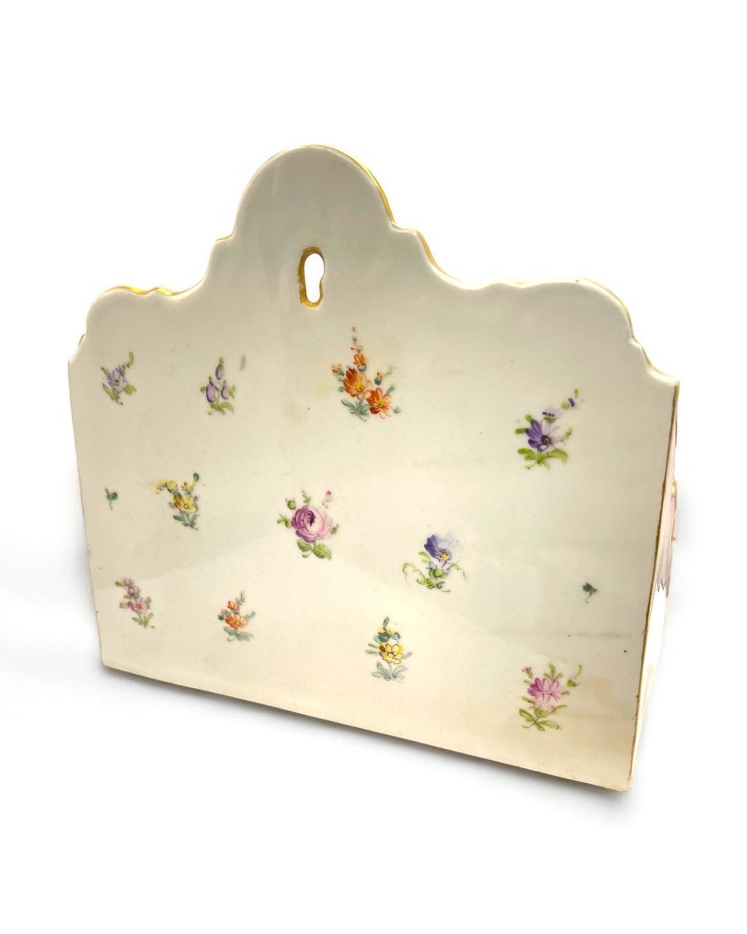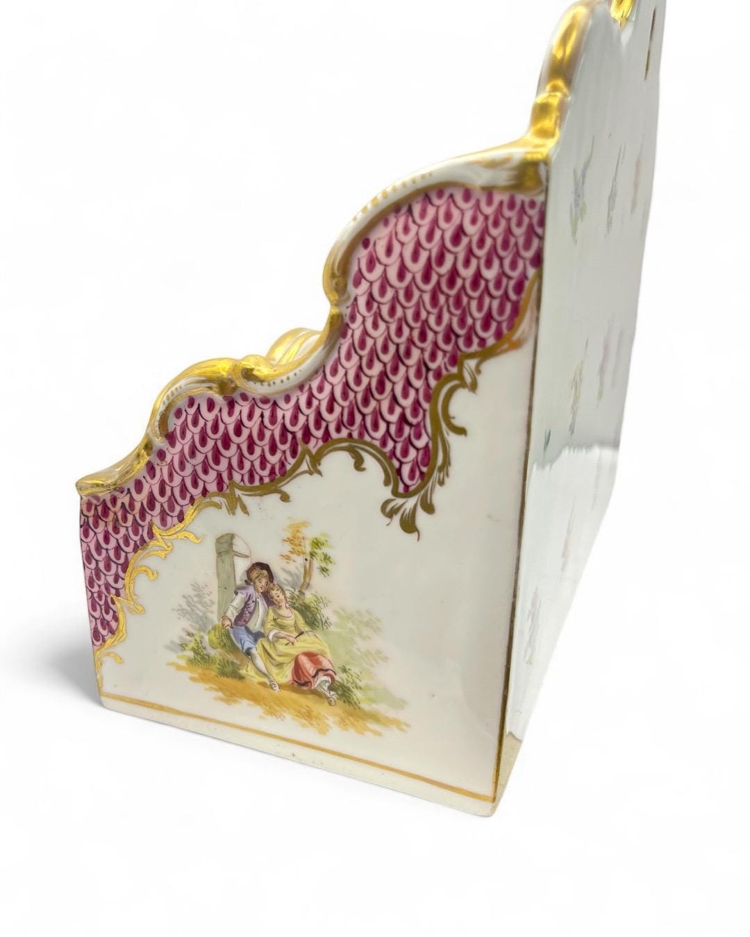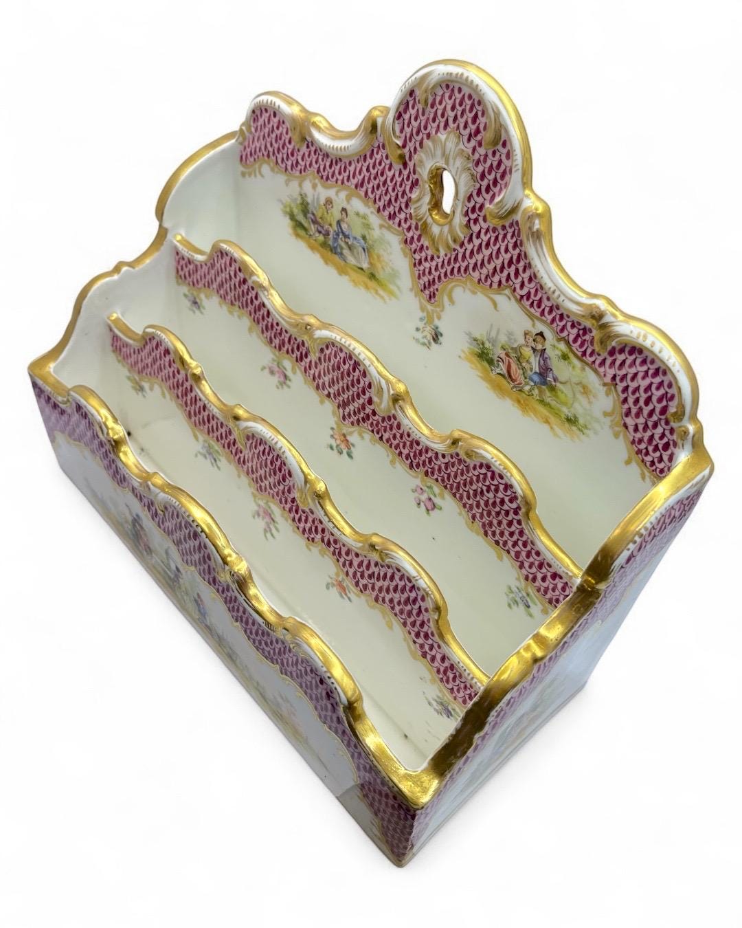 Featuring three tiered compartments, each outlined in raised, scalloped edges gilded in gold, the front and top surfaces are adorned with charming 18th-century courtship scenes rendered in delicate pastel tones. These vignettes, framed in a raspberry-hued fish-scale ground, are interspersed with floral sprays and exquisite gold tracery. The back of the letter holder is also hand-painted with scattered flowers, and a keyhole slot is present for optional wall mounting.