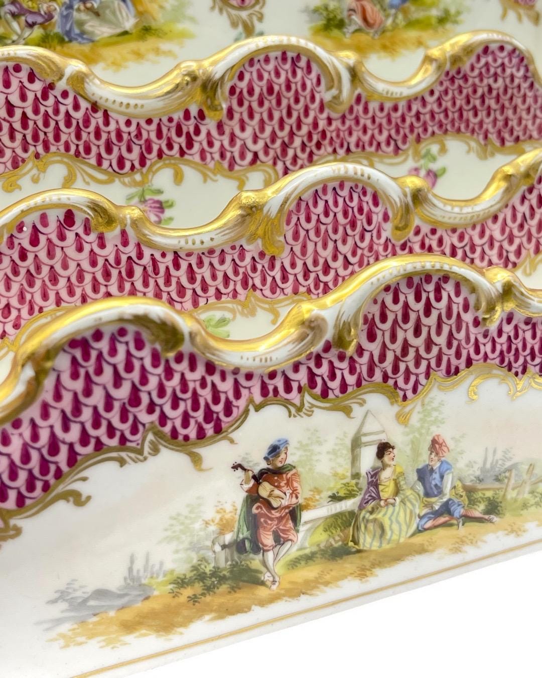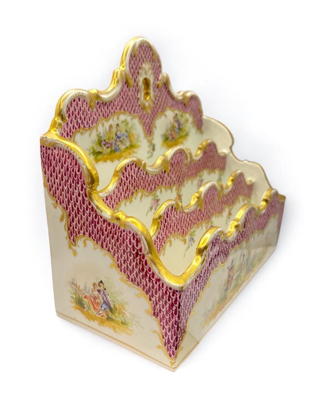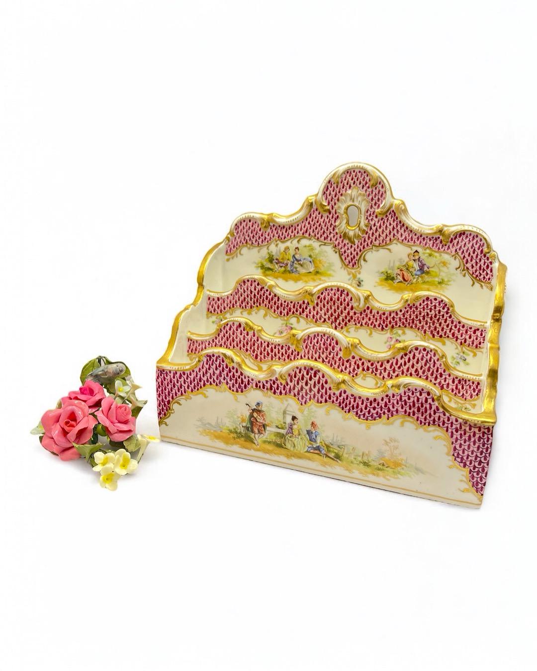 This exquisite antique porcelain letter holder was crafted in Dresden, Germany, by the renowned decorating studio Meyers & Son, active circa 1868–1907. The piece stands as a superb example of late 19th-century Rococo revival artistry, richly hand-painted and lavishly decorated in brilliant detail.