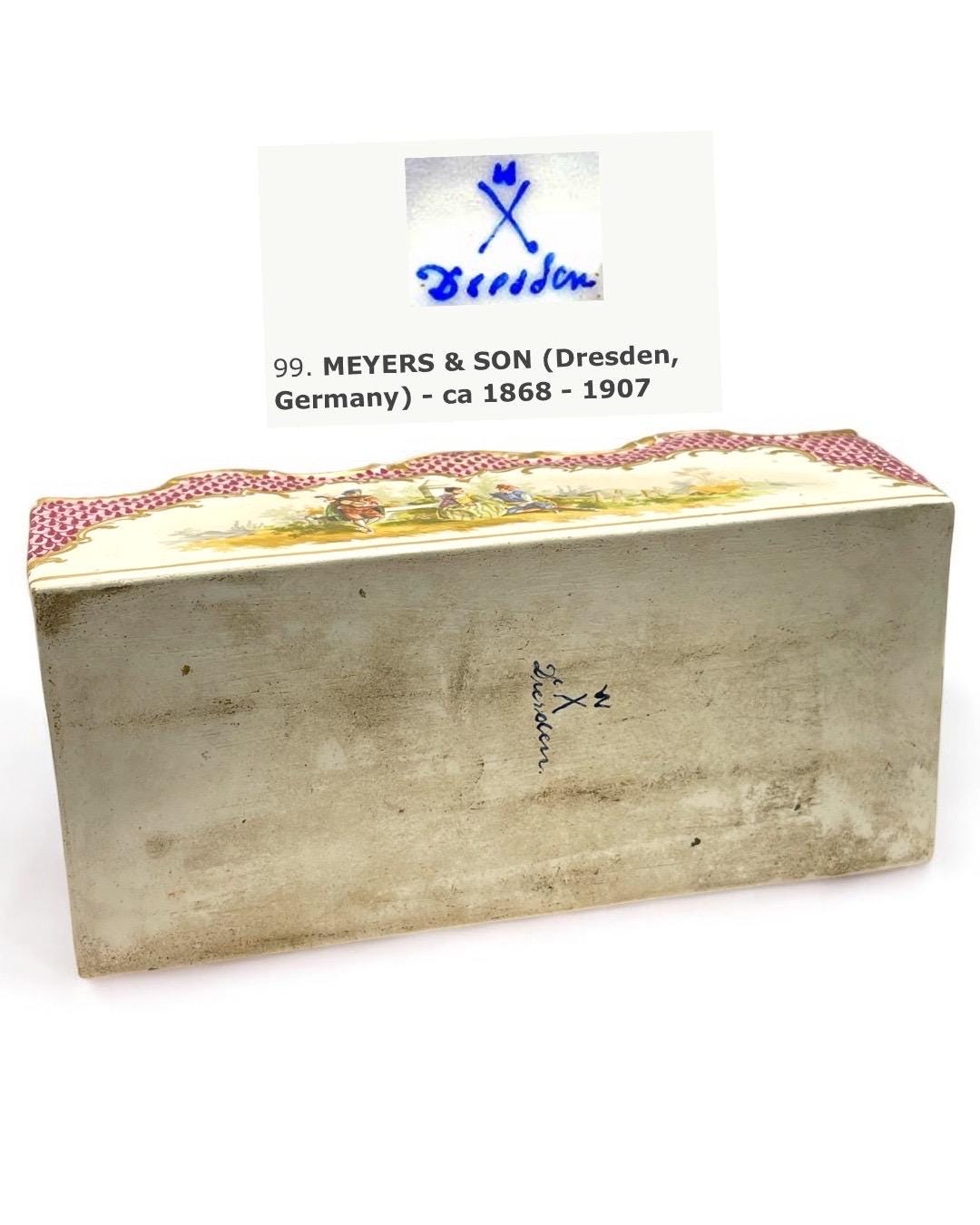 The piece bears the blue crossed swords and “Dresden” mark used by Meyers & Son, confirming its origin in the prestigious Dresden porcelain tradition.