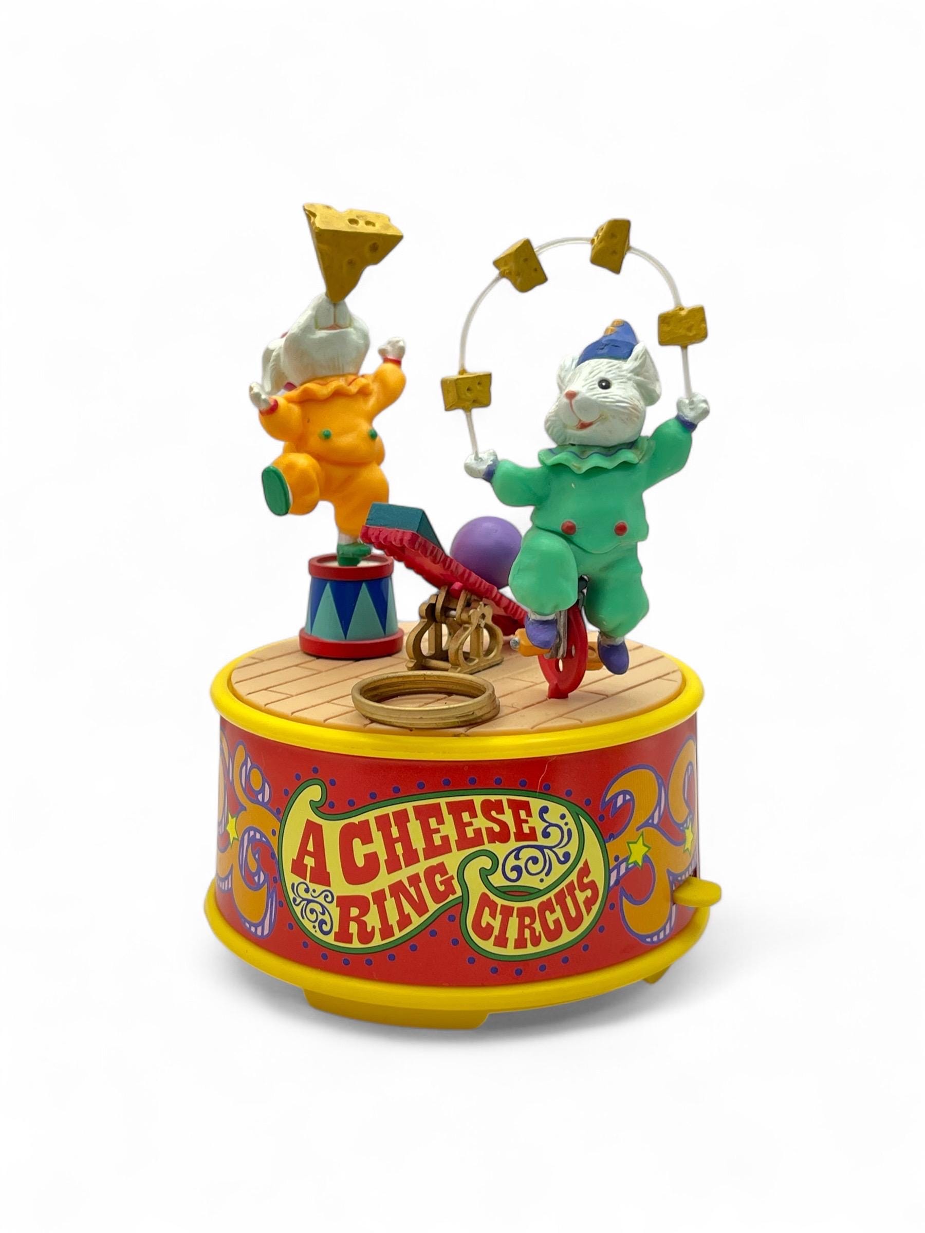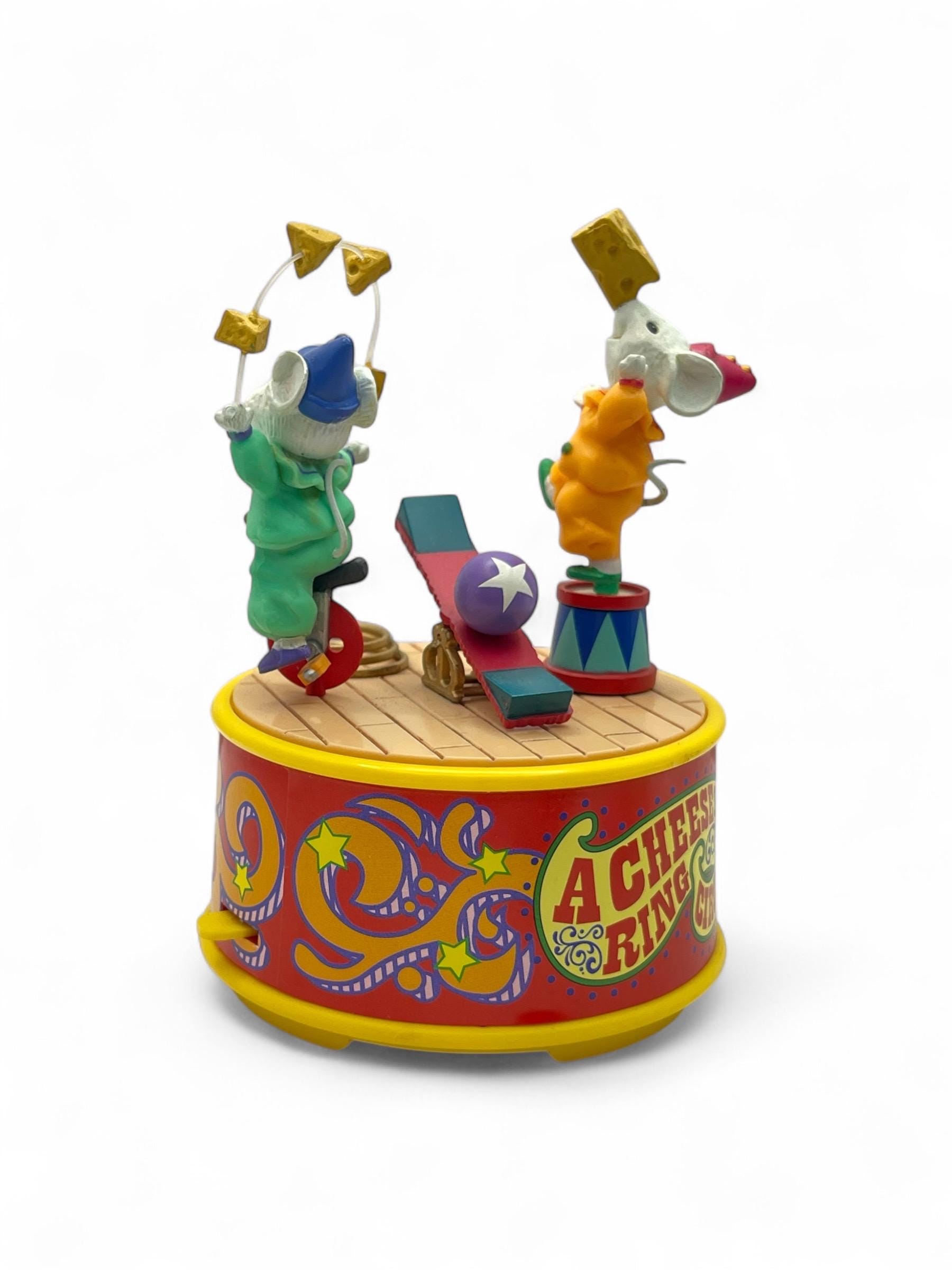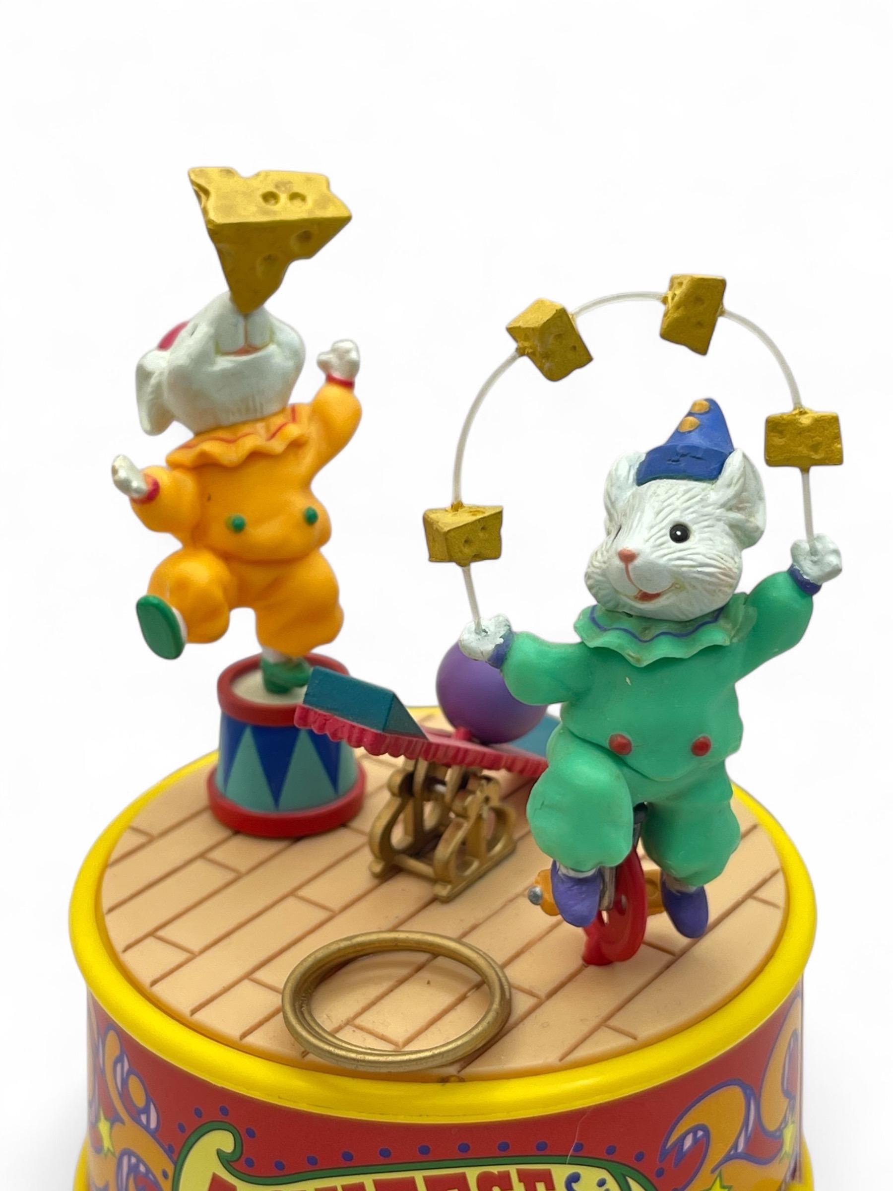 Charming and colorful, this vintage wind-up music box by Enesco features two whimsical mice dressed as circus performers, balancing and juggling cheese in a joyful scene titled A Cheese Ring Circus. When wound, it plays “Entry of the Gladiators,” adding movement and sound to the fun.