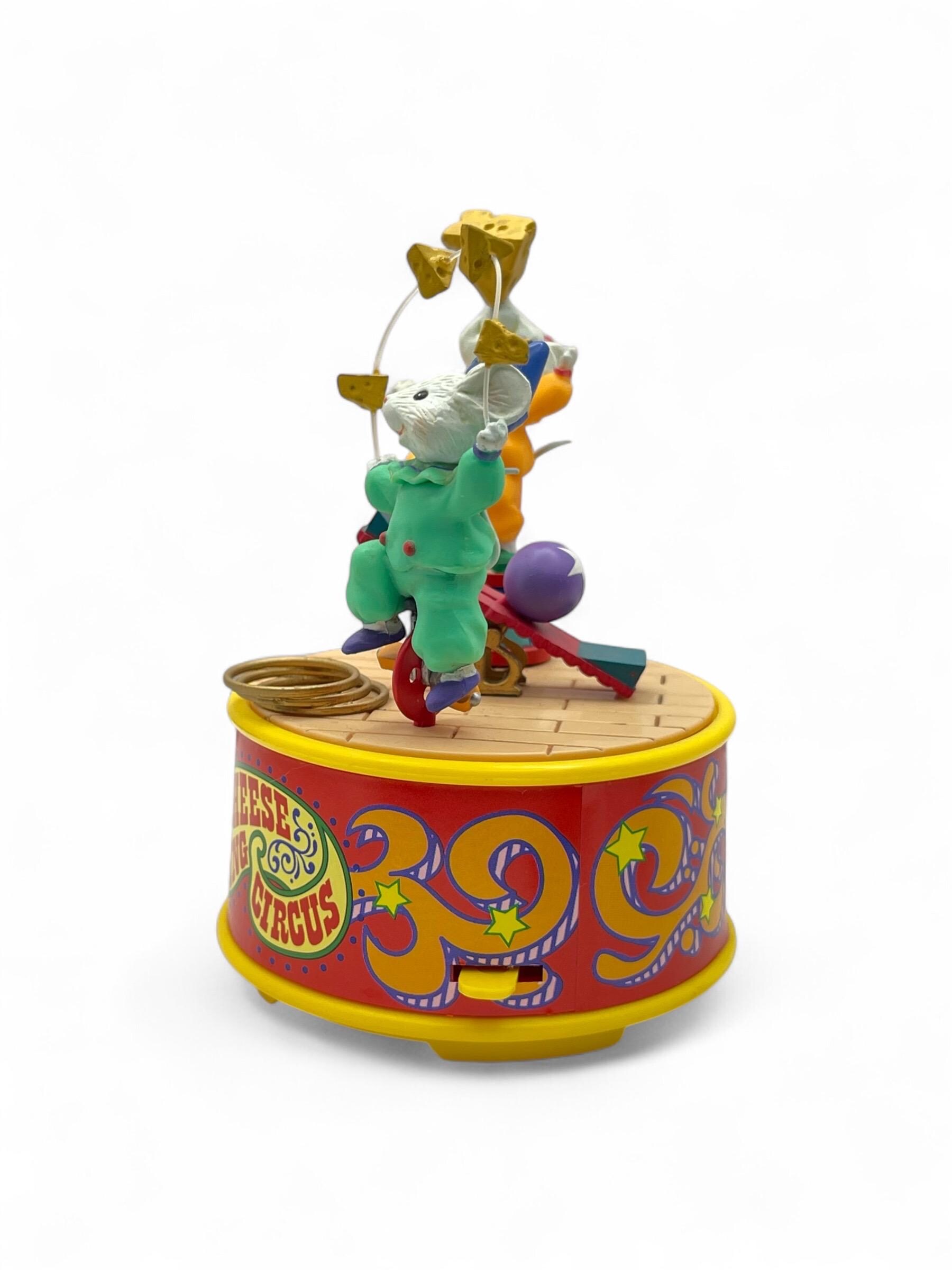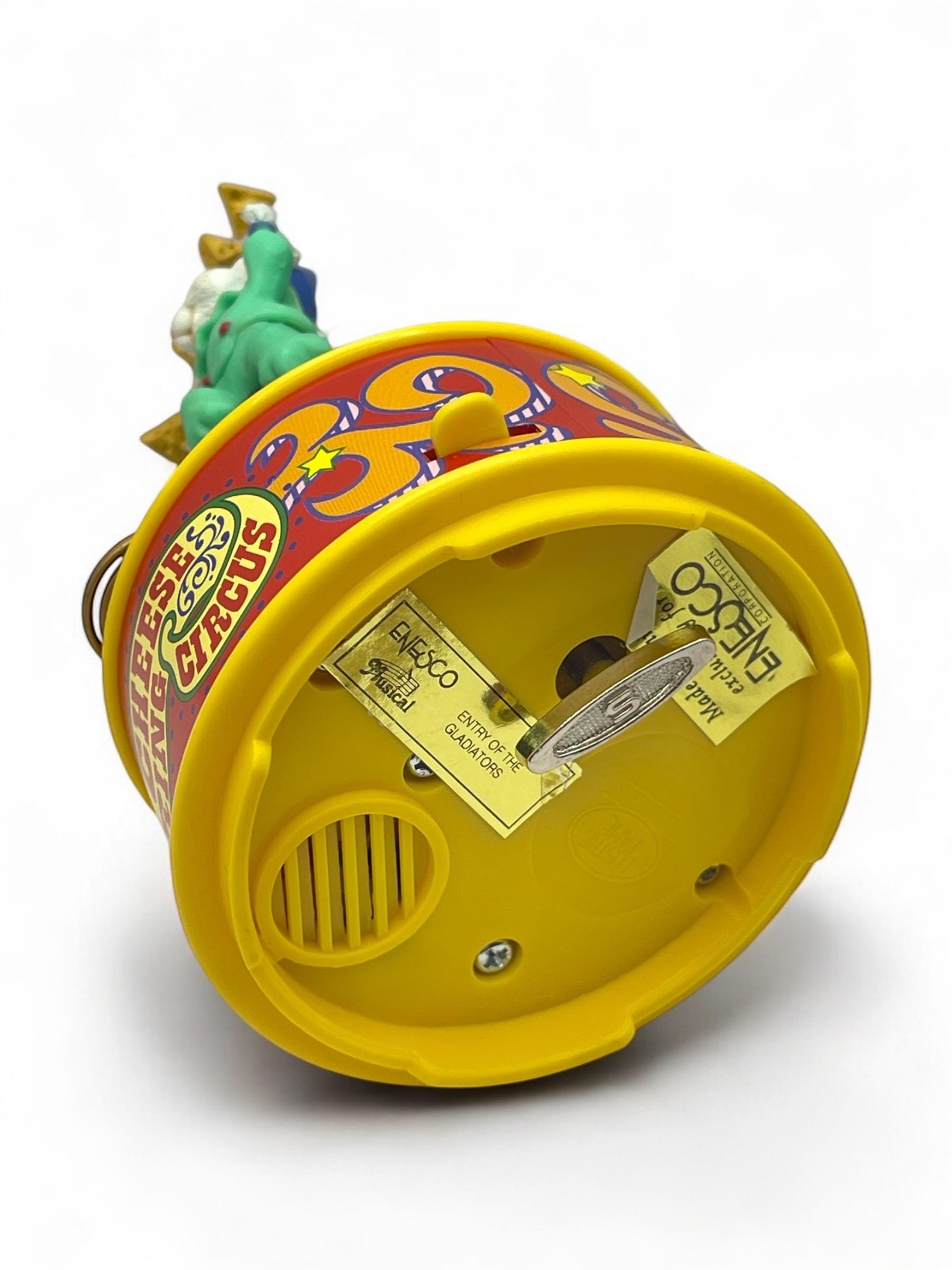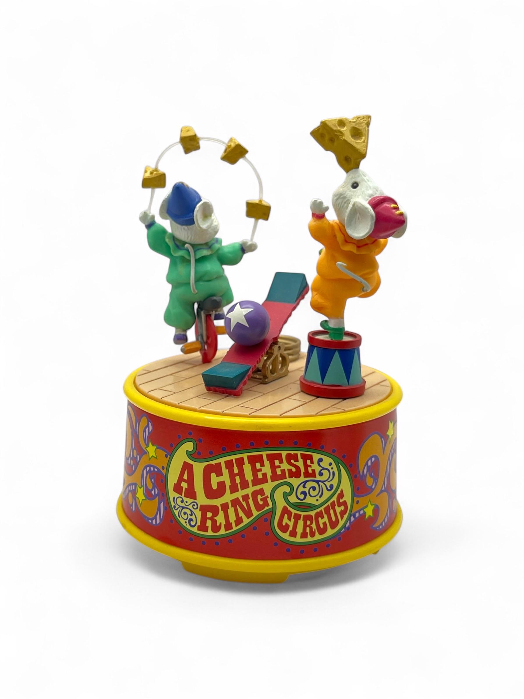 Charming and colorful, this vintage wind-up music box by Enesco features two whimsical mice dressed as circus performers, balancing and juggling cheese in a joyful scene titled A Cheese Ring Circus. When wound, it plays “Entry of the Gladiators,” adding movement and sound to the fun.
