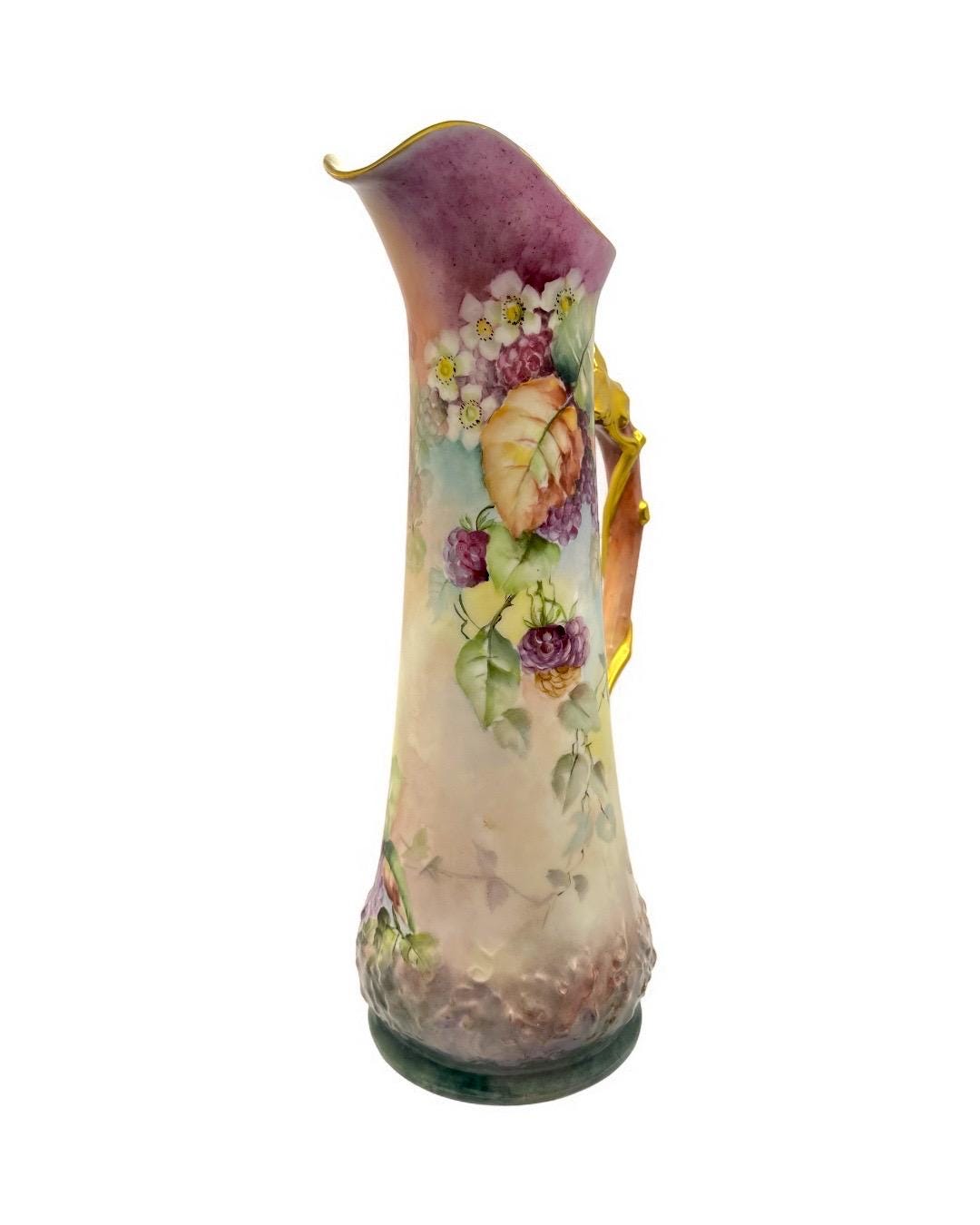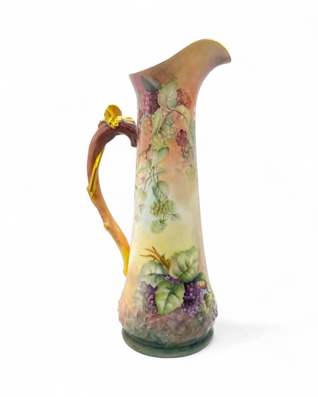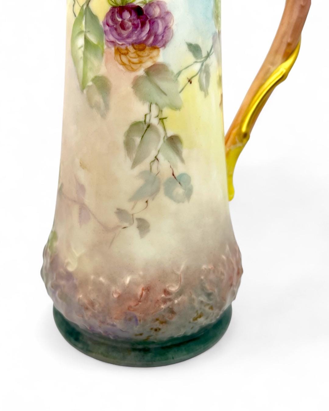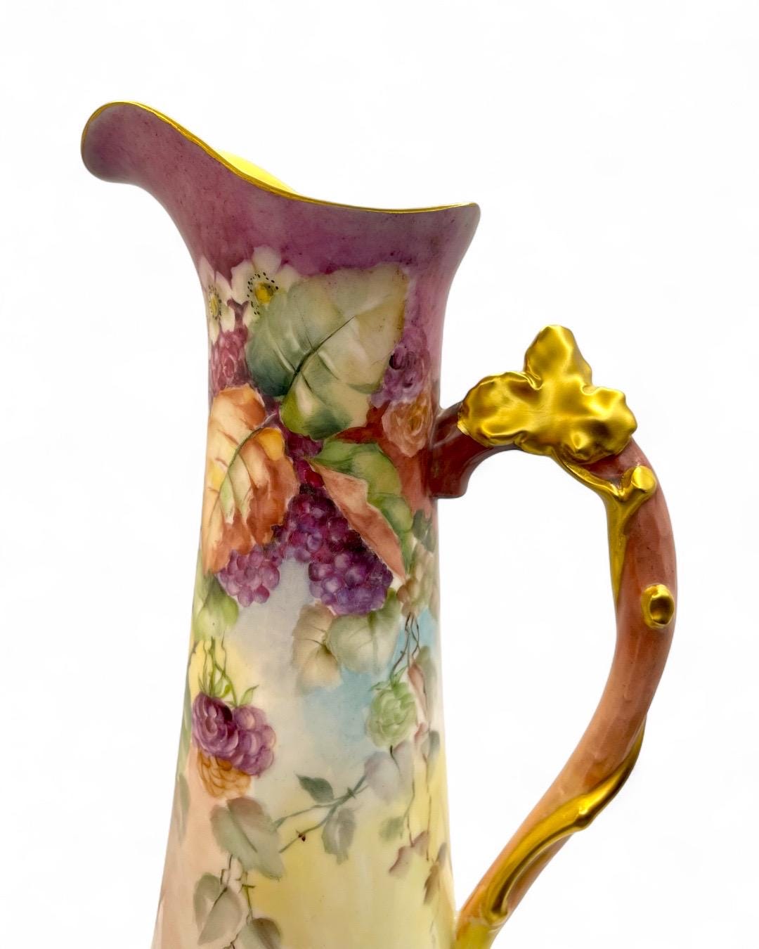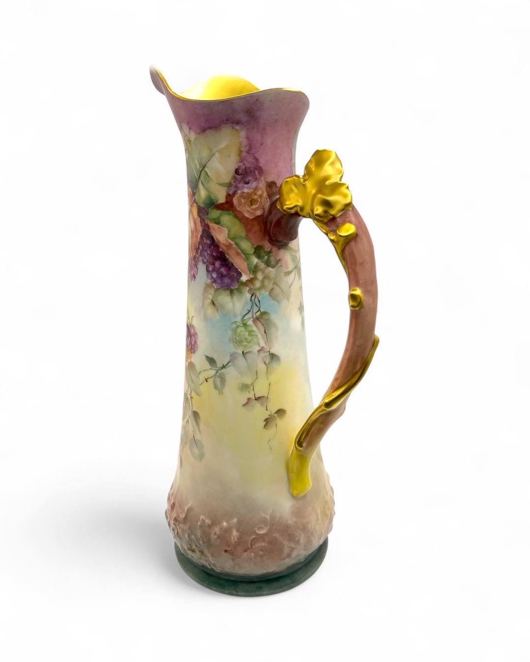 This exquisite porcelain pitcher, stamped Tressemann & Vogt (T&V) from Limoges, France, dates between 1892–1907. It features entirely hand-painted floral and fruit motifs, showcasing the delicate artistry and vibrant color palette typical of Limoges craftsmanship.