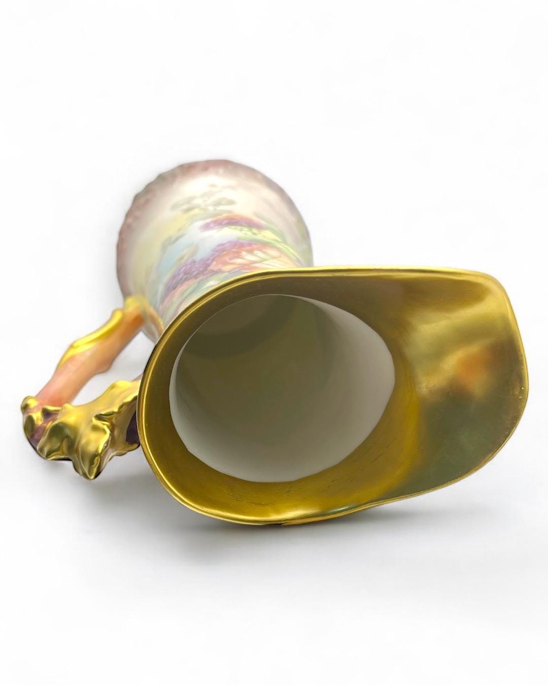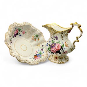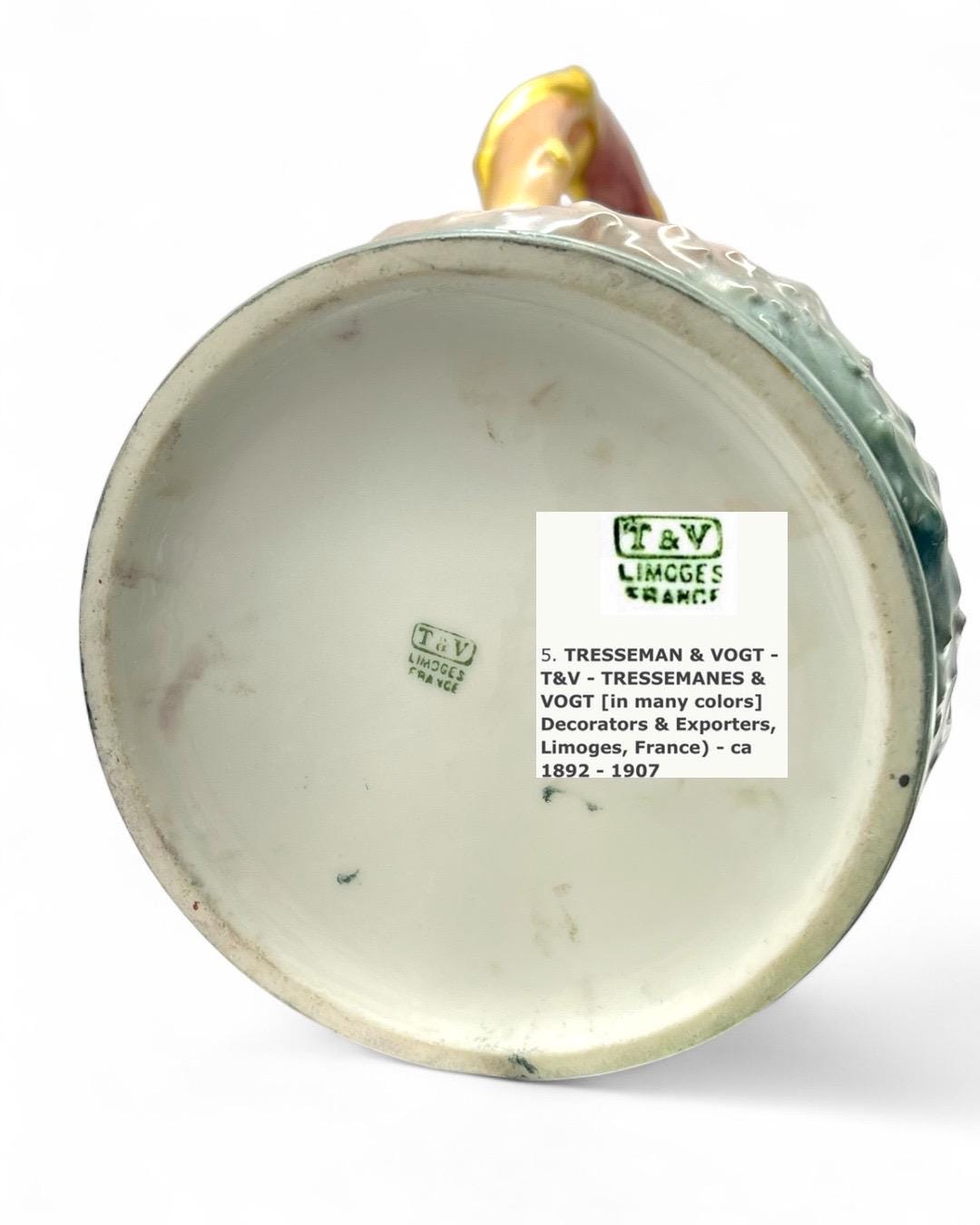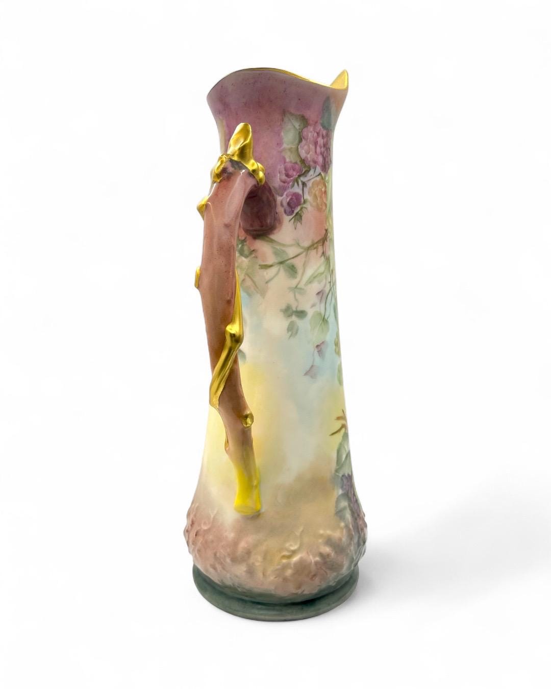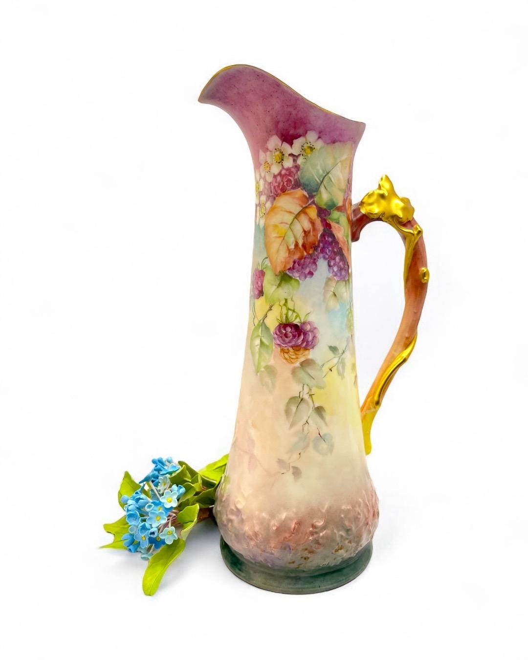 This exquisite porcelain pitcher, stamped Tressemann & Vogt (T&V) from Limoges, France, dates between 1892–1907. It features entirely hand-painted floral and fruit motifs, showcasing the delicate artistry and vibrant color palette typical of Limoges craftsmanship.