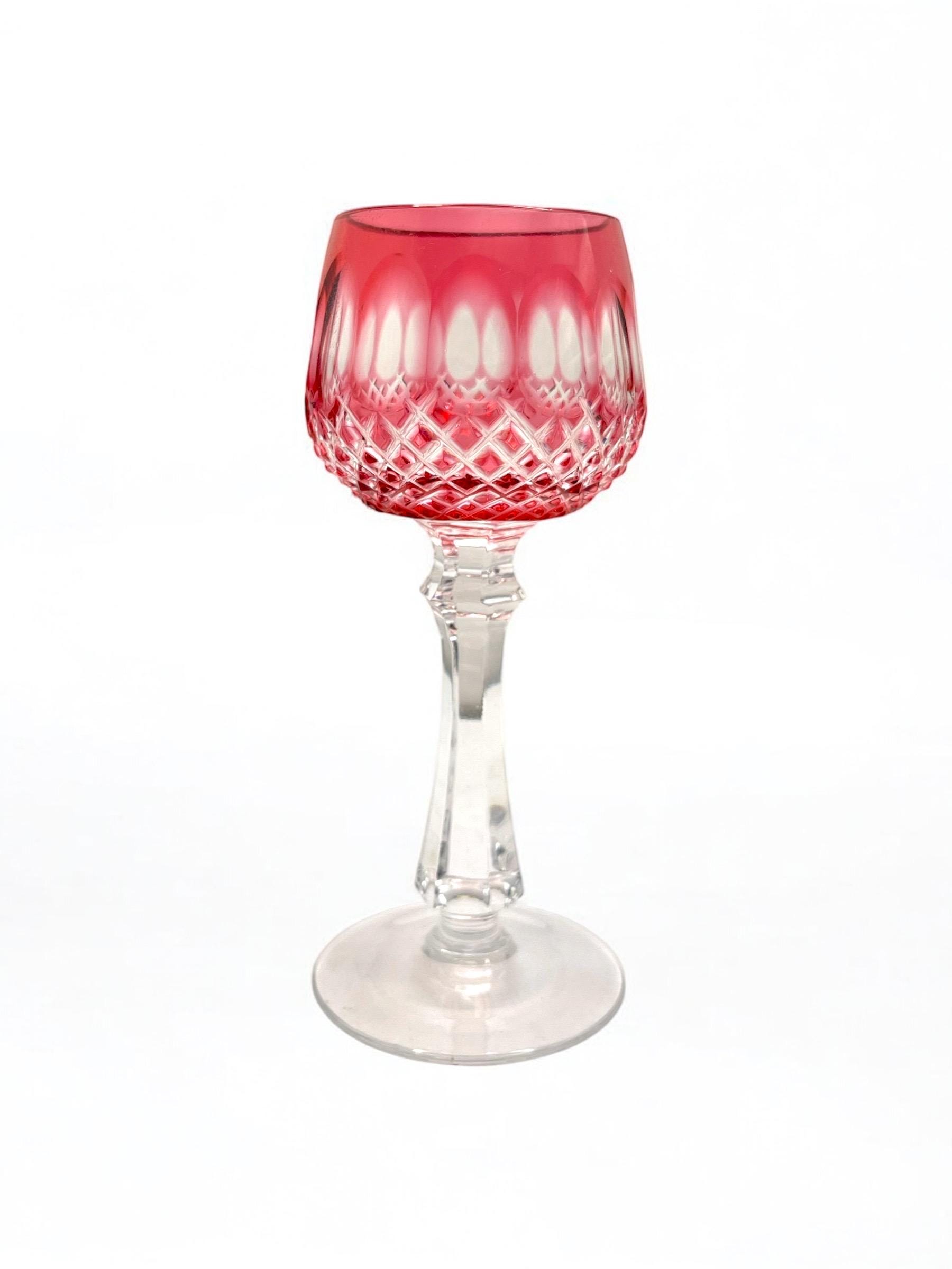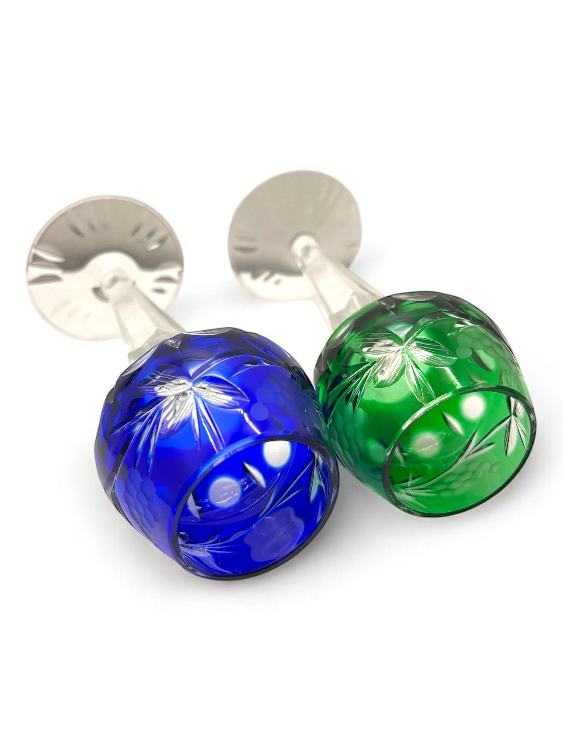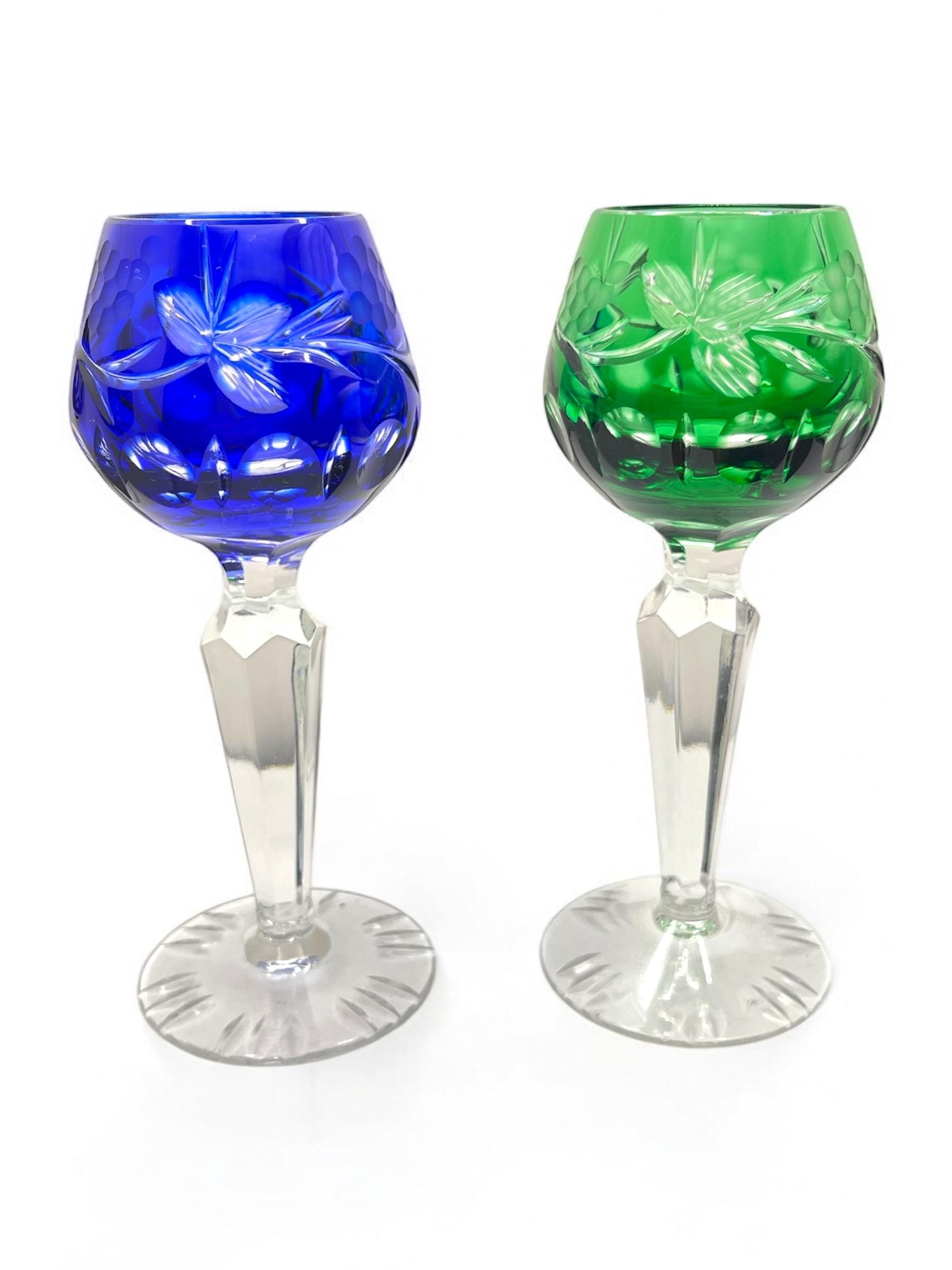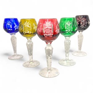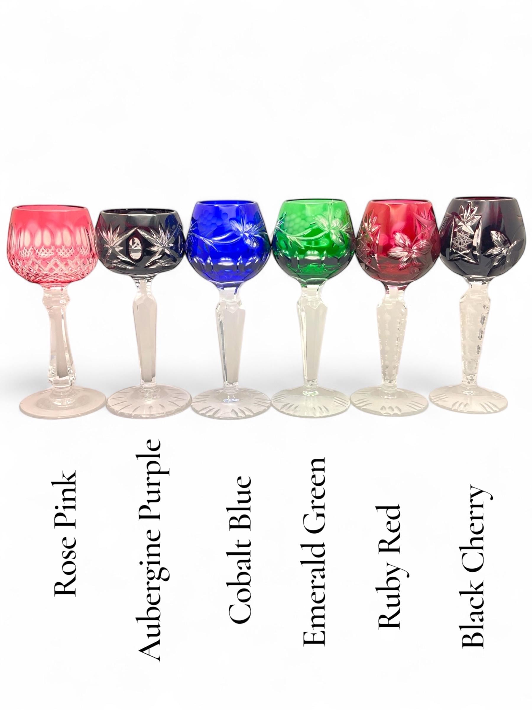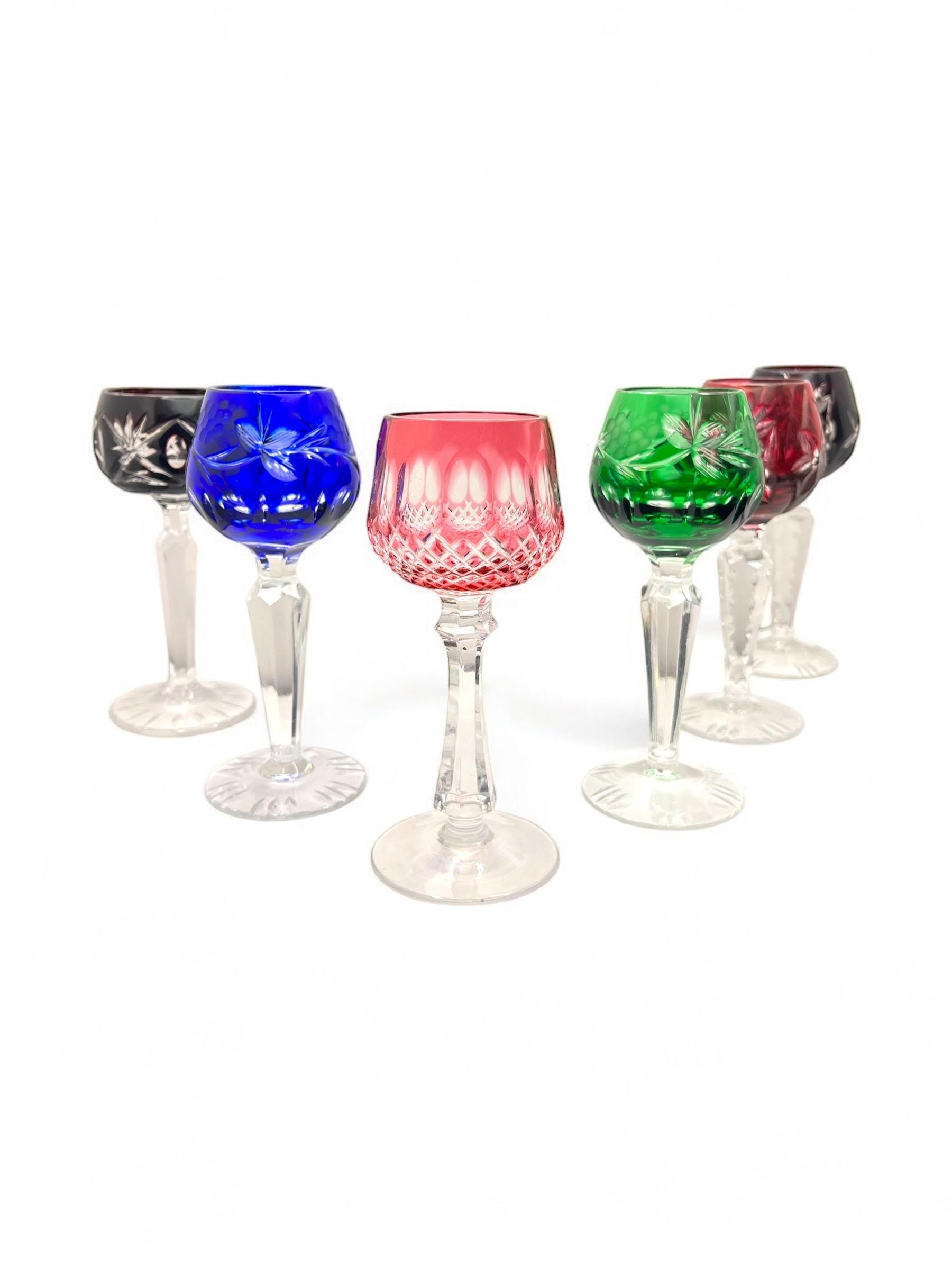 A beautifully crafted set of 6 vintage crystal cordial glasses, each featuring elegant cut-to-clear designs in vibrant jewel tones. The set showcases six unique colors, making it a perfect addition to any crystal collection or an eye-catching accent for special occasions.