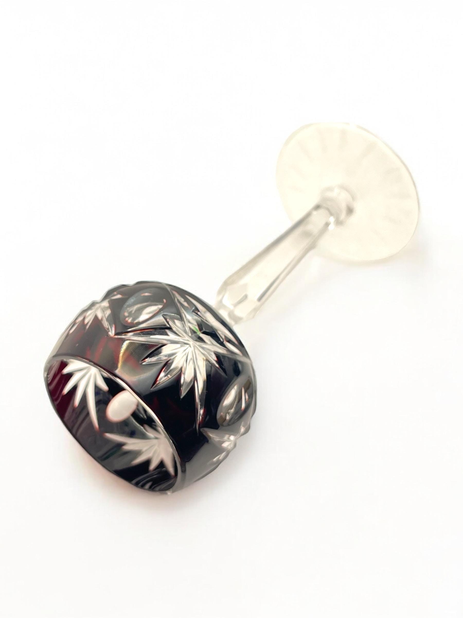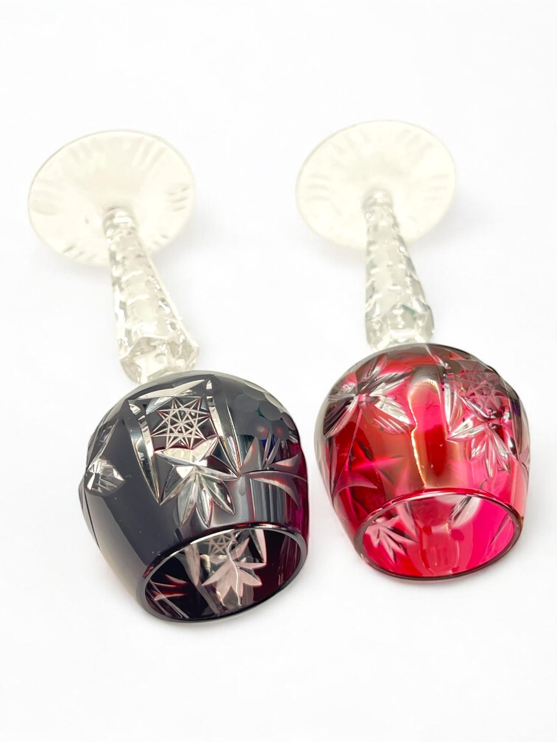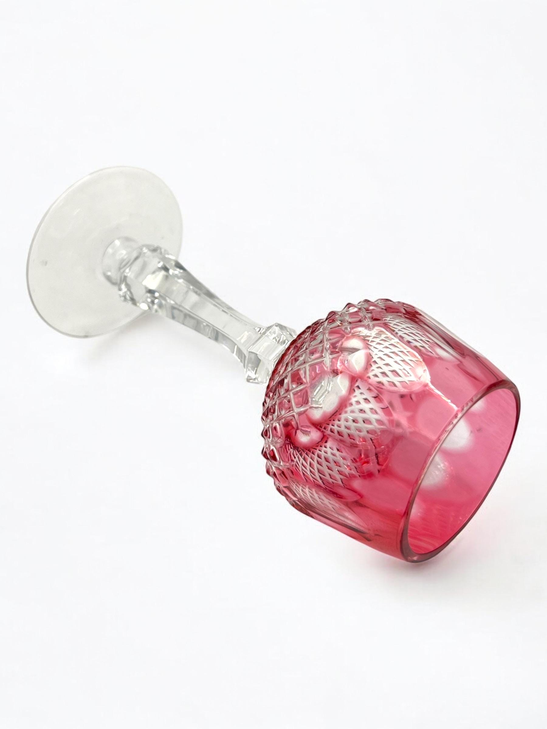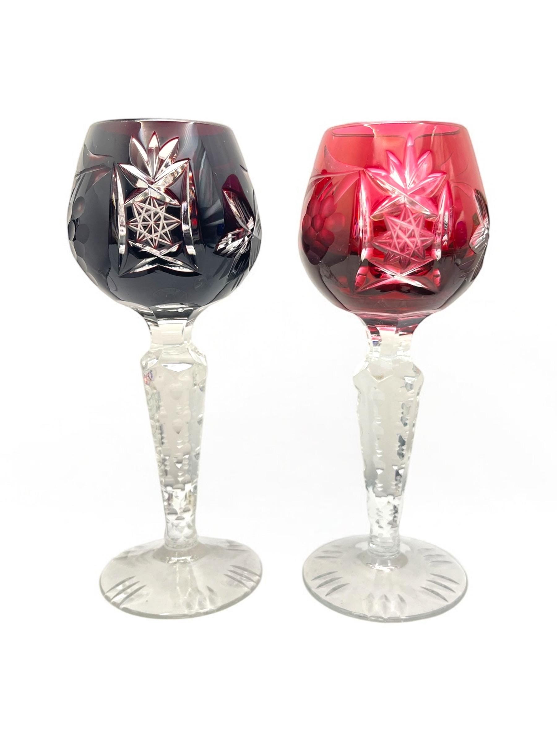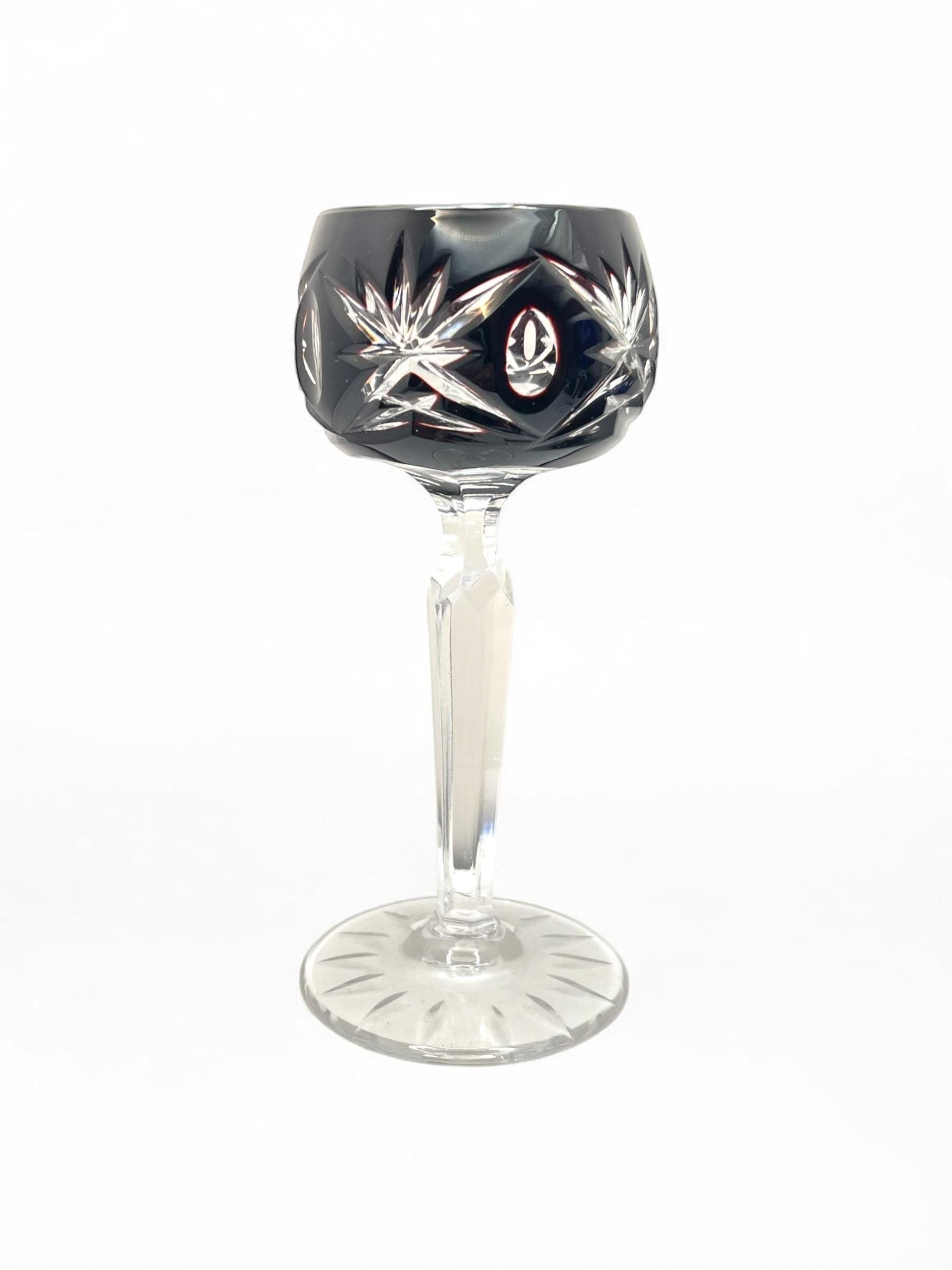 A beautifully crafted set of 6 vintage crystal cordial glasses, each featuring elegant cut-to-clear designs in vibrant jewel tones. The set showcases six unique colors, making it a perfect addition to any crystal collection or an eye-catching accent for special occasions.