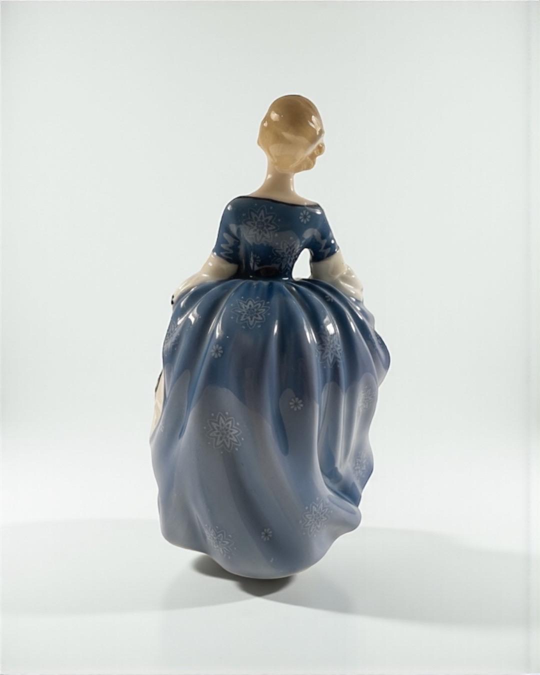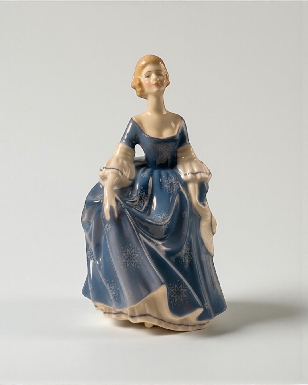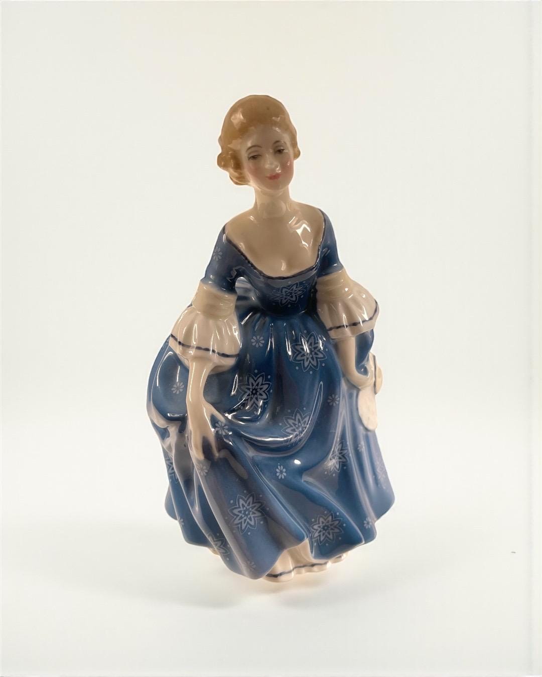 Produced in England, this elegant figurine features a young lady in a flowing blue gown decorated with delicate white floral motifs. Her soft expression, hand-painted details, and attention to movement make this piece a classic Royal Doulton collectible.