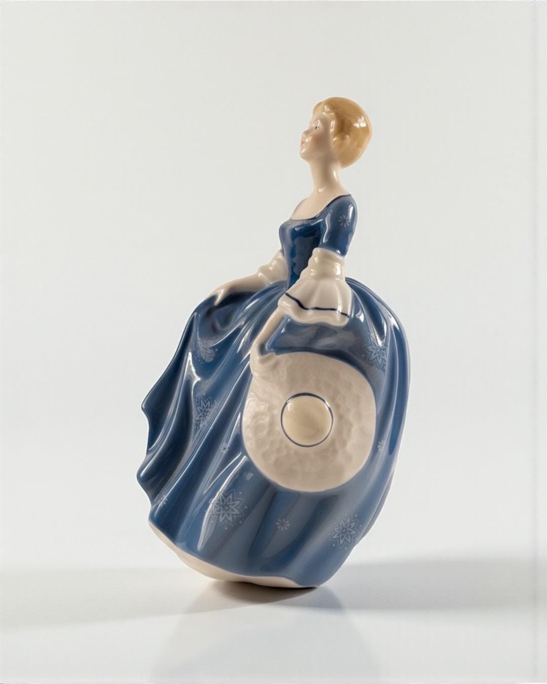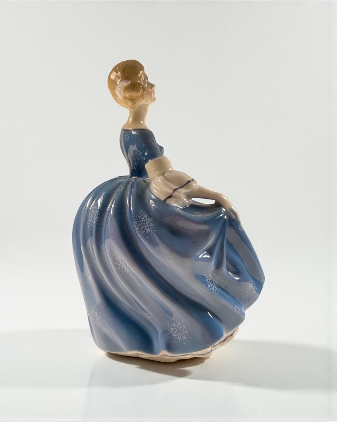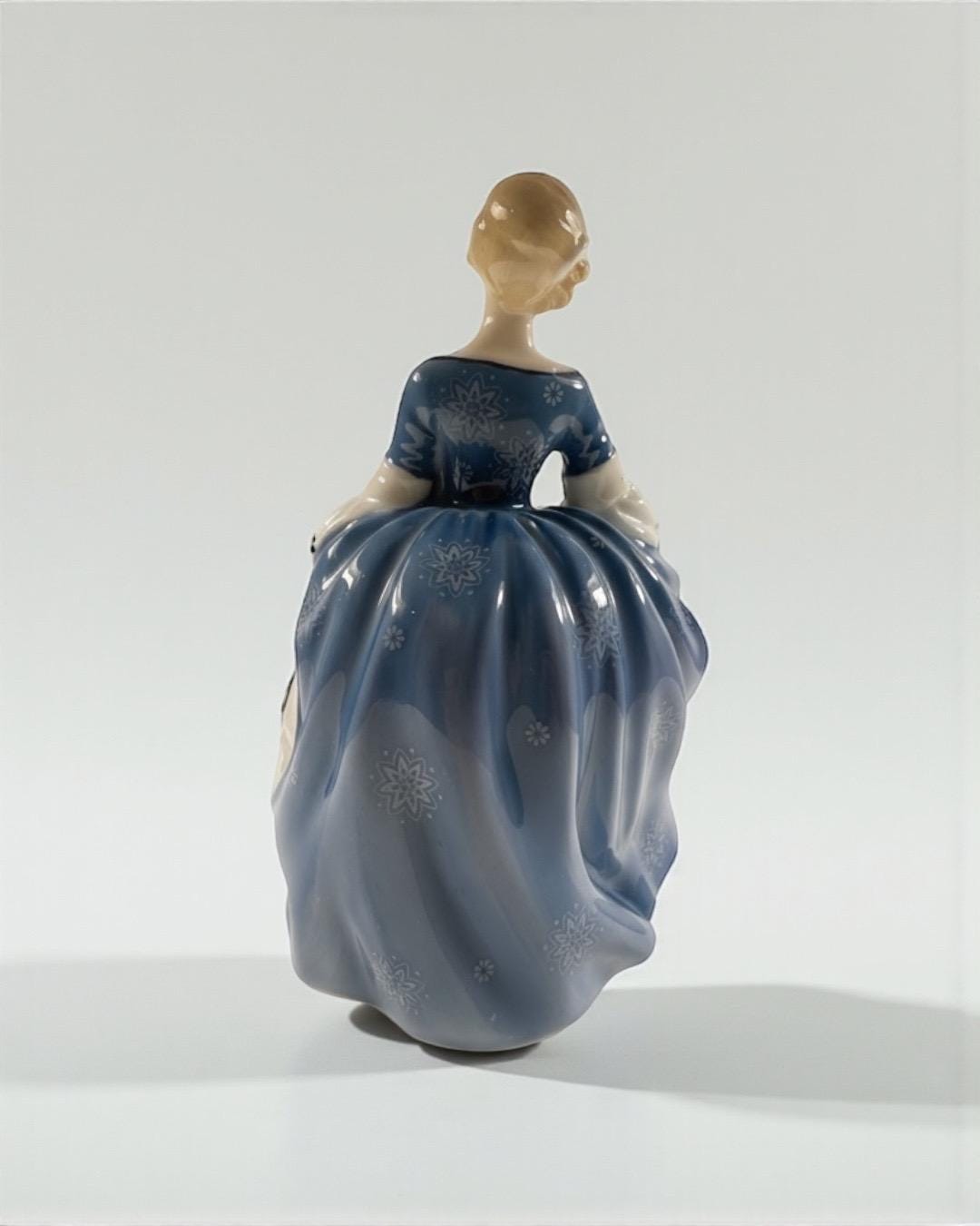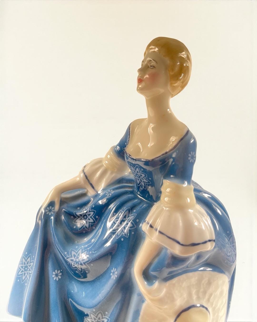 Produced in England, this elegant figurine features a young lady in a flowing blue gown decorated with delicate white floral motifs. Her soft expression, hand-painted details, and attention to movement make this piece a classic Royal Doulton collectible.