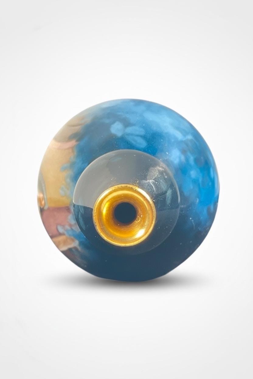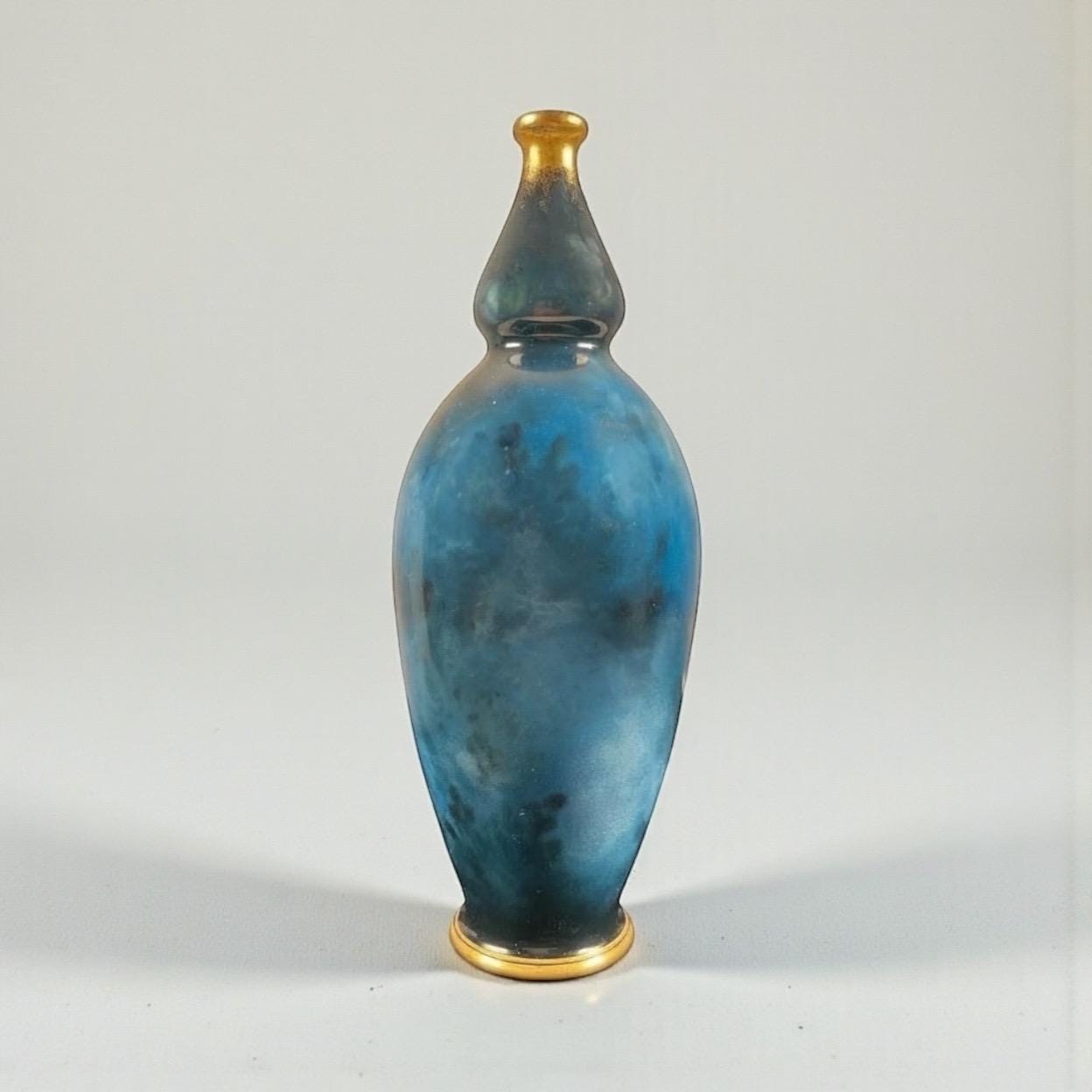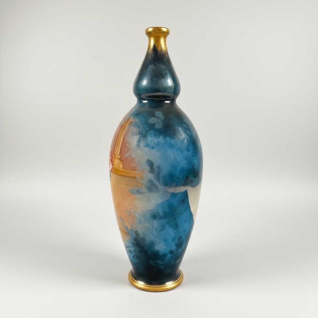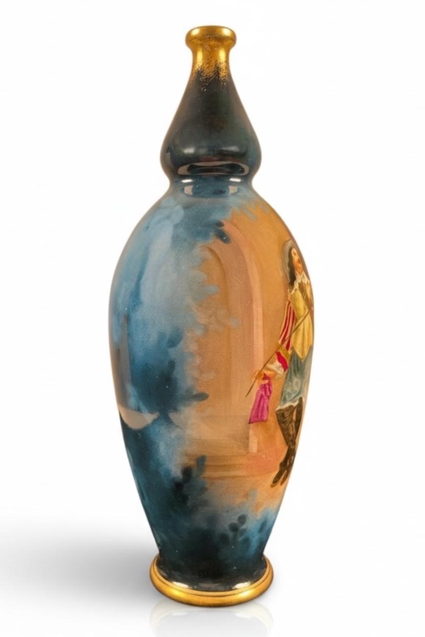 Standing 21 cm (8.25 inches) tall, the vase features a beautifully rendered figural scene, rich cobalt-blue clouded glazing, and liquid gold gilt accents.