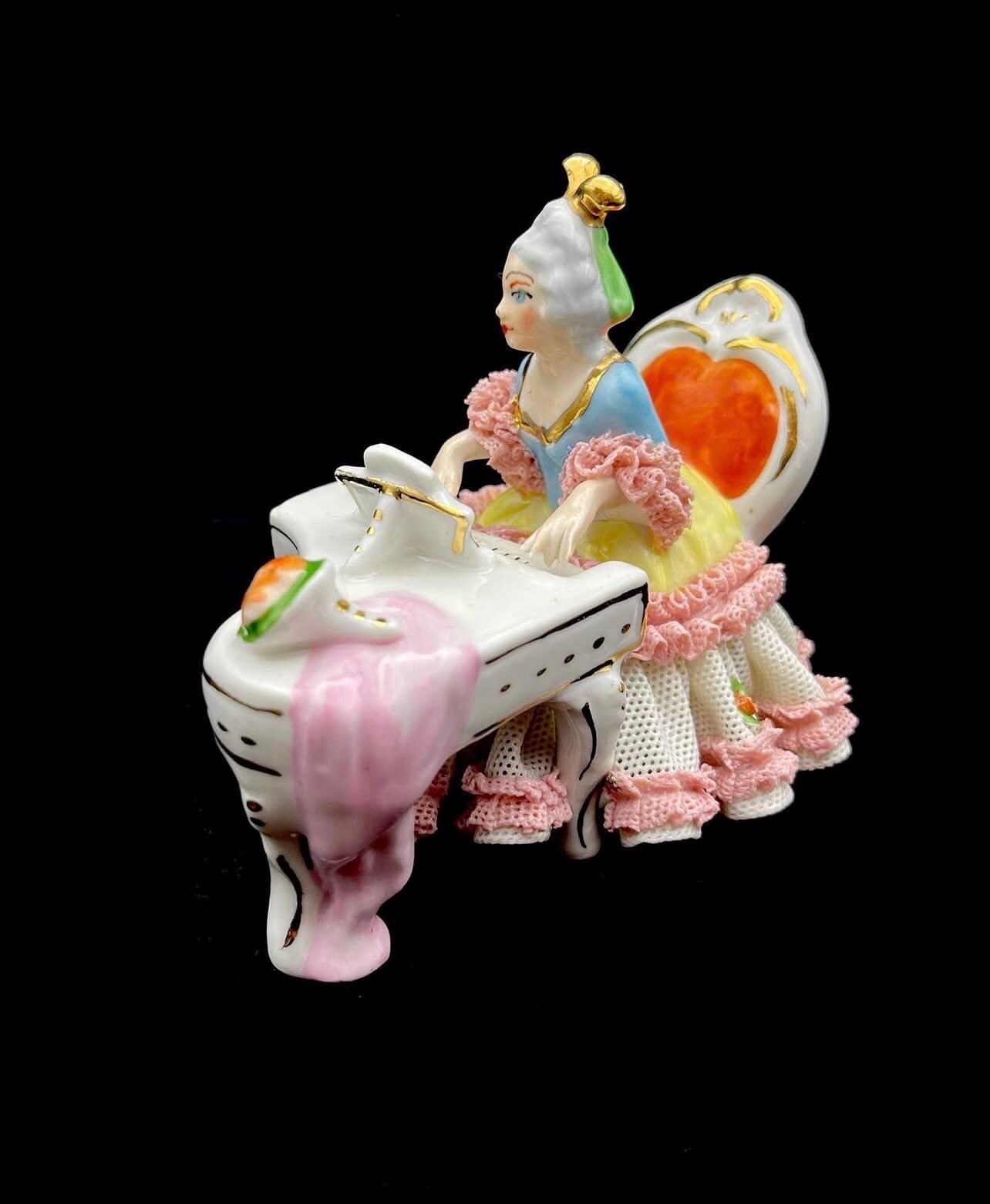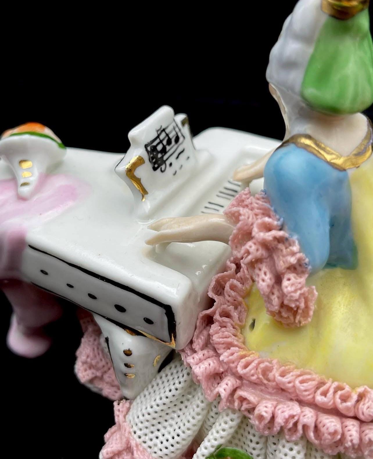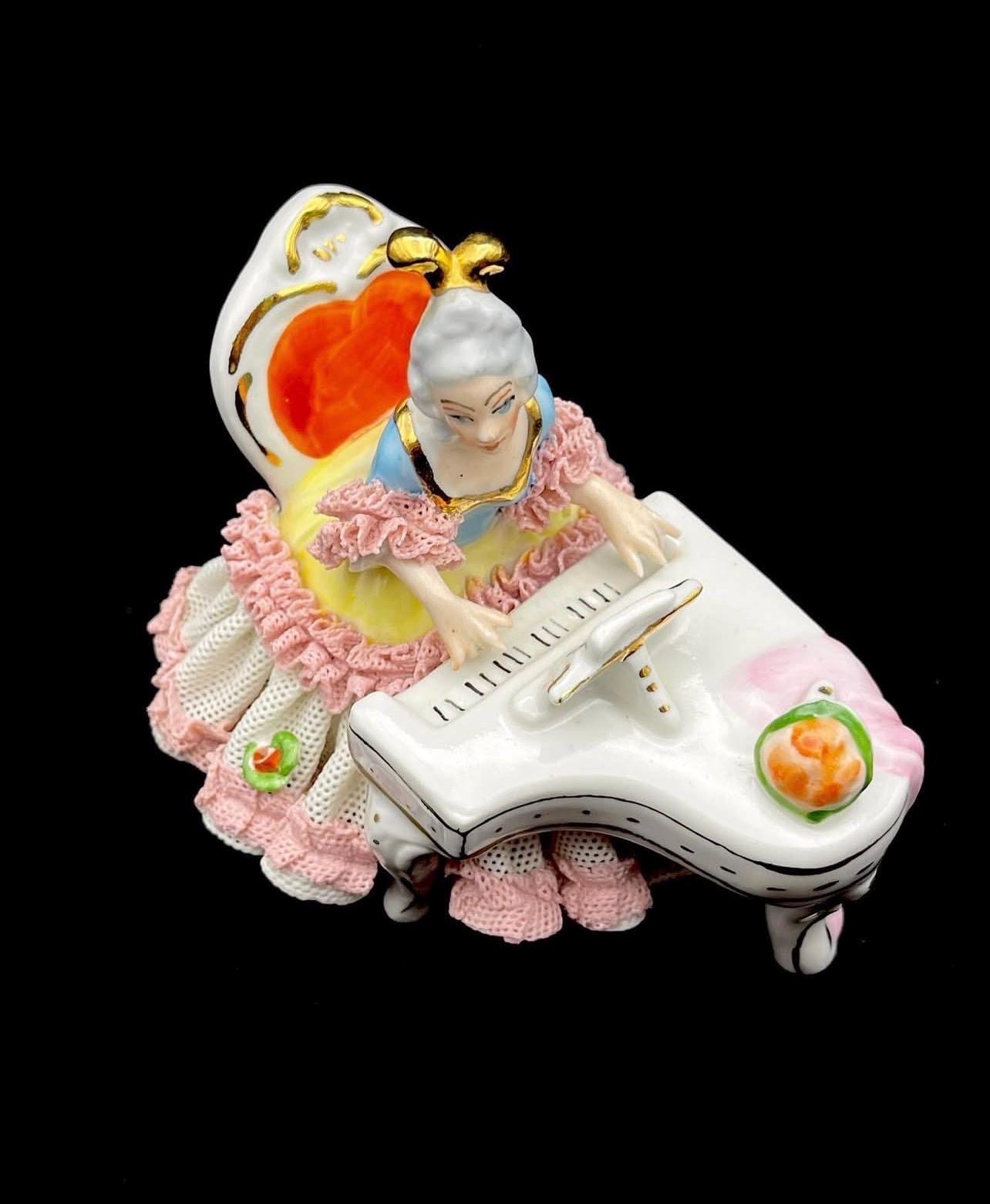 A rare and highly collectible Wilhelm Rittirsch Dresden porcelain figurine, produced in Germany between 1950 and 1974. This exquisite piece depicts an elegant lady seated at a piano, featuring exceptional hand-modeled lace details, vibrant hand-painted colors, and refined gold accents.