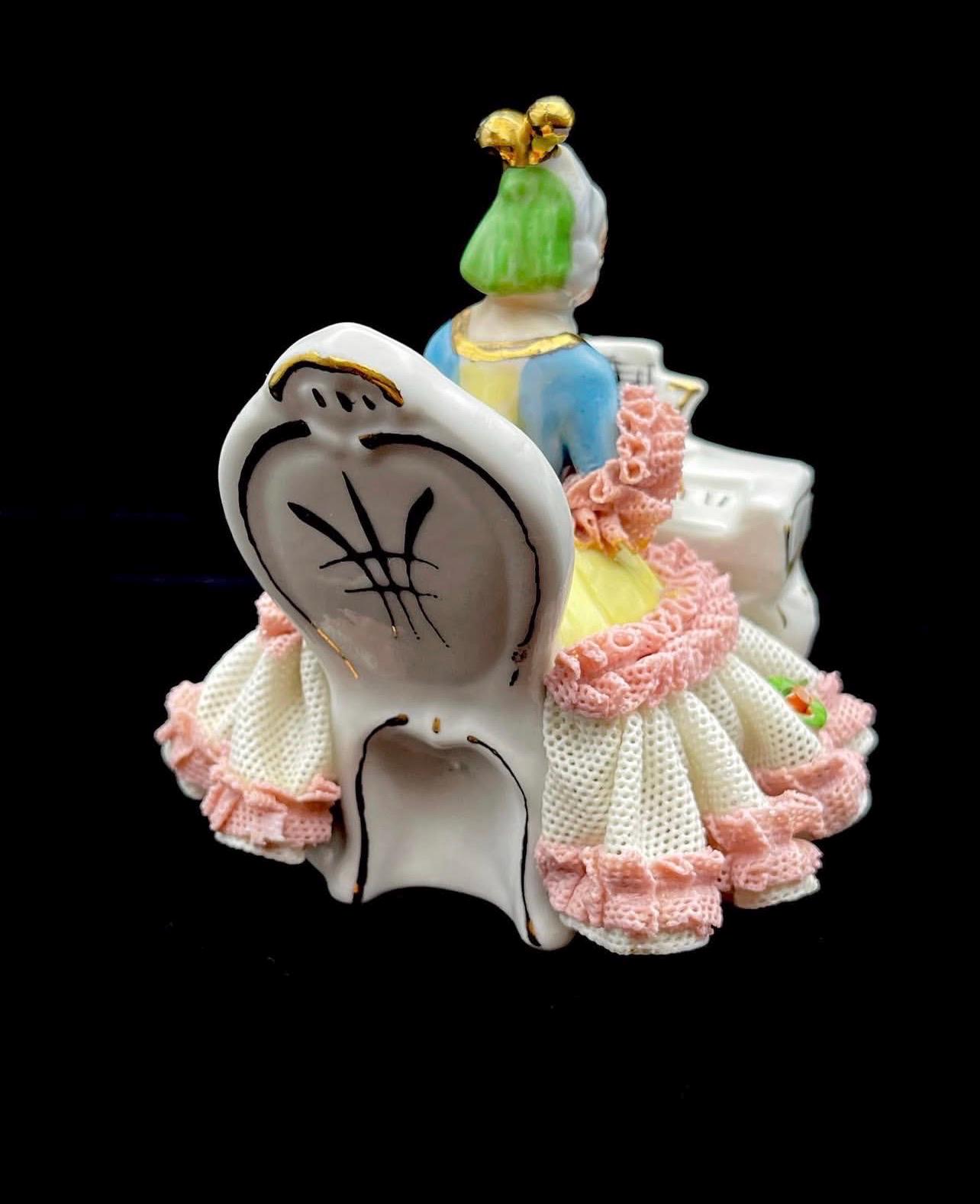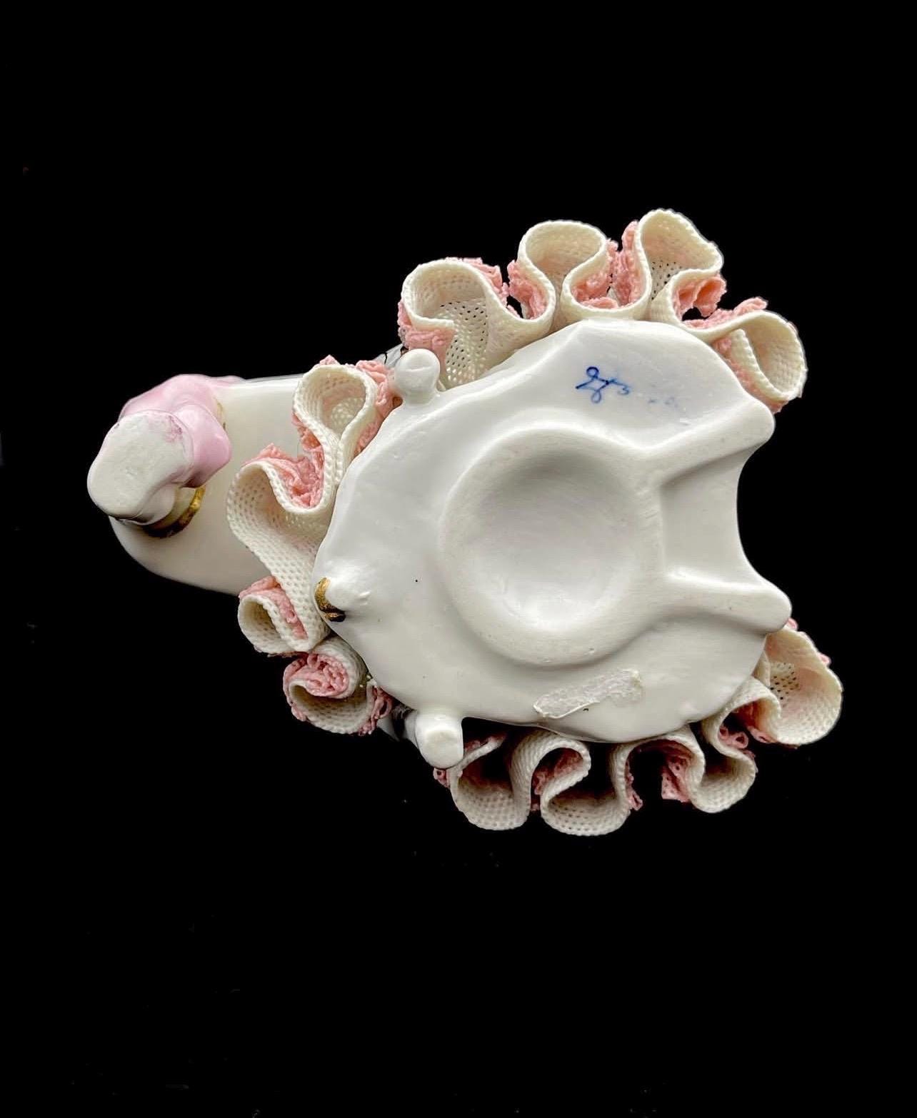 Entirely handmade and hand-painted, this figurine showcases the craftsmanship Dresden is renowned for. Finding this model in perfect condition is extremely difficult due to the delicate lace work and complex structure—making this example especially desirable for serious collectors.