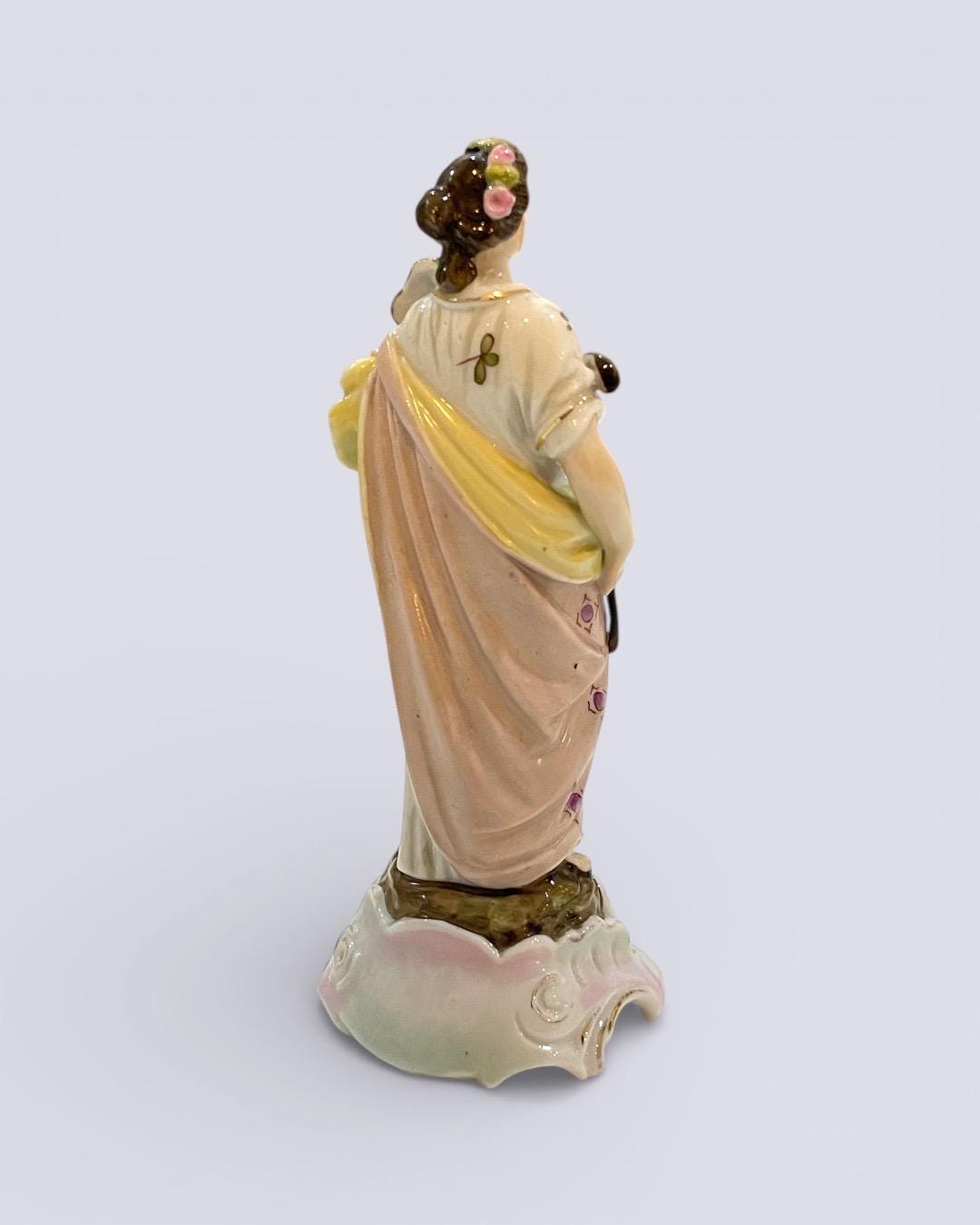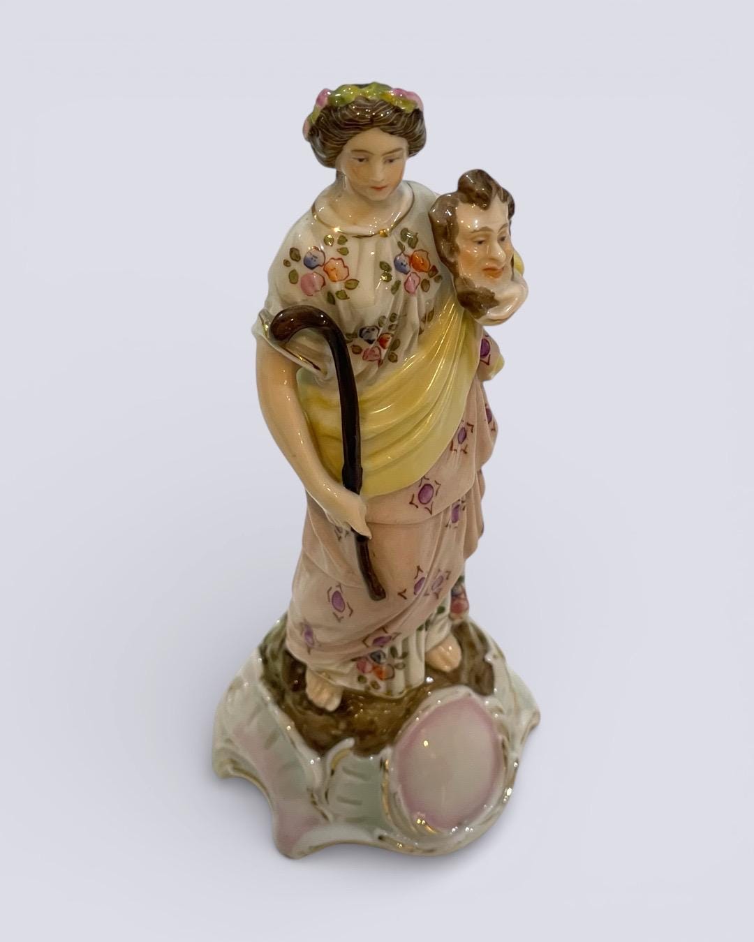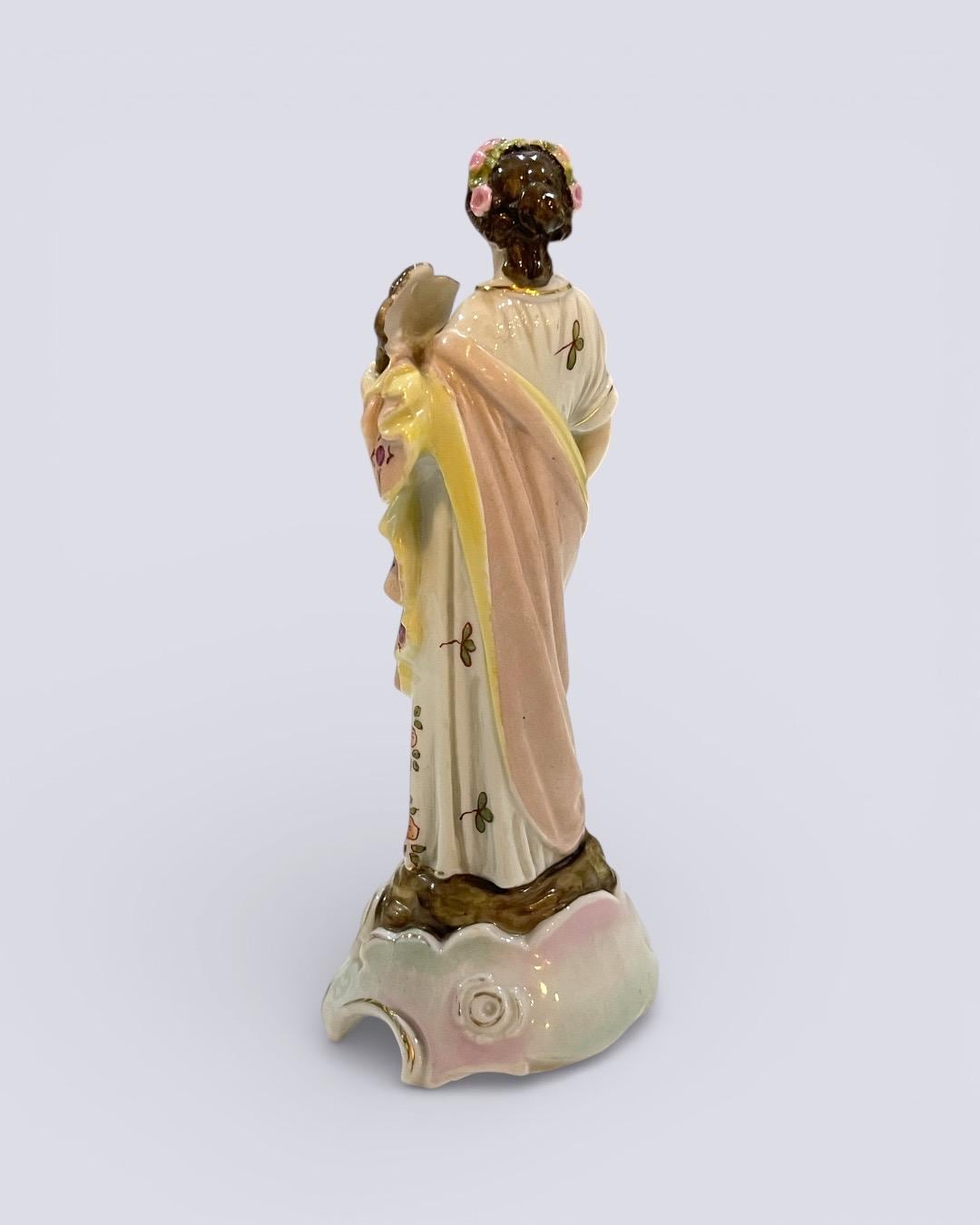 The figurine depicts a classical female allegorical figure holding a theatrical mask, a theme associated with art, drama, and classical symbolism. The soft pastel palette, delicate glazing, and harmonious proportions elevate this piece well beyond a standard decorative figurine, justifying its classification as a true porcelain statue despite its miniature dimensions.