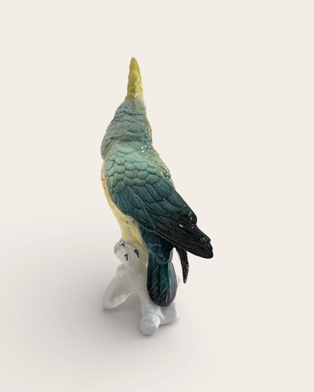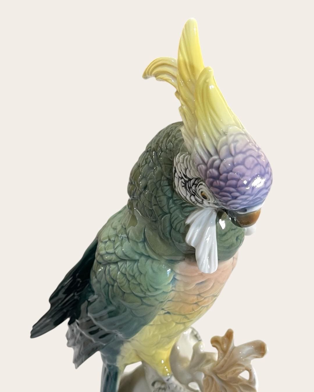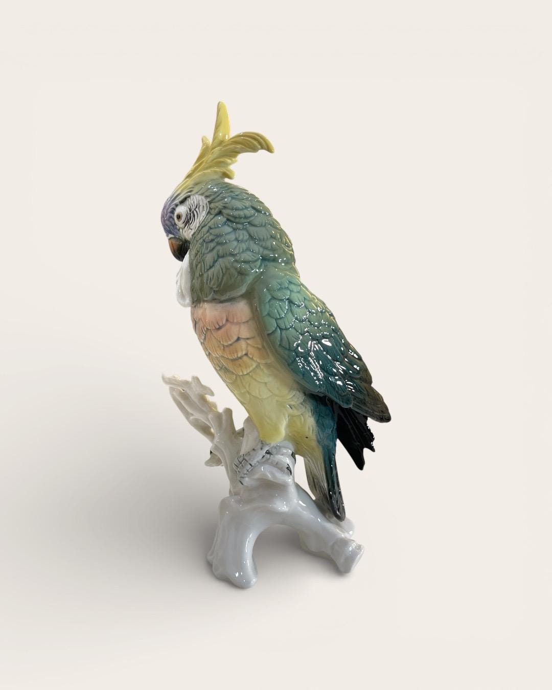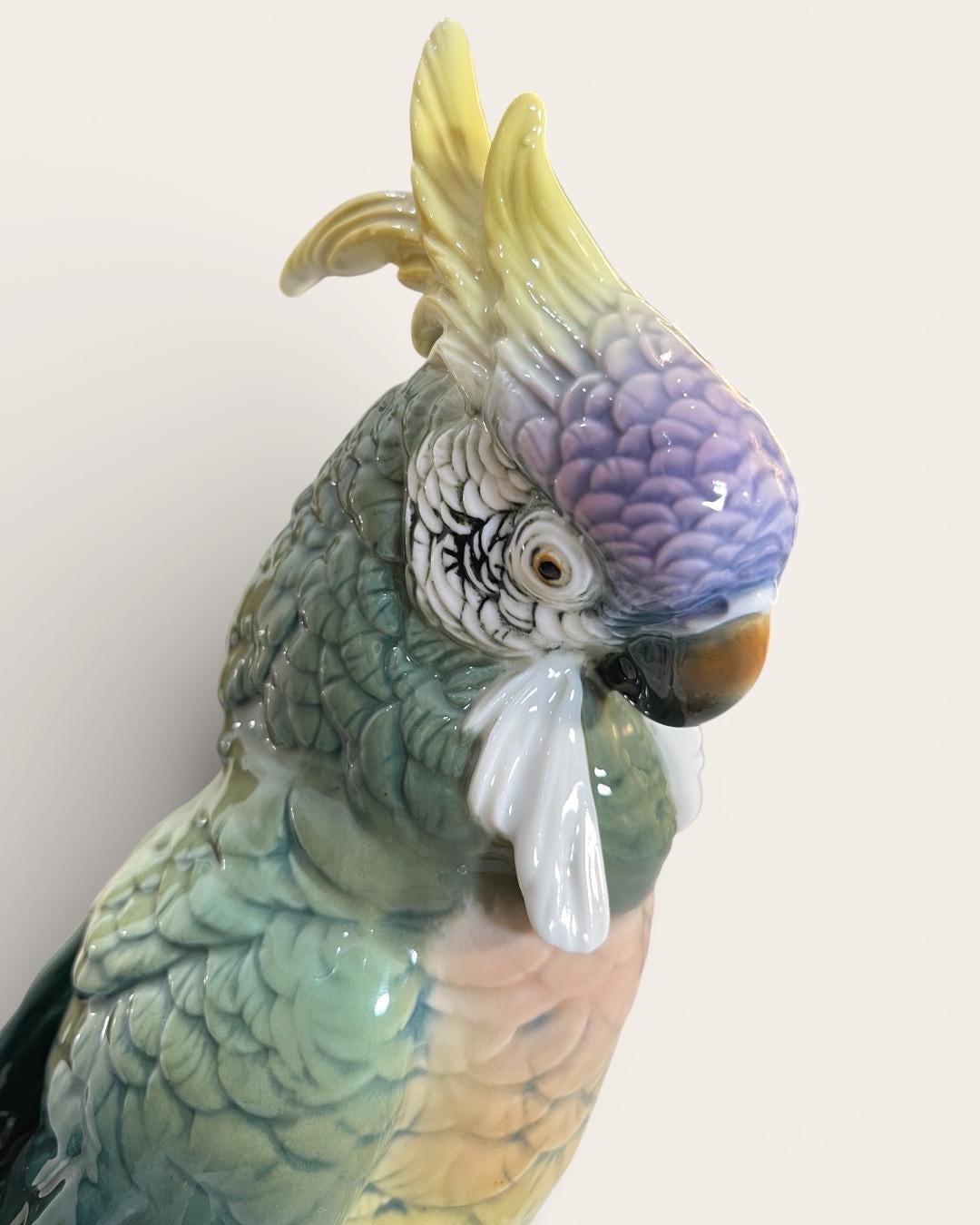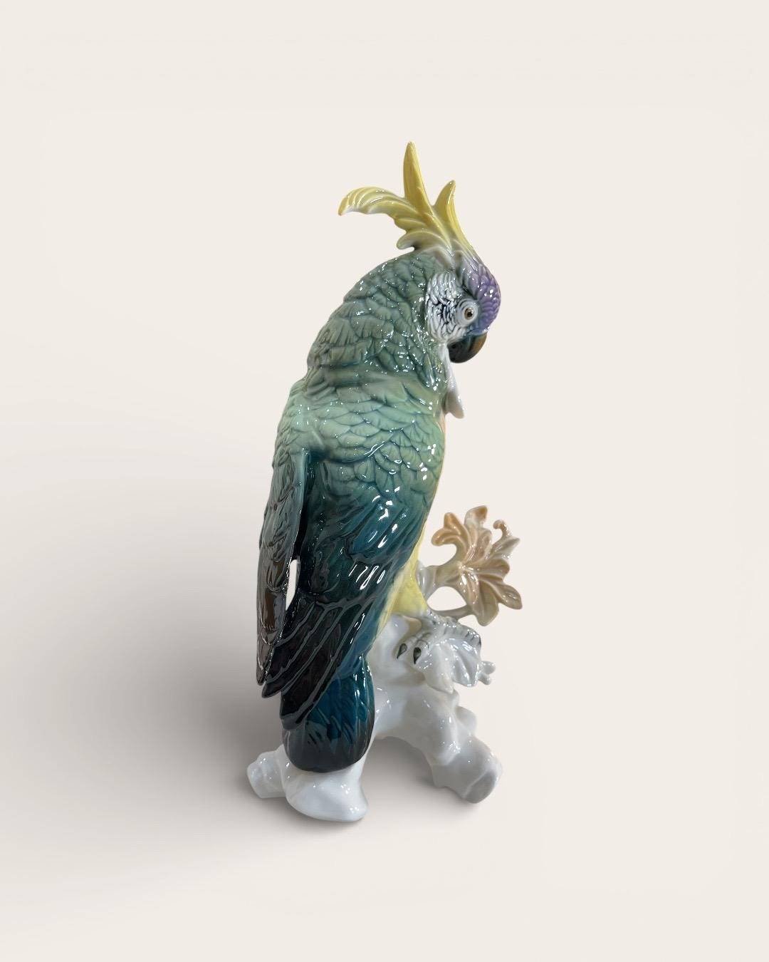 This elegant parrot is masterfully hand painted in soft gradients of green, yellow, lavender, and deep teal. The layered feather detailing and expressive eye reflect the high artistic standards of the Volkstedt workshops.