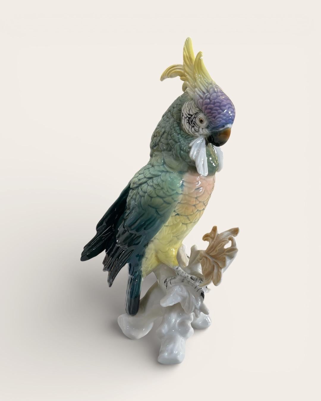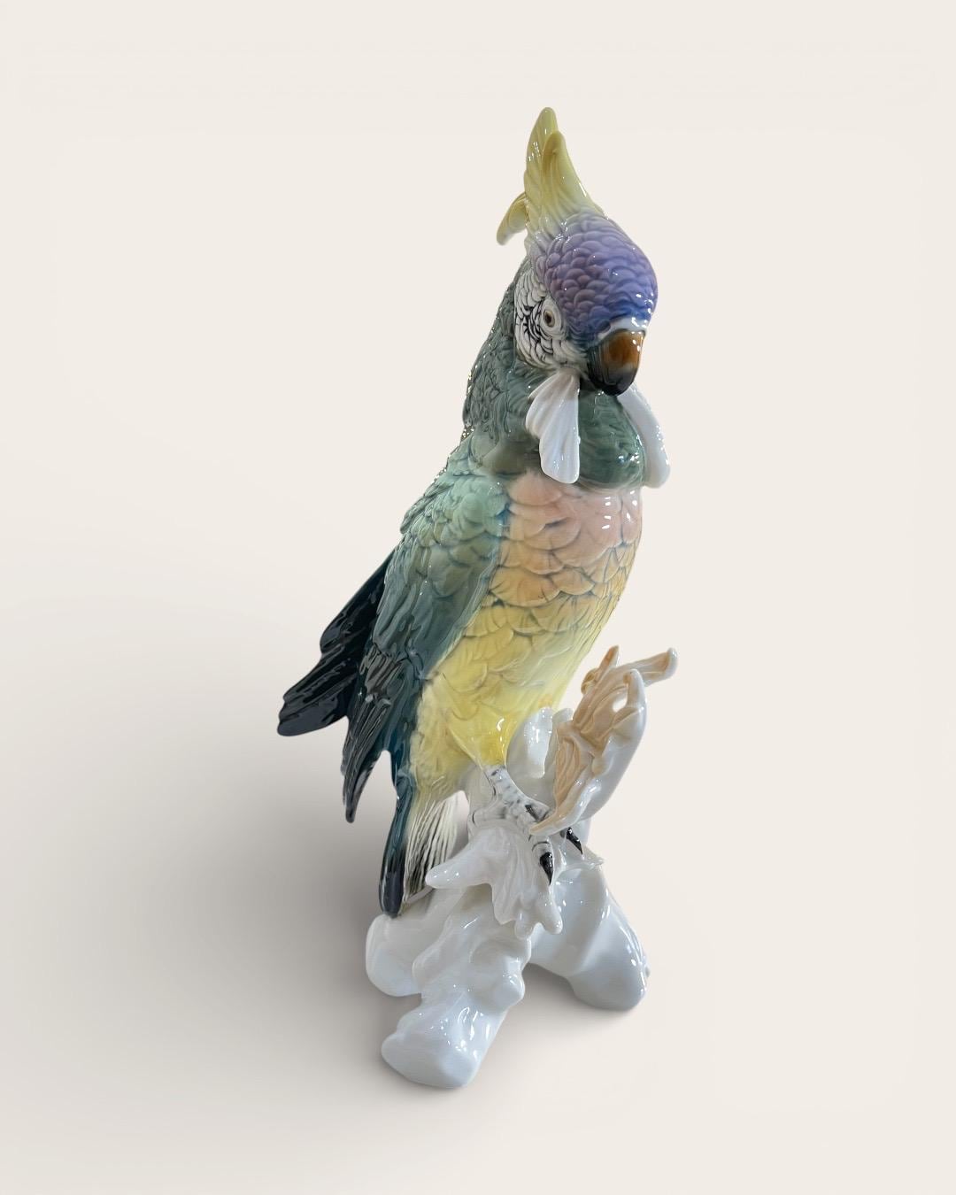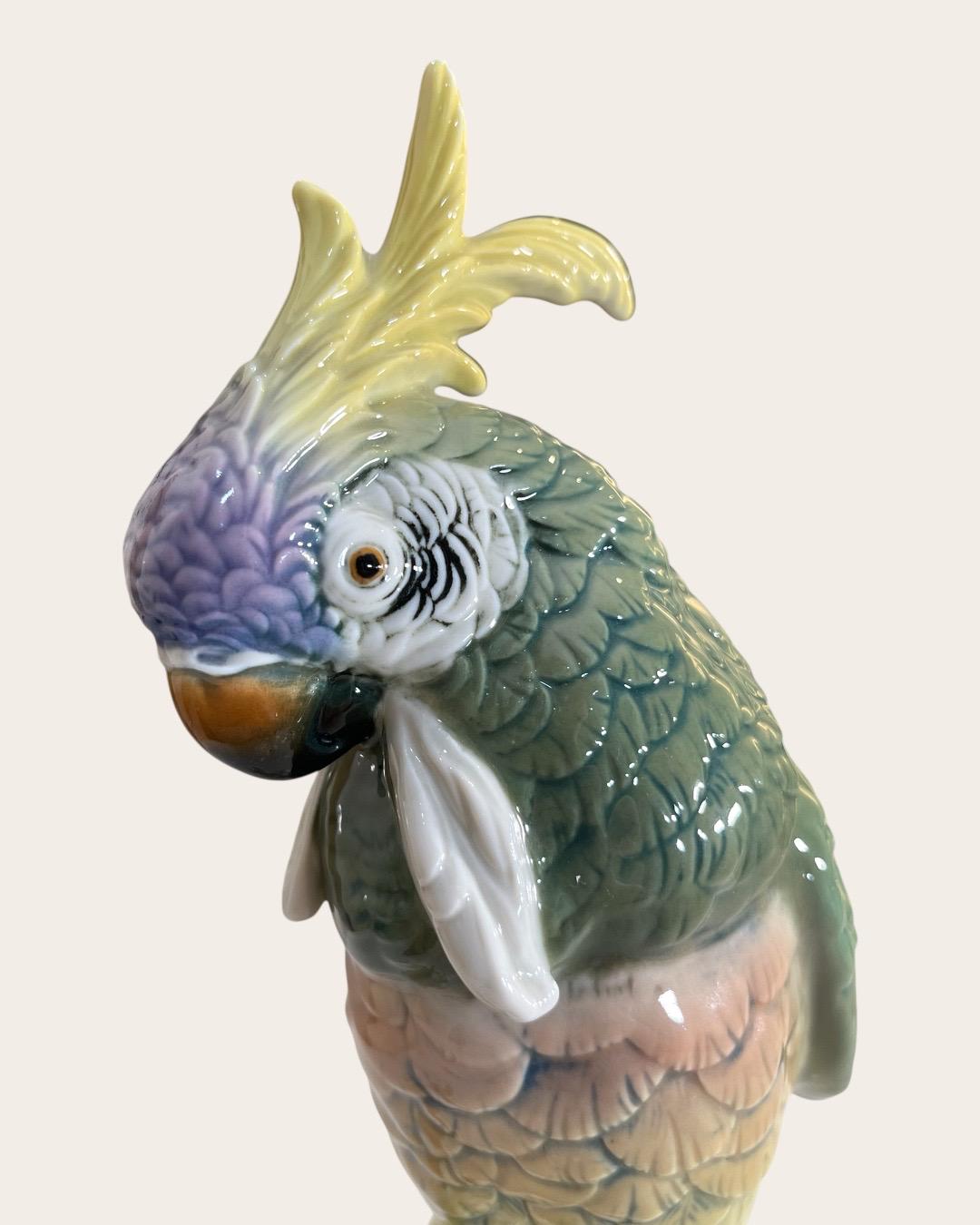 A striking and finely detailed Karl Ens porcelain parrot figurine, produced in Volkstedt, Thuringia, Germany.