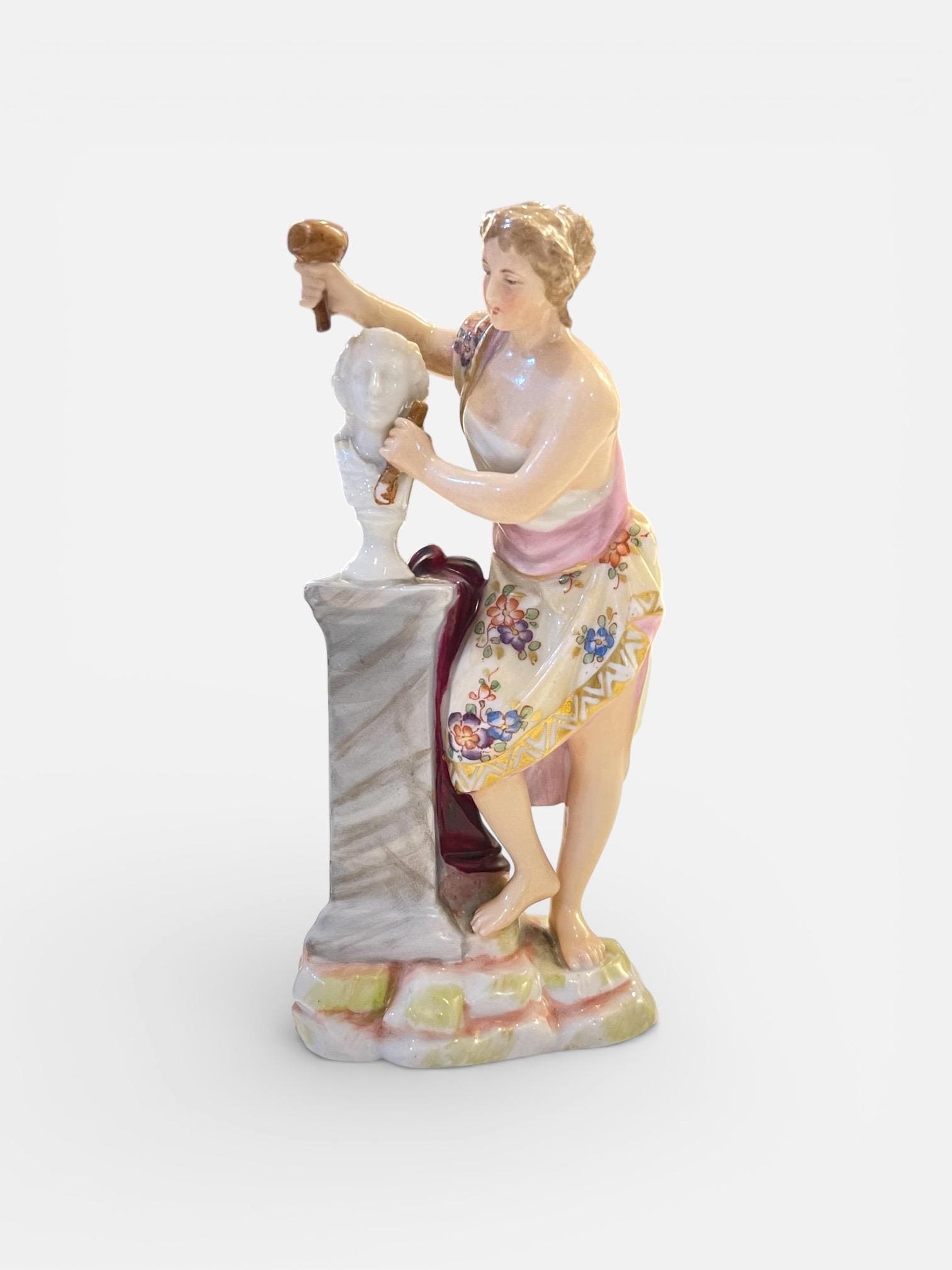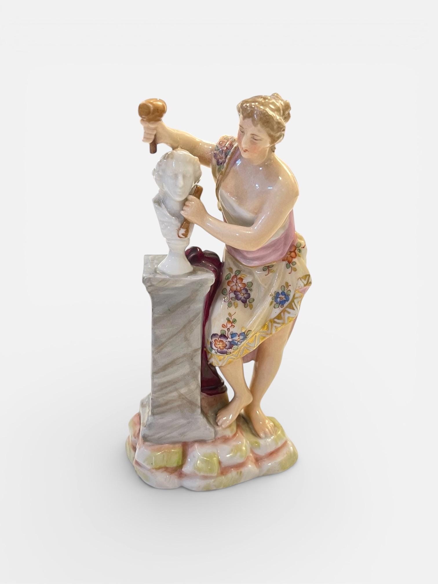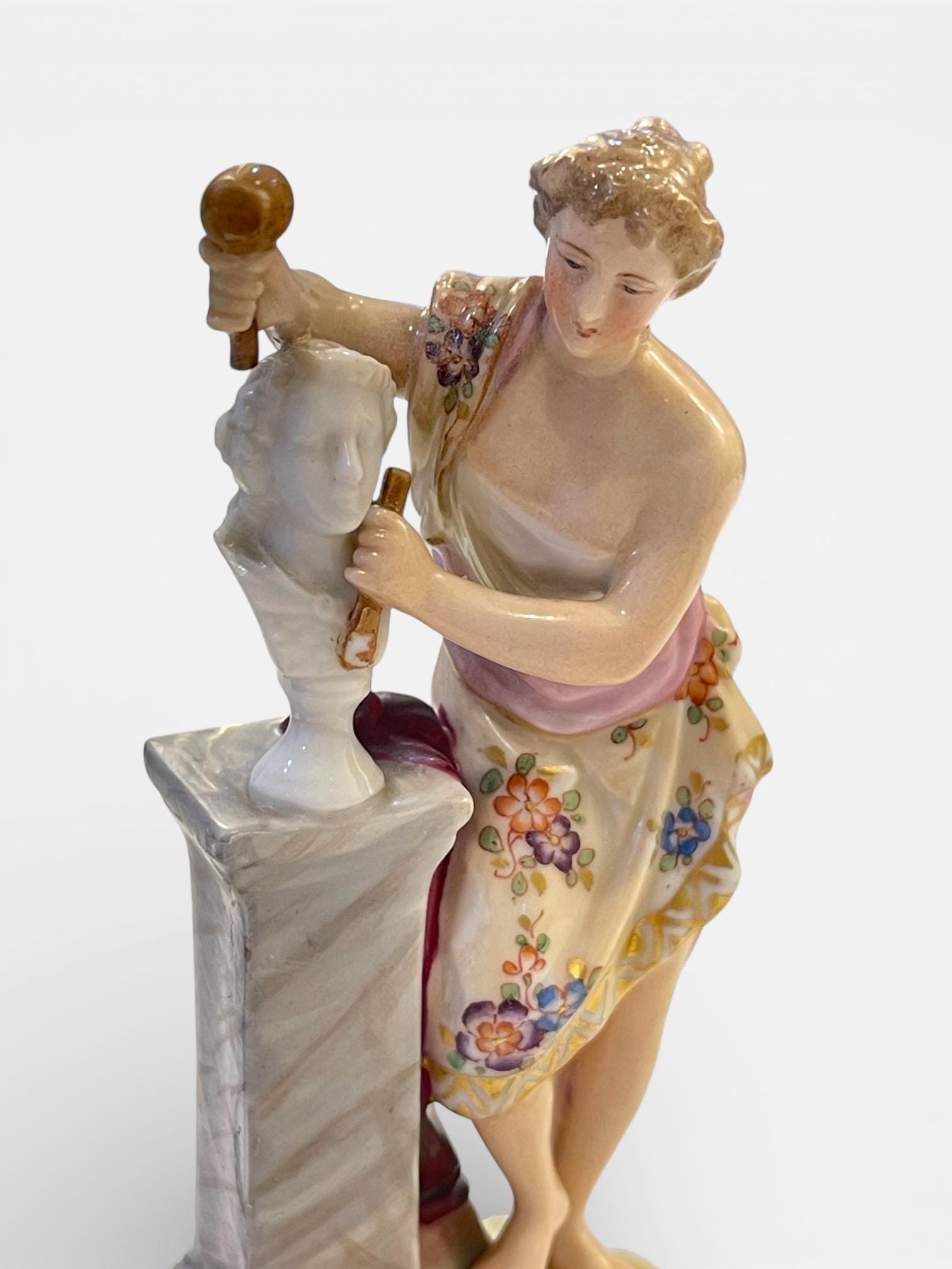 A finely modeled small Volkstedt porcelain statue depicting a classical female sculptor at work, dating to circa 1890s–1910s.