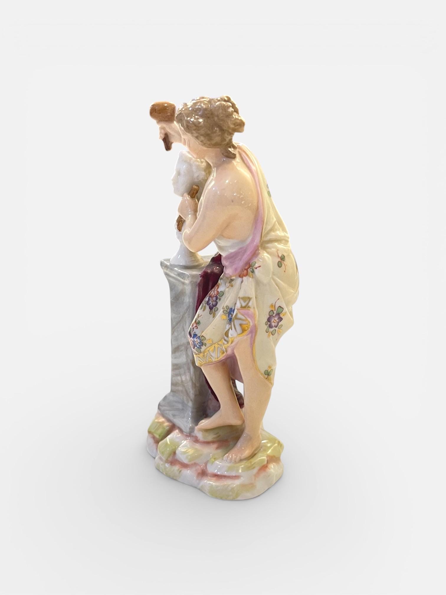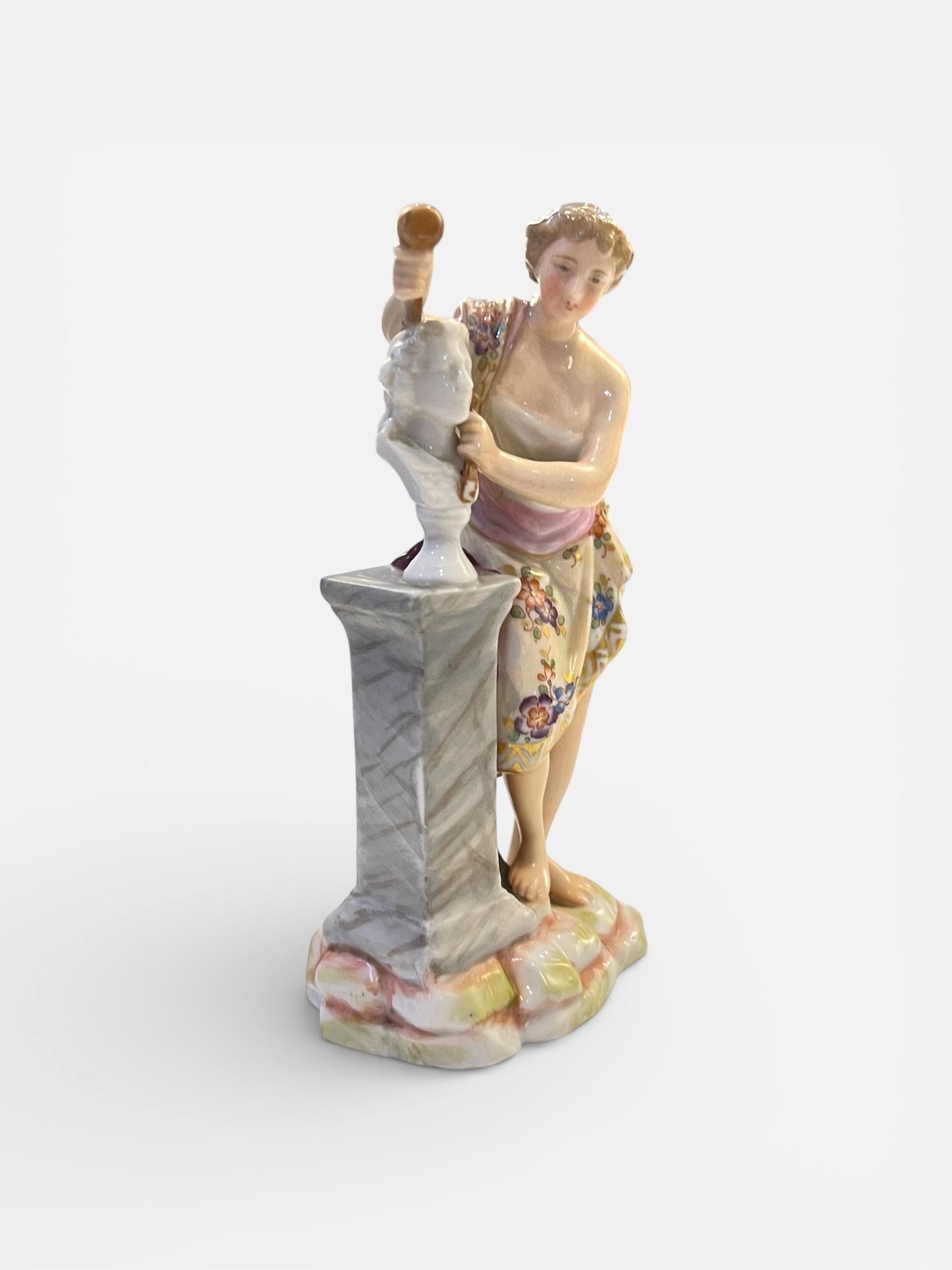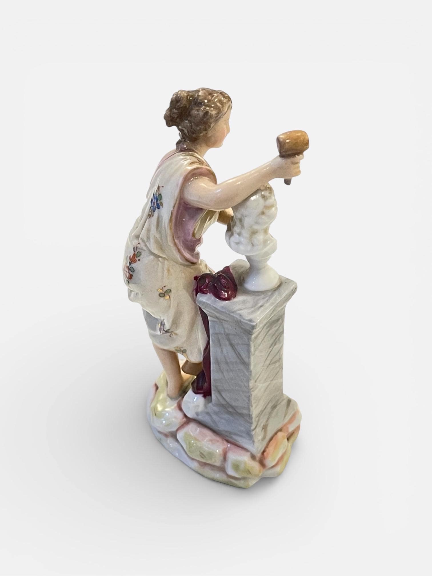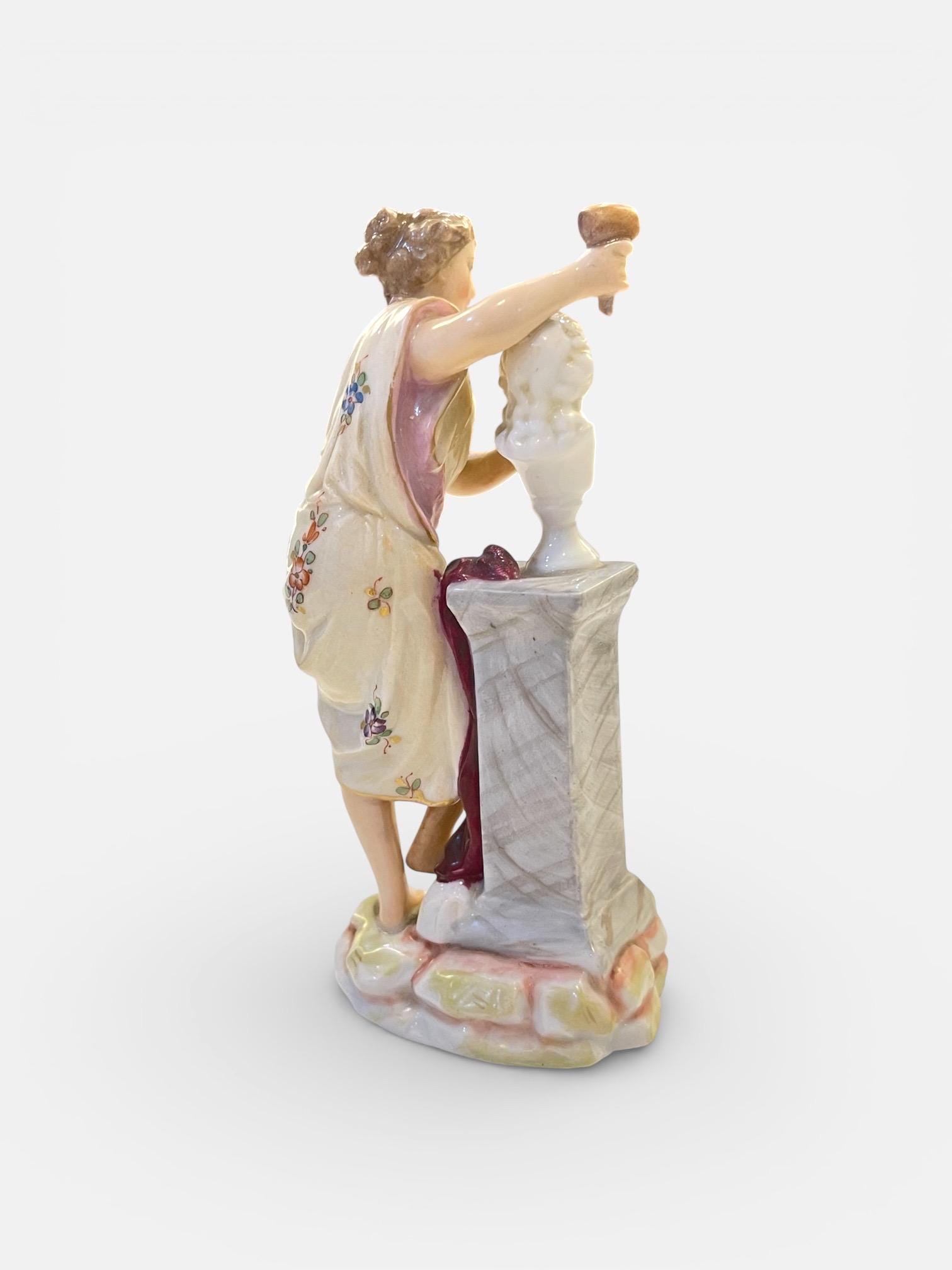 This charming miniature figure portrays a young woman standing beside a marble-effect pedestal, delicately sculpting a classical bust. The composition reflects late 19th century romantic academic taste, combining artistry, craftsmanship, and allegorical elegance.