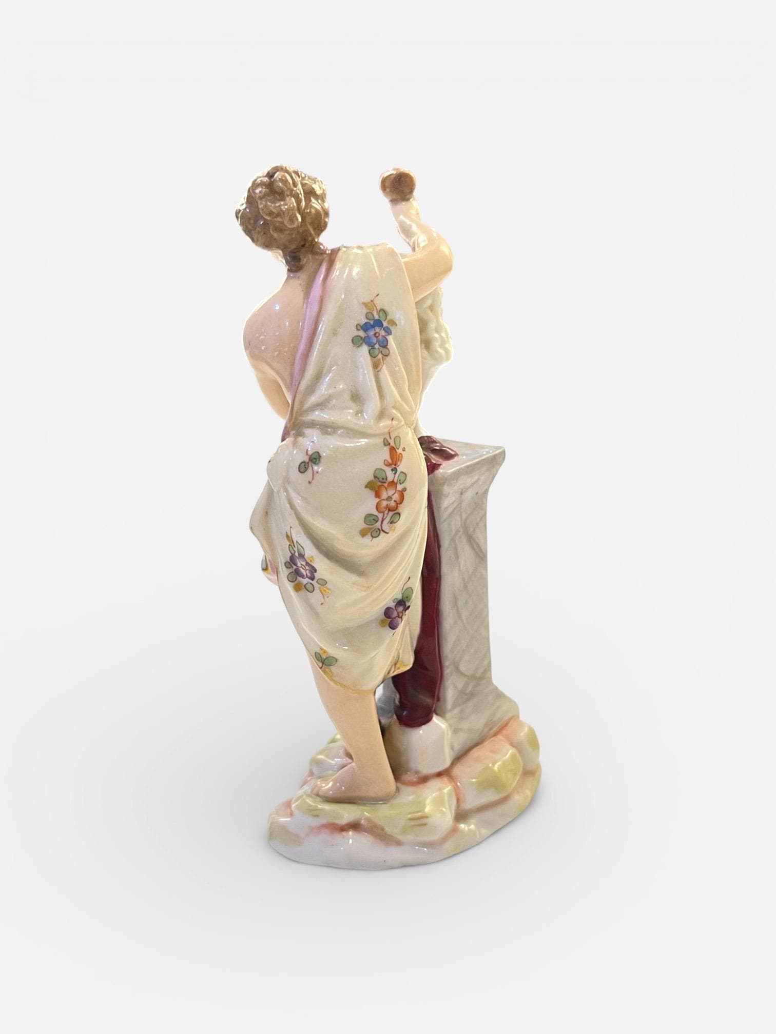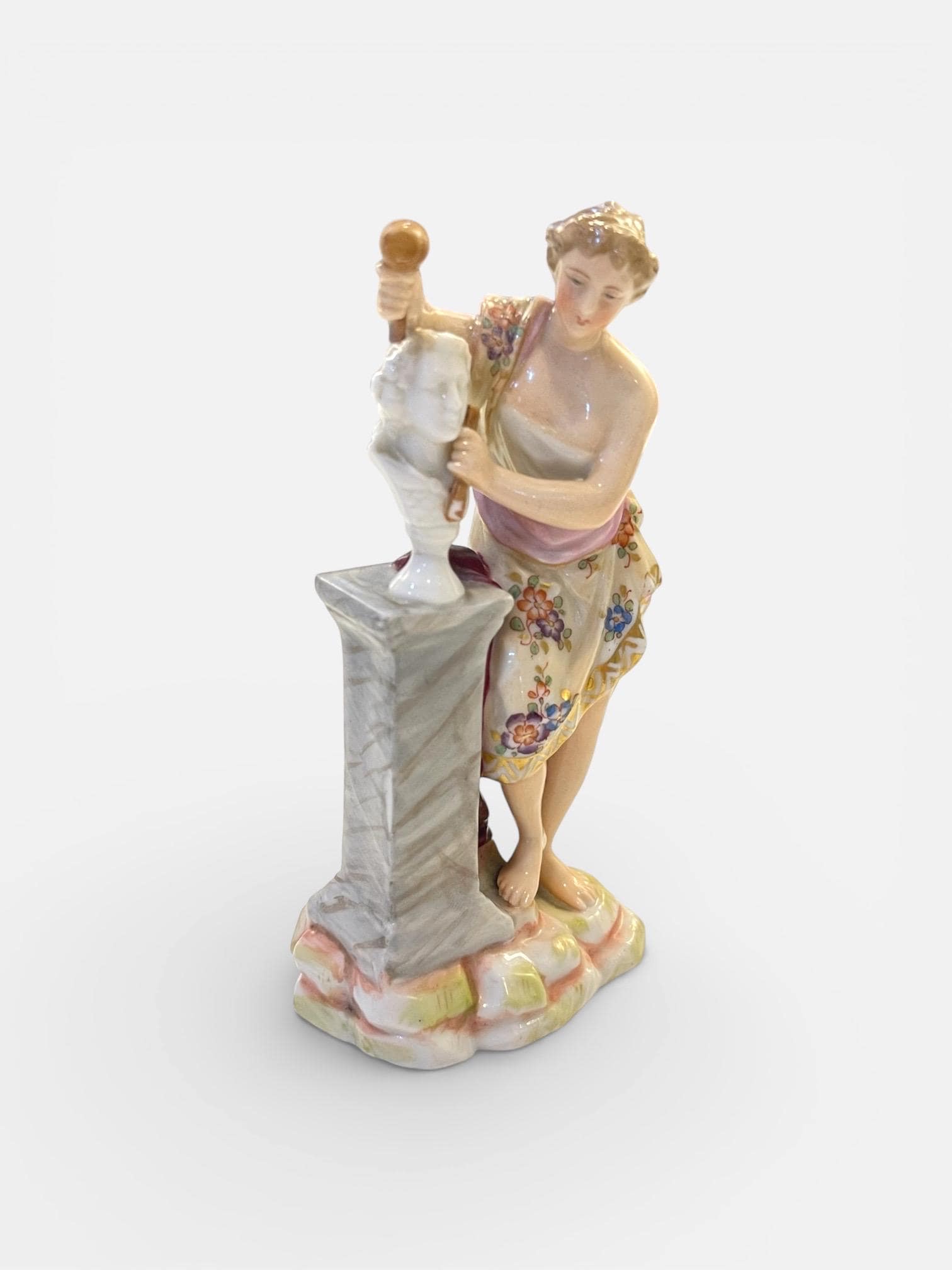 The hand-painted decoration features soft flesh tones, floral detailing on the draped garment, and subtle gilded accents along the hem. The marble-effect column and naturalistic base enhance the sculptural realism of the piece.