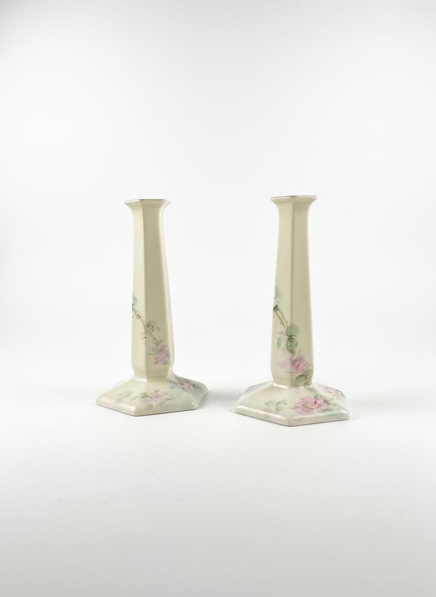 A beautiful and elegant pair of antique porcelain candlesticks produced by Lenox Ceramic Art Co. (Belleek series) in Trenton, New Jersey, dating to circa 1906–1924.