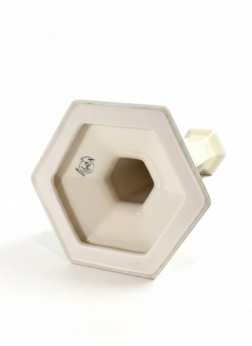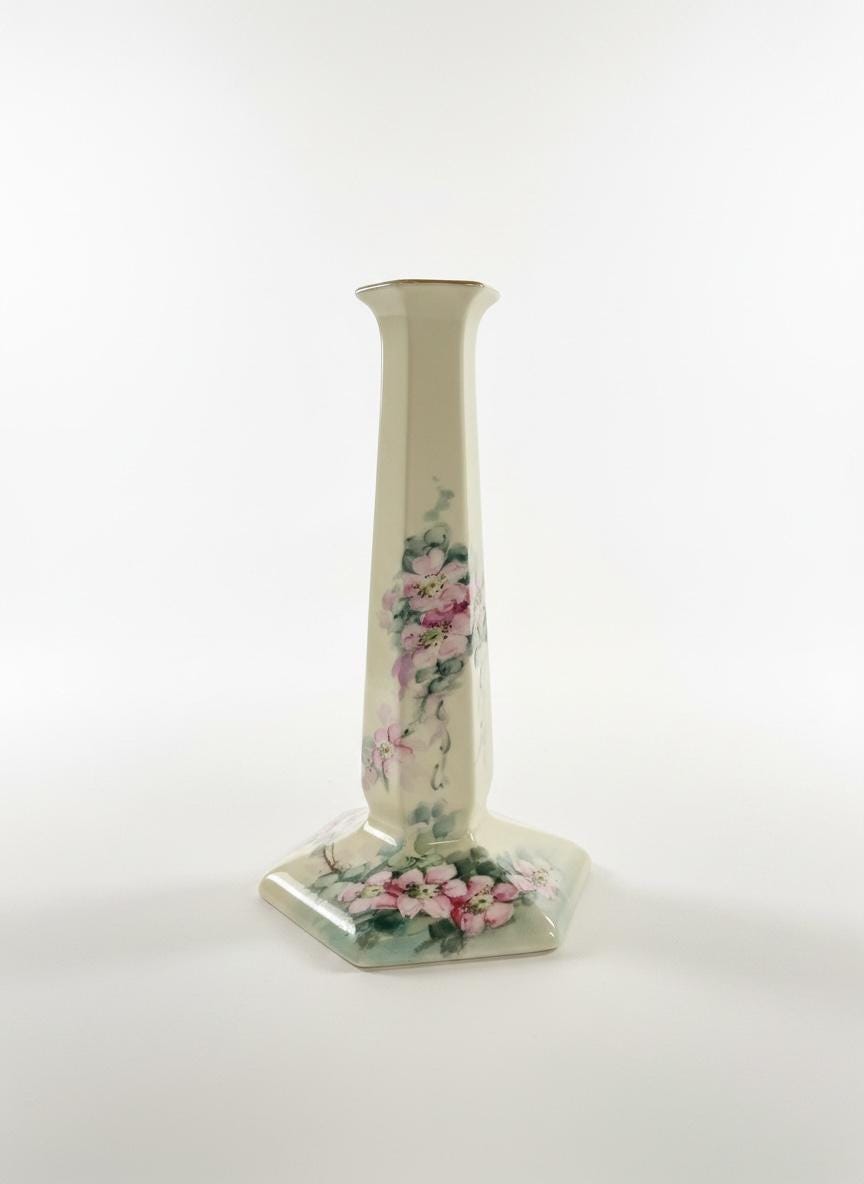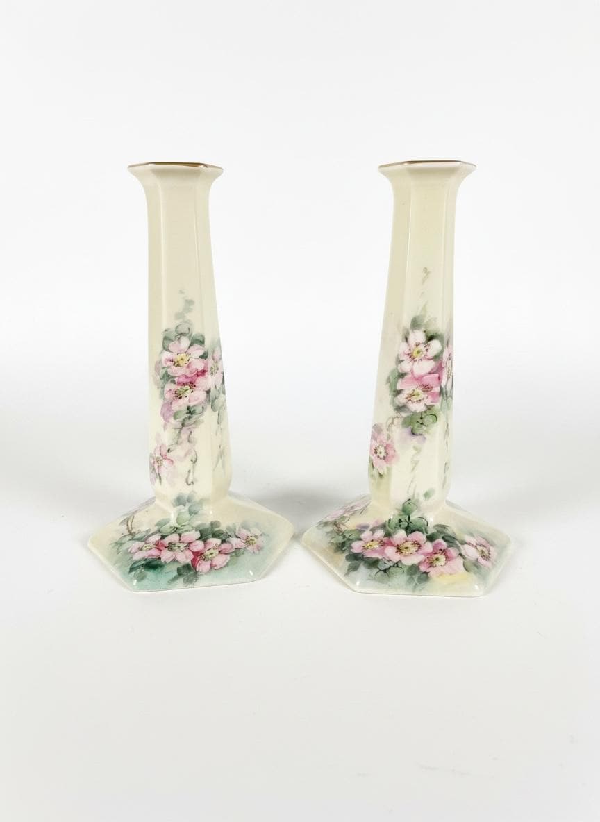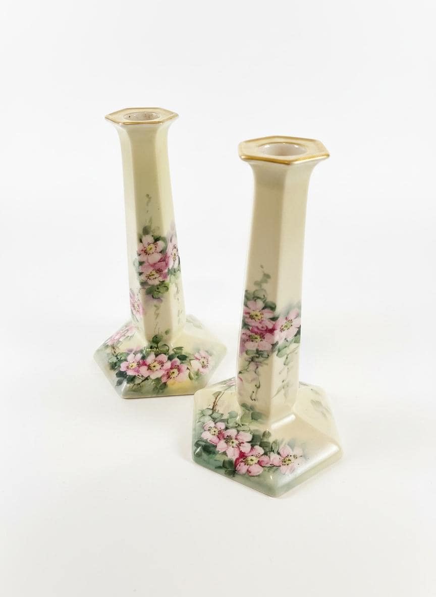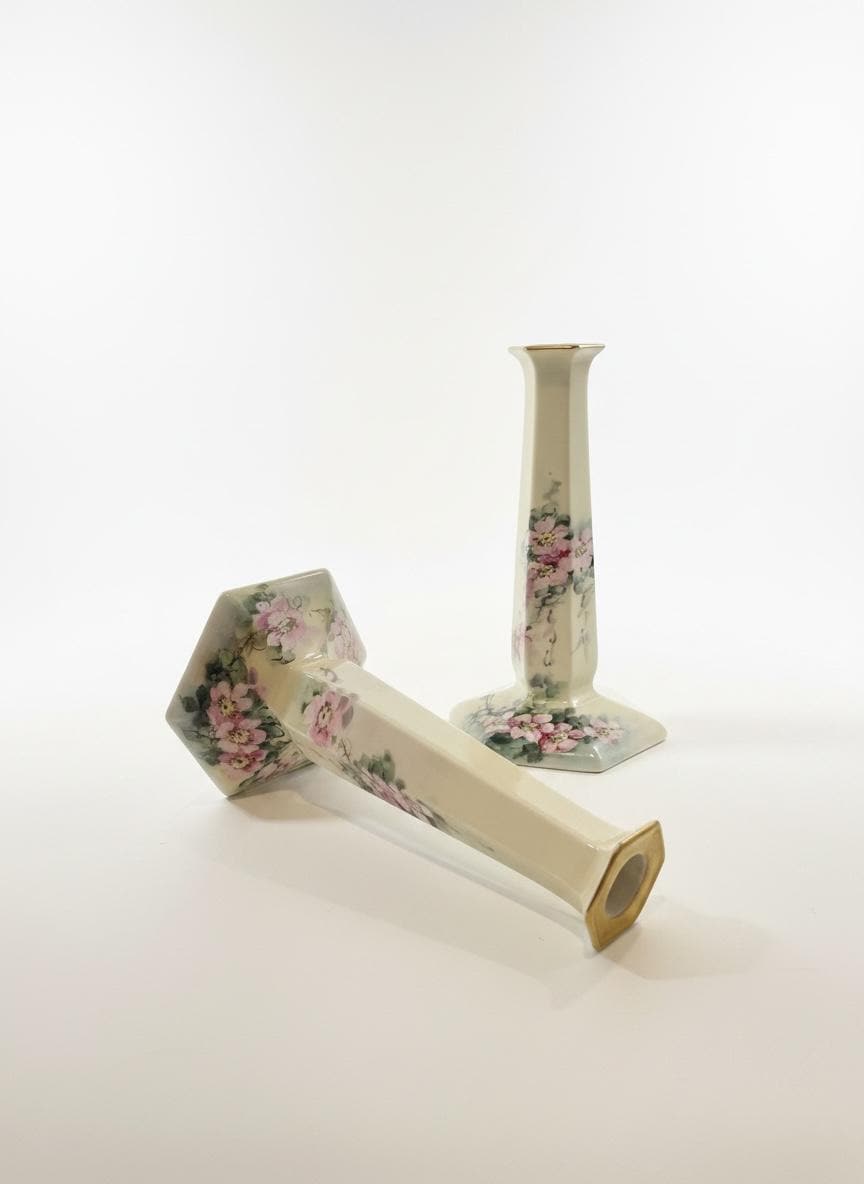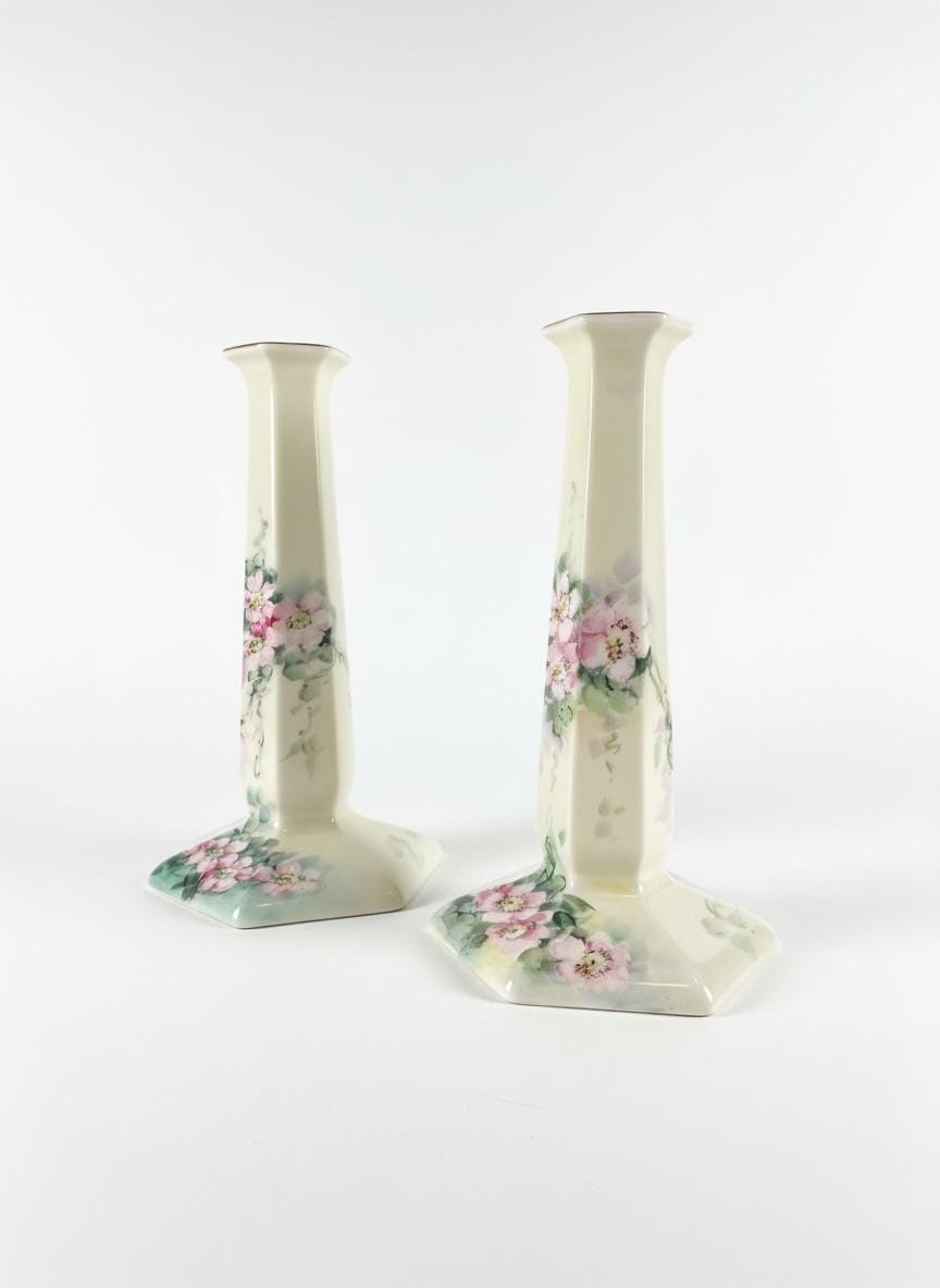 These refined candlesticks feature a delicate ivory-toned body adorned with soft hand-painted floral decorations in pastel pink and green hues. The graceful elongated form and hexagonal base reflect the influence of Art Nouveau aesthetics, combining simplicity with organic elegance.